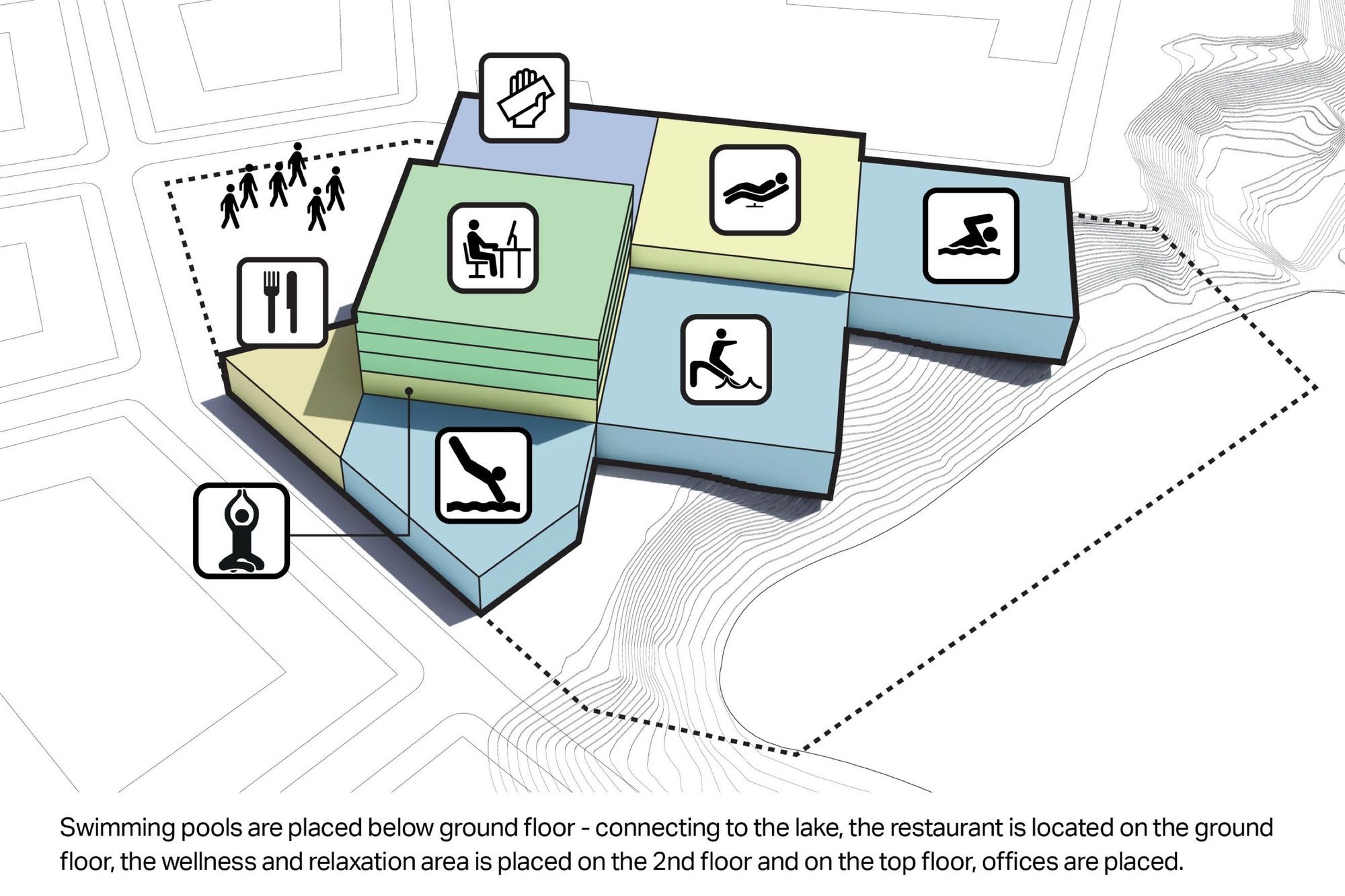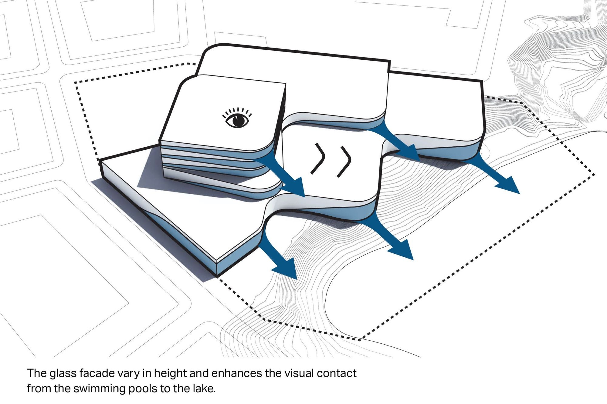 The aquatic center’s 25.5-meter-tower will be housing the offices and it will be the highest part of the building. It will be located on the north-eastern corner so as not to shadow the front entrance plaza which will be adjoined by restaurants. Following the plaza, there is a double-height lobby which leads to different activity zones and functions, including four different pools.