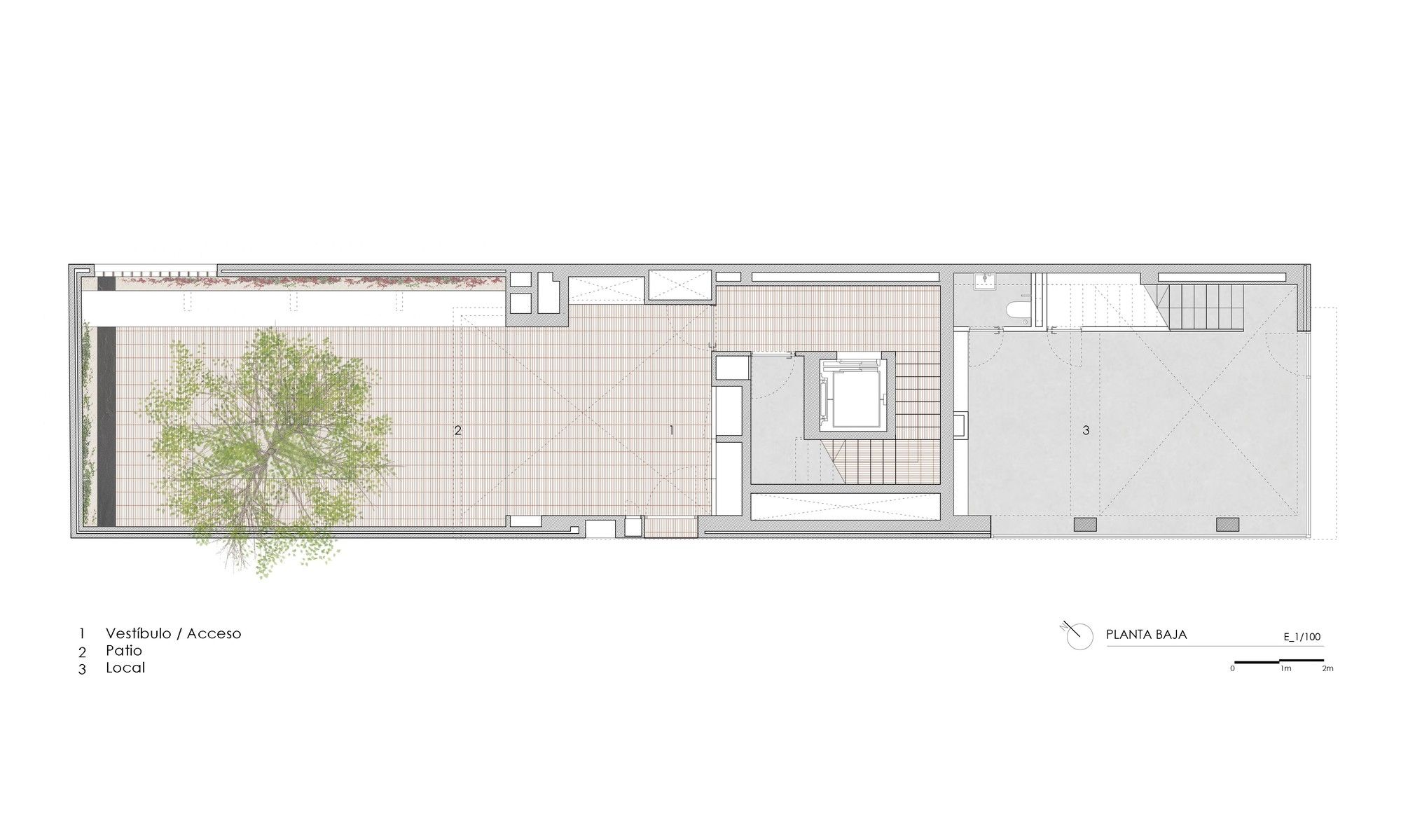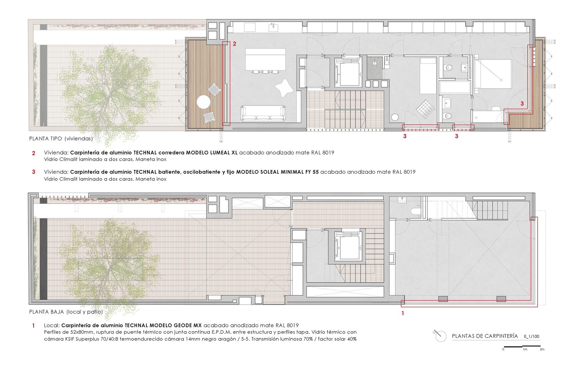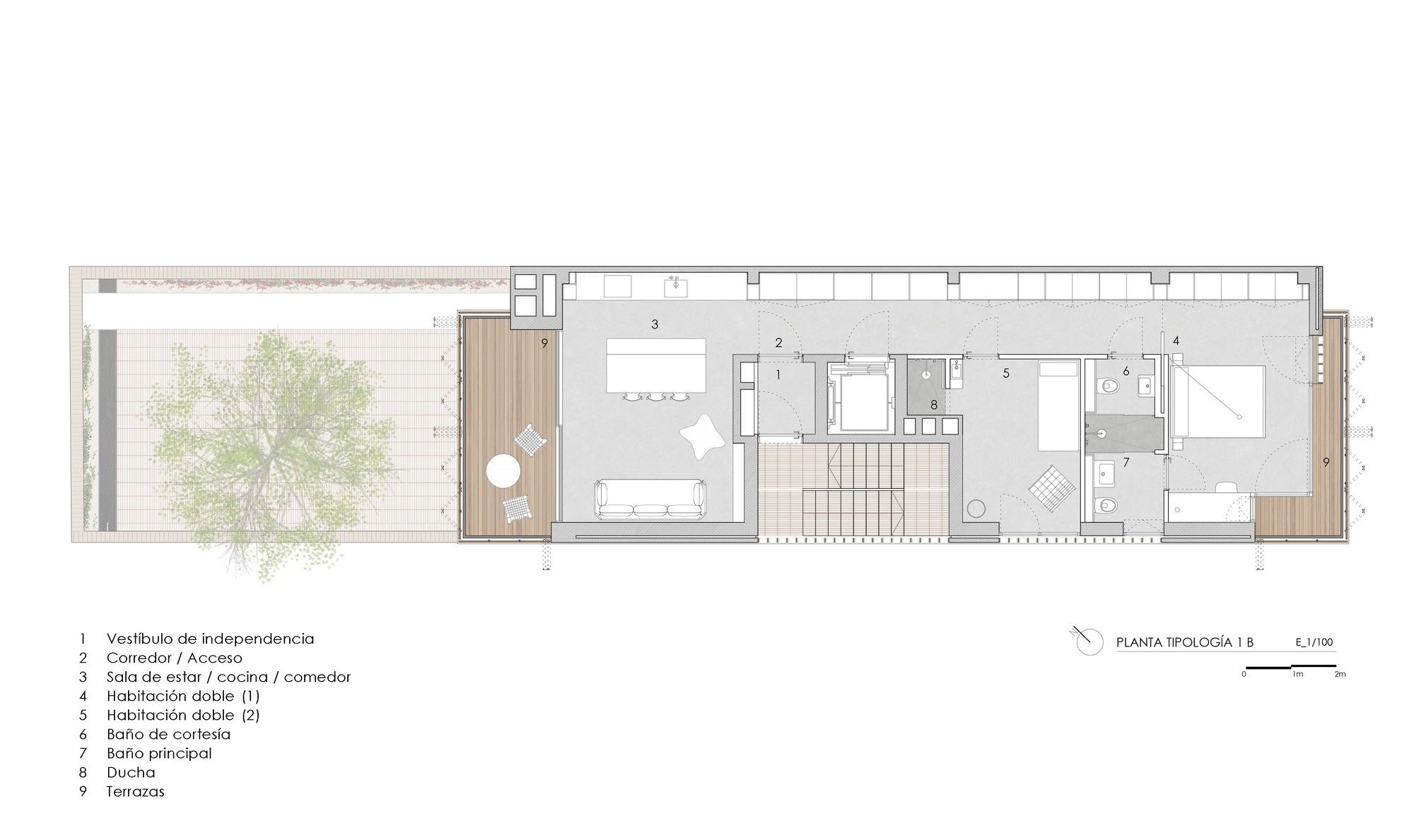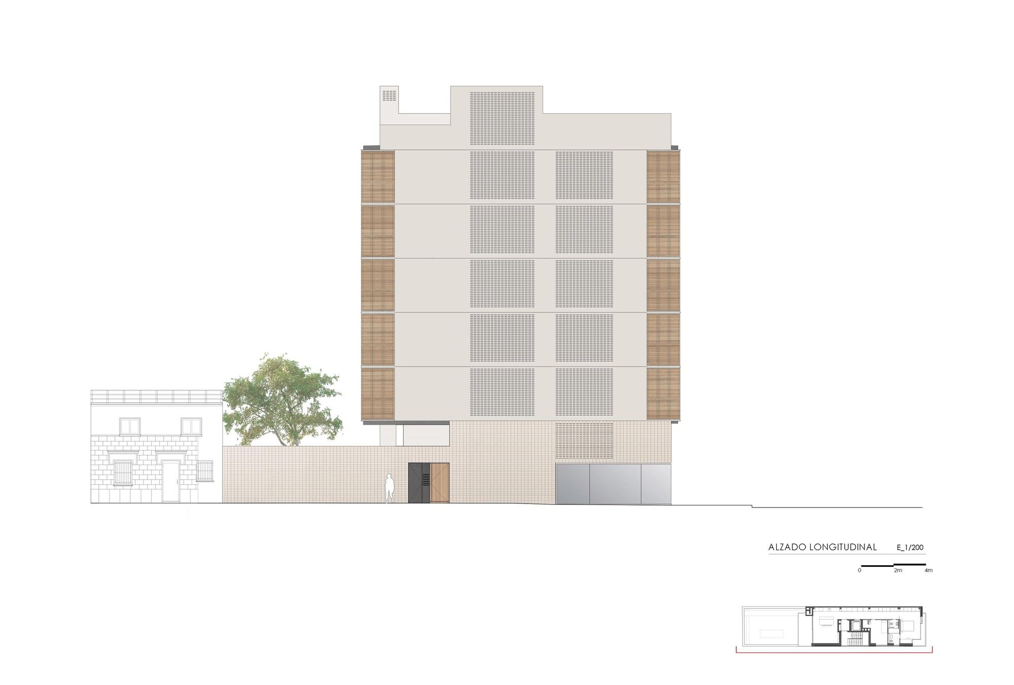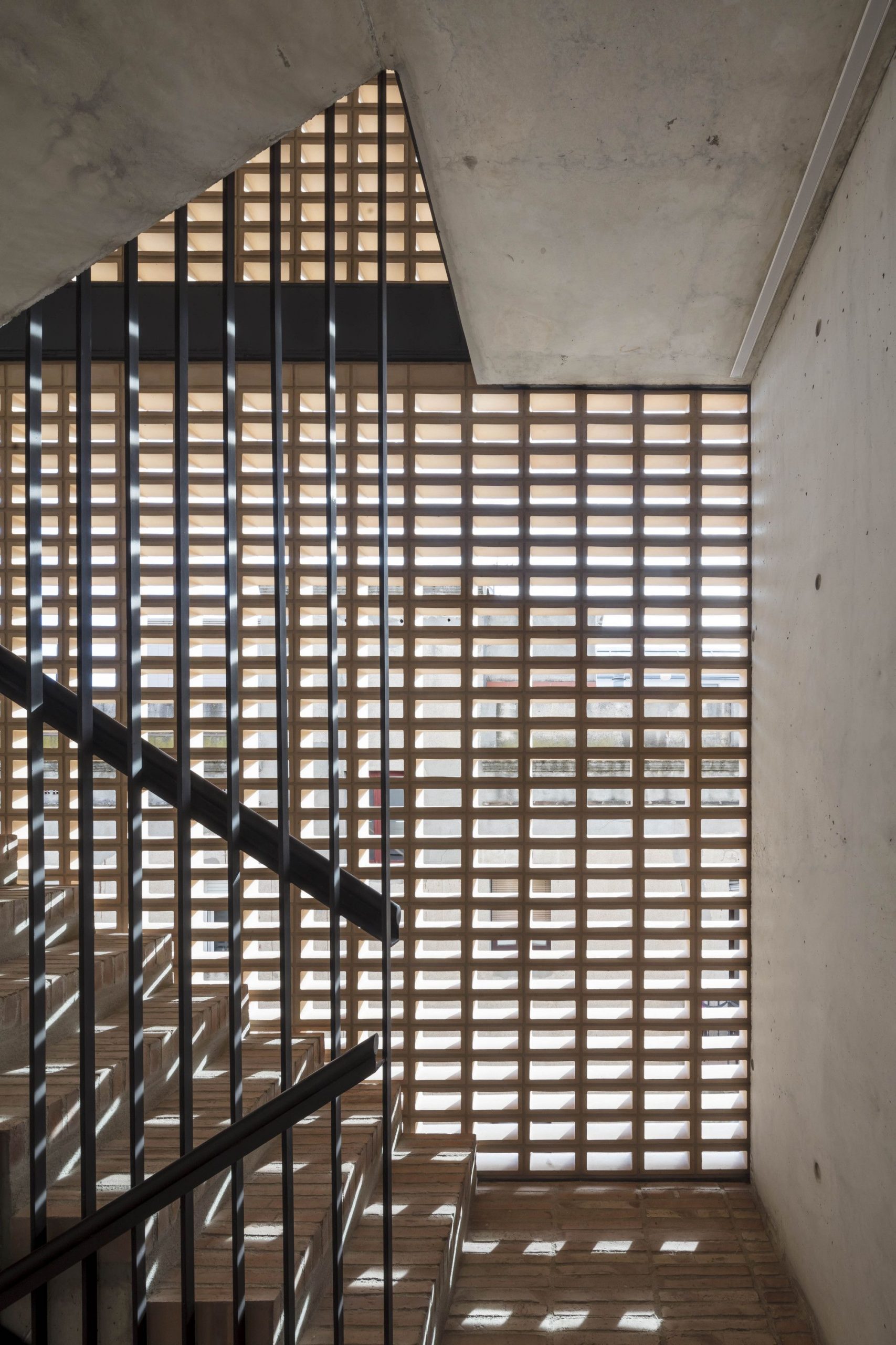 The longitudinal façade, which incorporates the common staircase, is implemented with a rectangular ceramic latticework that allows natural and constant ventilation and lighting while generating different shades of natural light in the access area.