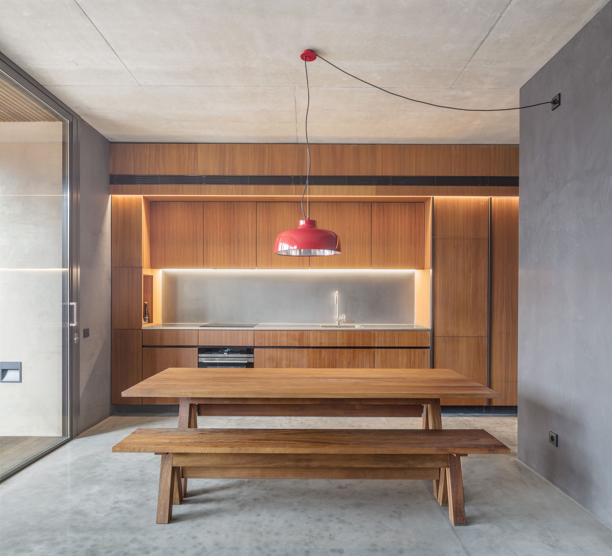 The design of the interior spaces seeks a formal balance and a good dialogue between the different materials. The use of raw materials such as in-situ concrete, floors with hard-concrete, untreated wooden fittings and anthracite-colored lime plaster create a sensual, haptic and relaxed living atmosphere.