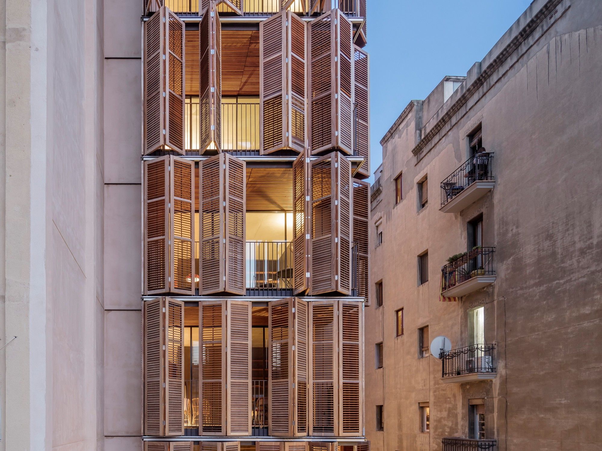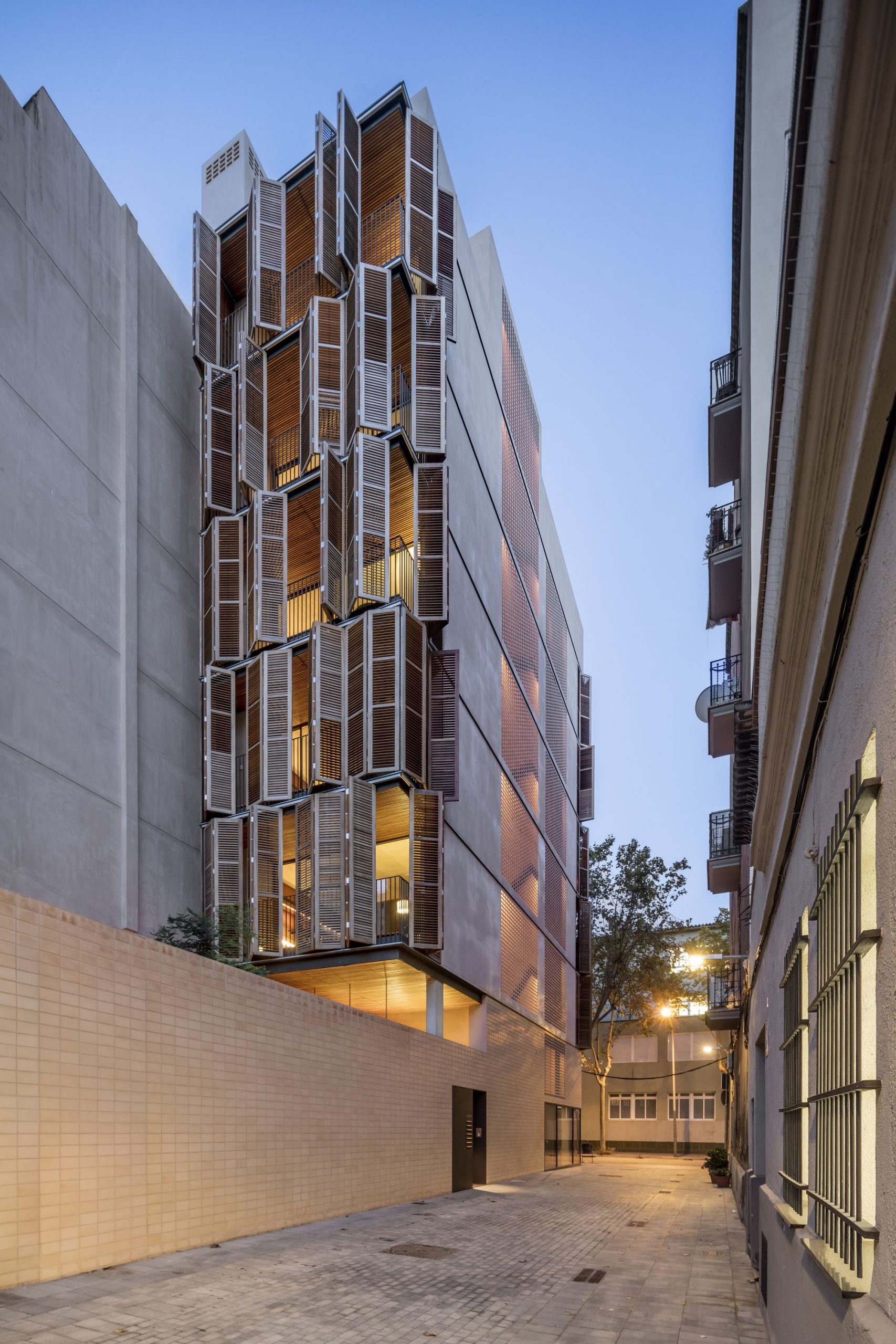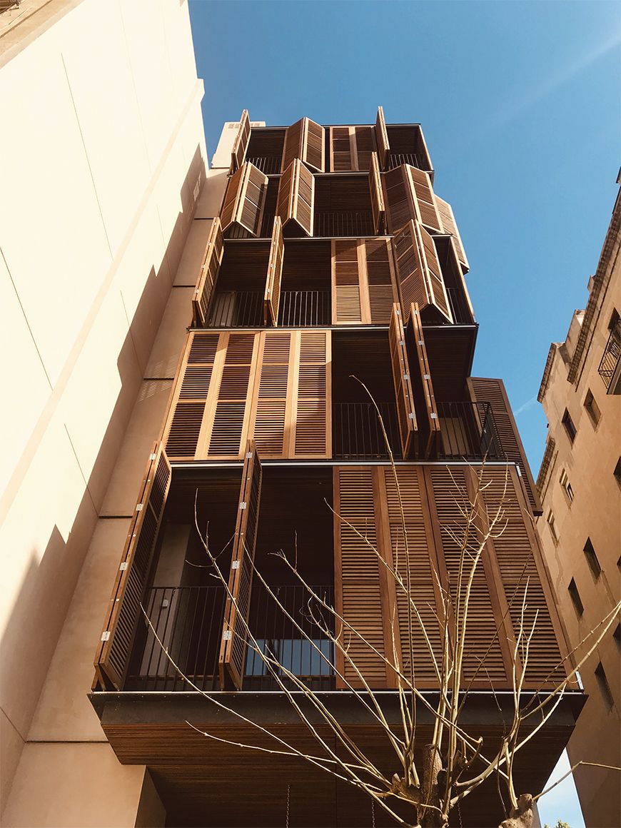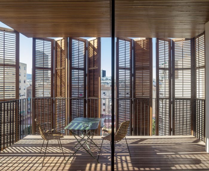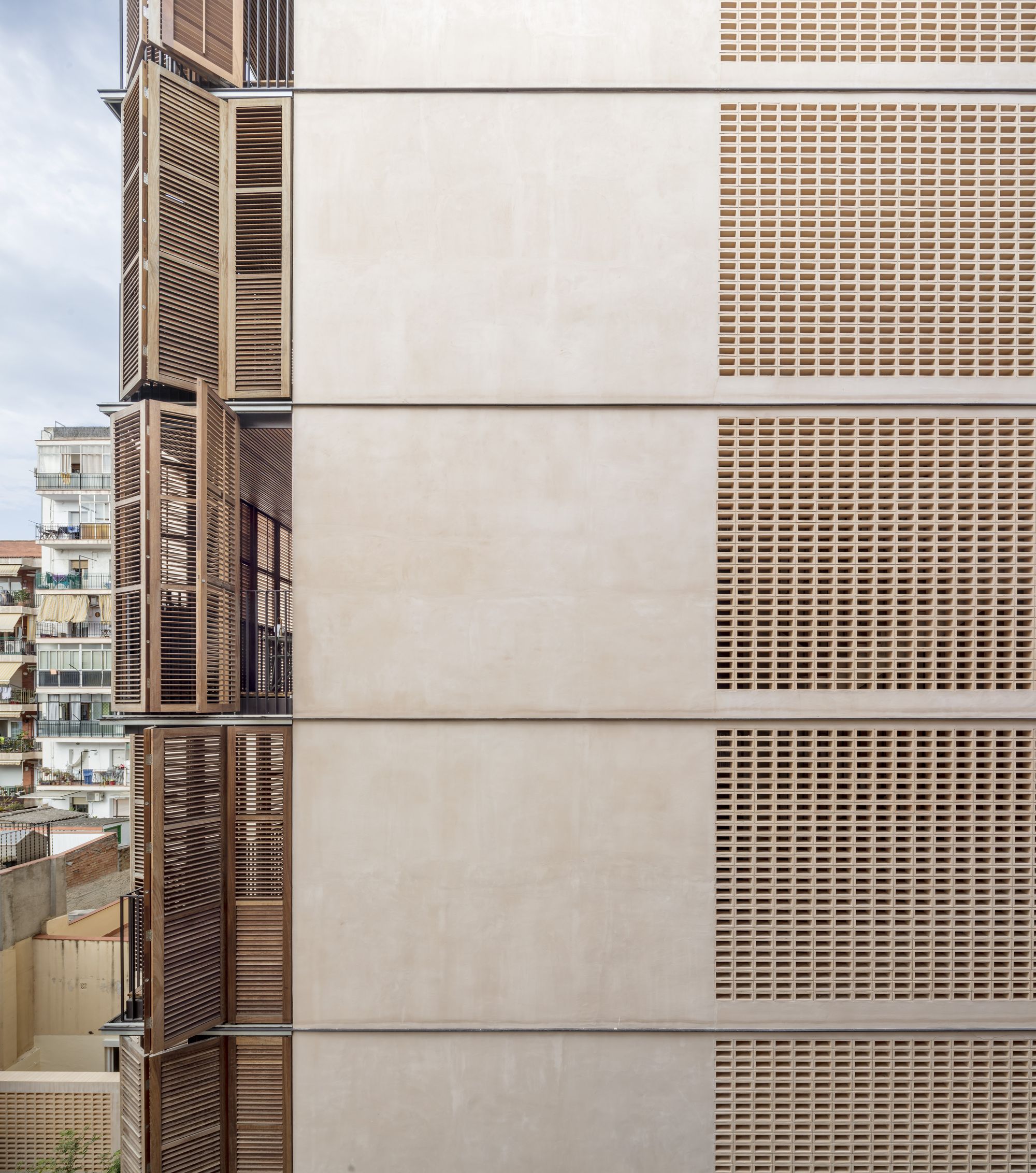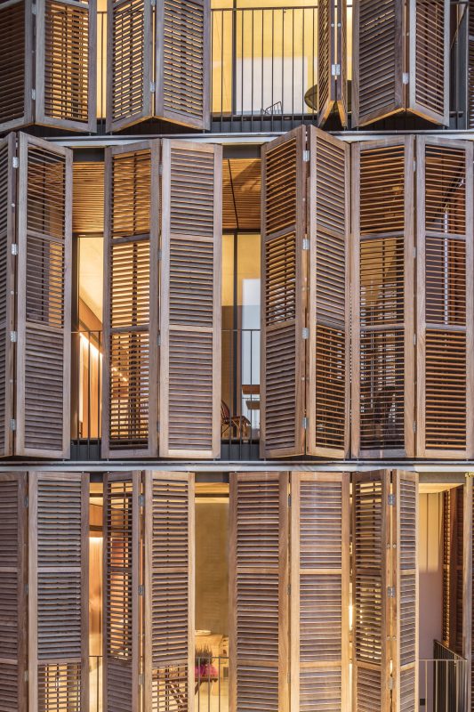 The system of adaptable wooden blinds, inspired by the traditional sliding shutters of the city, allows to shift sunlight on the terraces and improve the thermal comfort of the homes while generating a dynamic play on the facades of the building.