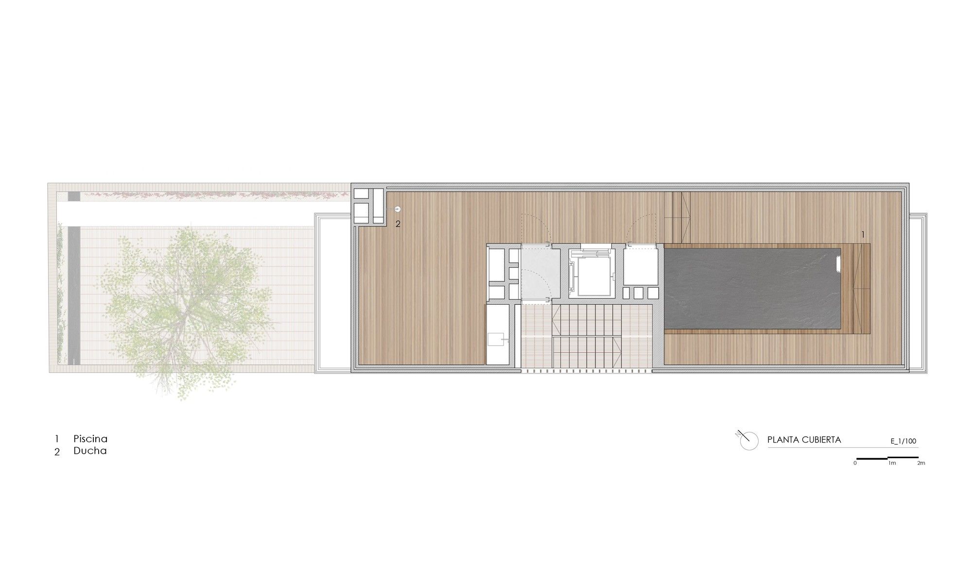 Together with the local architect Lola Domènech they were able to build a house that fits their own needs, each party occupying one floor in a common living arrangement. The commercial space on the ground floor is used as an architect’s office. The apartments of about 80 m2 have two terraces, one on the courtyard–façade and one on the street-façade. They guarantee cross ventilation and make up the faces of the facades.