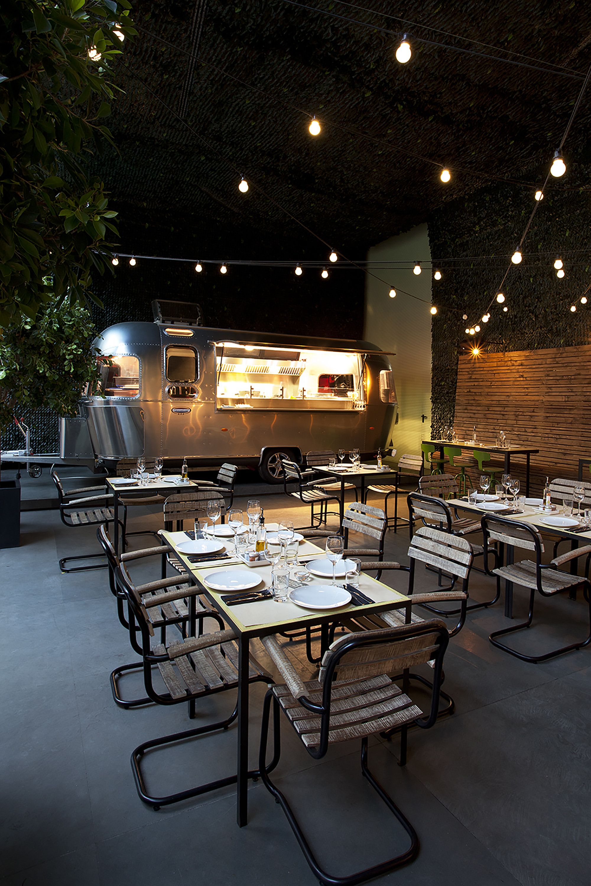 Under the shade of trees and umbrellas, guests can meander through the garden, sitting on picnic tables, bar stools, lounge chairs or decks. The light and casual atmosphere of the garden is transferred to the restaurant’s 240sm interior spaces. The main double height space features an airstream with a fully equipped kitchen in which seasonal, organic, locally sourced meals are prepared by the chefs.