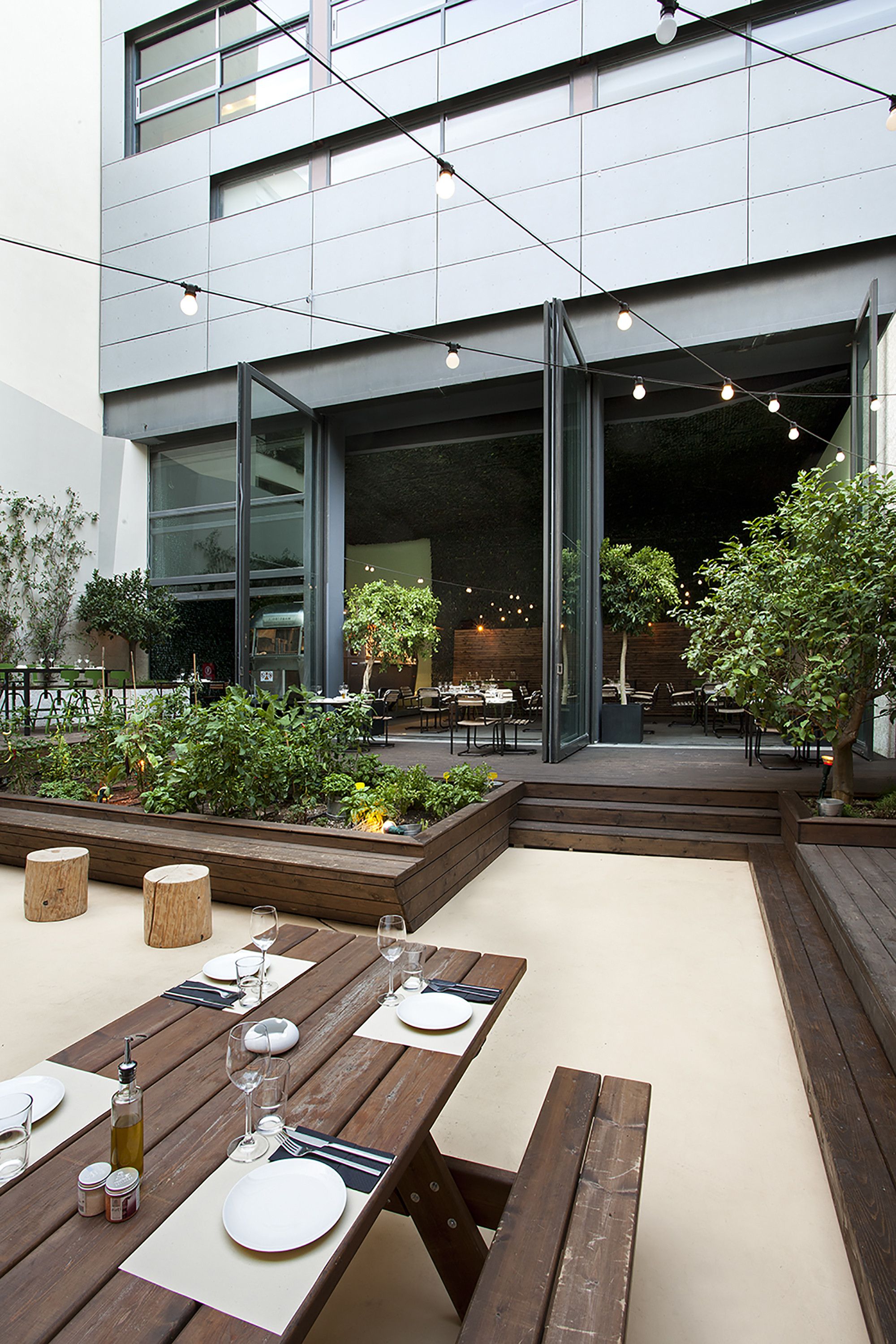 48 Urban Garden Located on the ground floor Ileana Tounta Contemporary Art Center, 48 Urban Garden opens onto a 190sm bright lush garden featuring a sculptural wooden landscape composed of multilevel seating areas, bar tops, planter boxes and garden beds that produce vegetables, fruit and herbs.