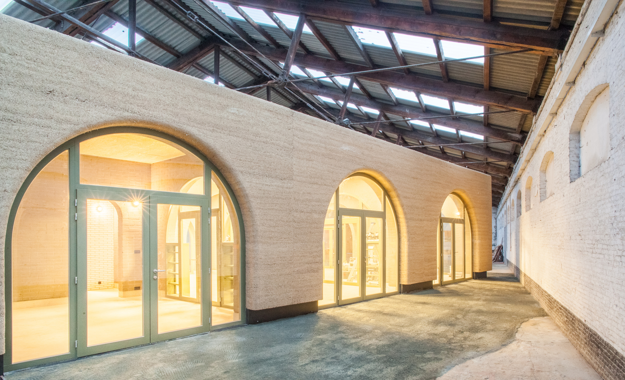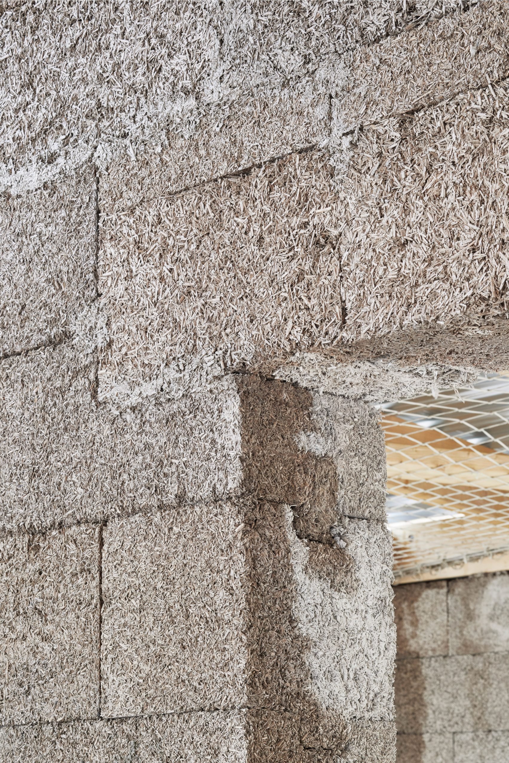 The hempcrete is used to insulate the facades and the roof and is left untreated to maintain its breathability, making the building CO2-negative. Even the construction techniques of The Regional House were sustainable; 19000 compressed earth blocks were produced in a 3-week workshop, and 213 square meters of hempcrete were installed in a 2-week workshop by more than 150 volunteers.