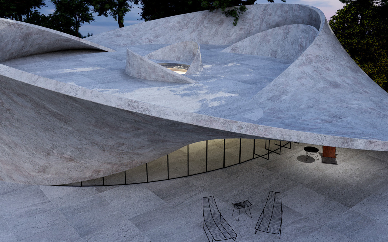 This house, designed by Antony Gibbons Design is inspired by the Möbius strip and is entirely made out of hempcrete blocks reinforced with concrete, which expresses the house’s connection with nature. The structural design and material choices are an innovative response to the challenges imposed by both mathematics and architecture. The entire house contacts the floor only through few meters, while the roof rigidifies the entire frame of the building. The interior is daylit through the floor-to0ceiling windows facing the swimming pool.