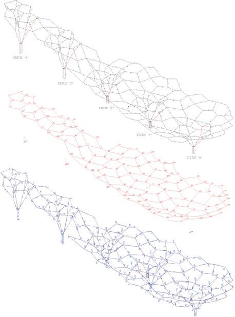 The tensile structure is composed of elements in a tension state, instead of a compression state. A simple example of a tensile structure is camping tents. The tent becomes upright and stable when all of its components, fabric, poles, and ropes, are in perfect tension. Large-scale tensile structures apply the same concept but with more advanced and treated components to take on the massive loads and varying environmental conditions.