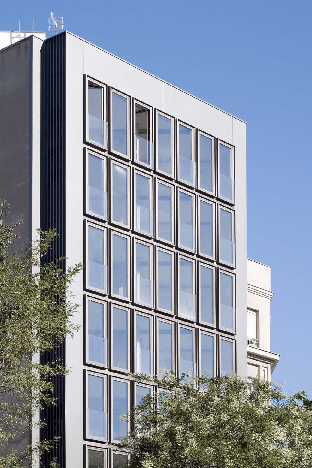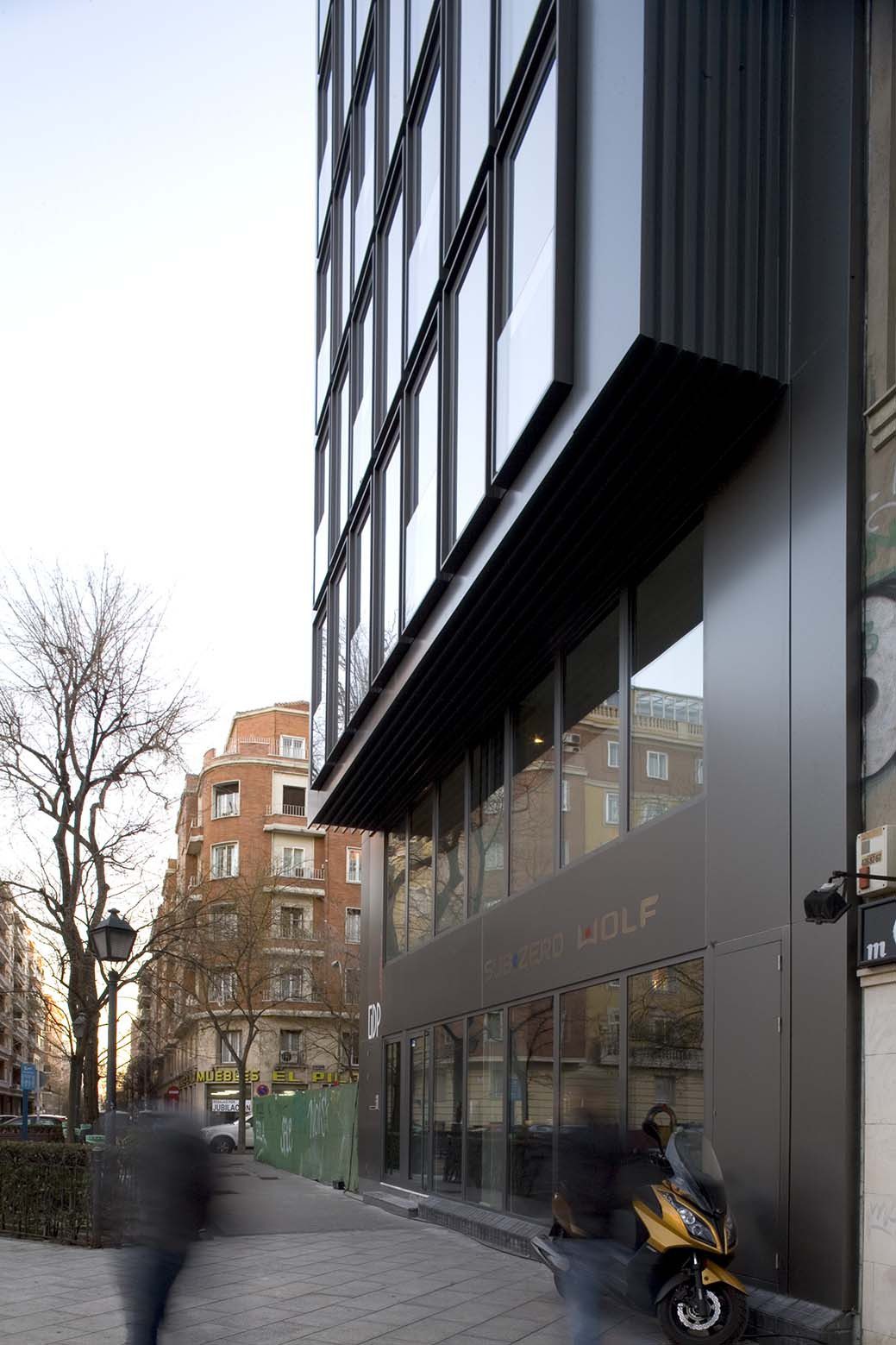 There are seven micro spaces for young people, configurable in studies with 1 or 2 bedrooms-offices. The 8 floors of the building have a perfect triangular plan, 76 m2 per floor, with natural light on one side and blind dividing walls (due to urban planning, buildings next to it will never match him in height) in the other two sides. The facade, which functions as a light collector with its funnel-shaped plan, has been completely replaced by intensifying the character of tertiary use the building had, intensified by its proportions and height dominating its immediate surroundings.