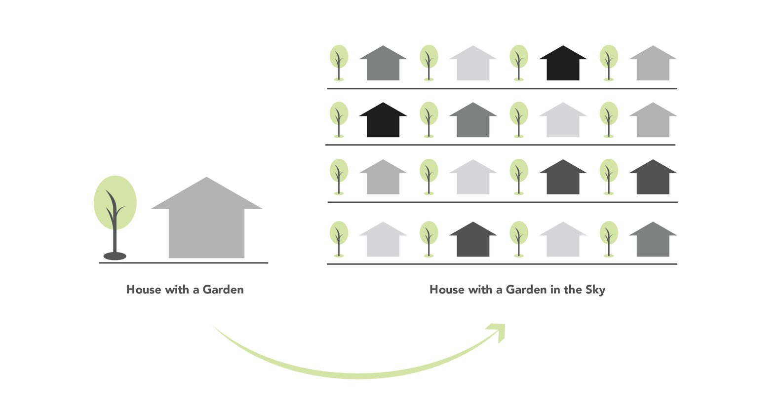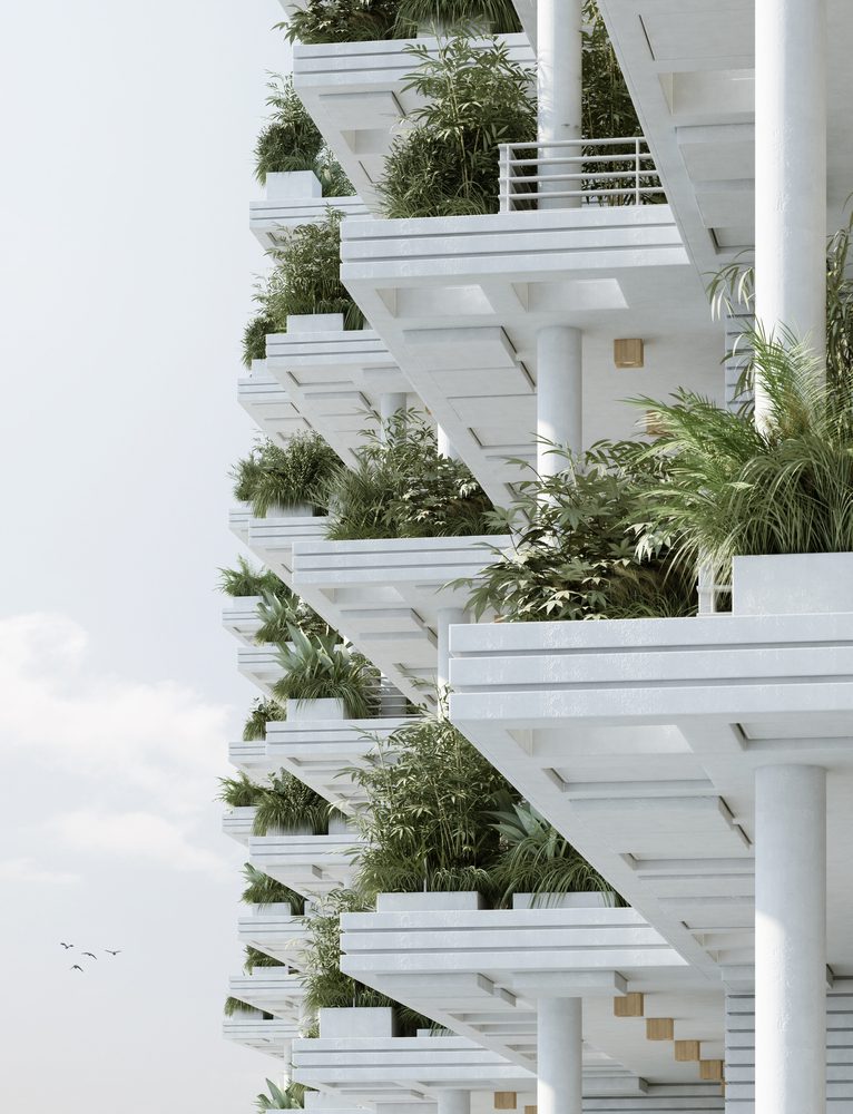 A grey water supply system collects rainwater on the roof and reuses it for watering the plants on the balconies. Air-purifying Plants will use the grid on the facade to grow along and, after some time, nature will be the main design-language and the architectural design takes second. The facades serves as an interface between the outside and the inside, and the natural elements provide better control over the building’s indoor climate. An open hallways supports a constant airflow through the building and offers a natural ventilation for all the apartments, which reduces the amount of AC’s used in the compound. The true meaning of an ecological development. A breathing tower. An individual house in the sky, with a garden and a view.