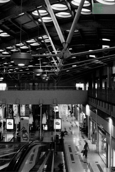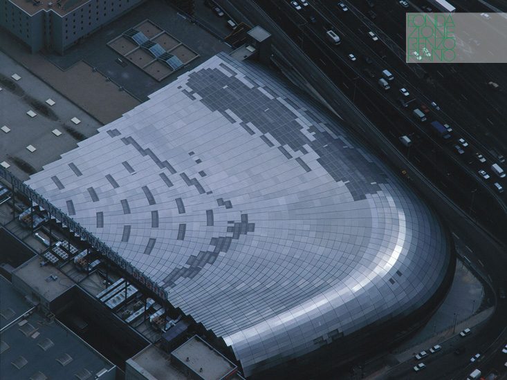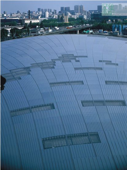 The shape of this shopping centre was determined by its topography: a series of immediately adjacent motorway junctions carve out a space into which a curved, silver form has been fitted.The building’s highly visible 2,000 sq m roof is covered with 27,000 modular shiny steel panels of sophisticated geometry allowing for a maximum standardization of components. Apart from its aesthetic impact, the metal plays an important role in insulating the structure by deflecting sunlight away and creating a shaded, ventilated roof, beneath which a chamber of air slows down heat exchange with the outside.