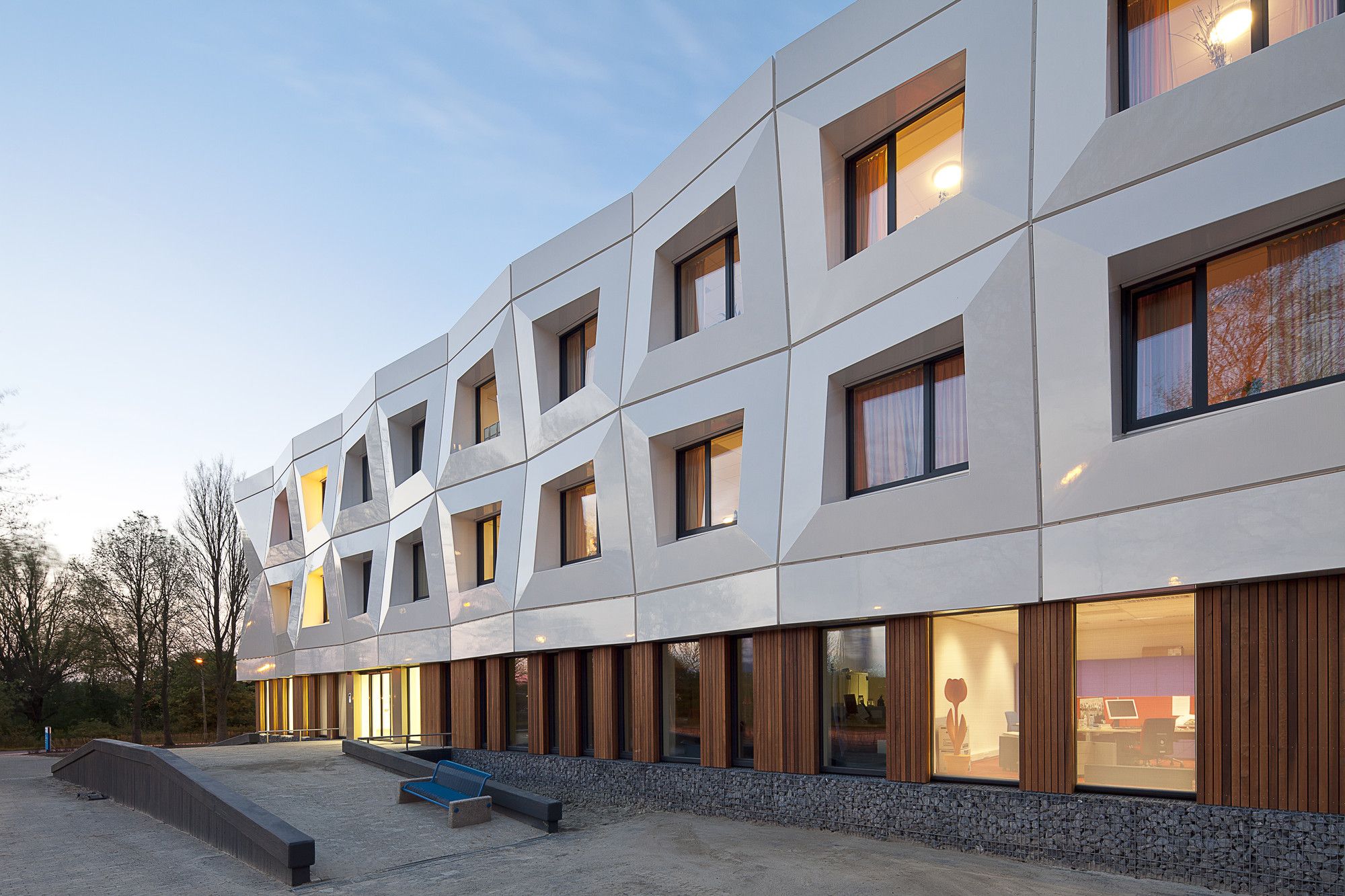 The Veilige Veste, meaning ‘Safe Fortress’ is a refuge for victims of human trafficking, or contemporary slavery. It is located in Leeuwarden, Friesland. Designed by the Dutch firm KAW, it is a refurbishing of a structure which began its life as a police station. The new faceted exterior acts as both a sheltering screen and as a means for further expansion. Beatrice Montesano of KAW states that unlike refuges ‘tucked away in anonymous back alleys,’ the facade of the Veilige Veste has ‘a subtle gleam that interacts with its environment.’