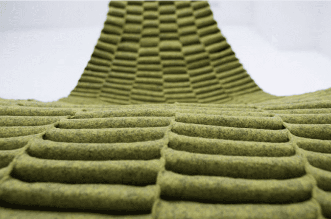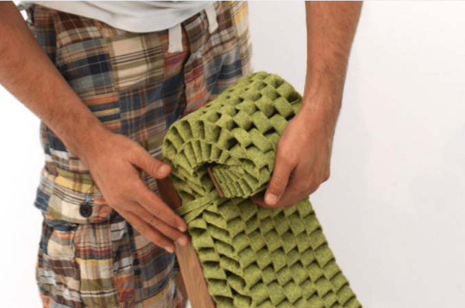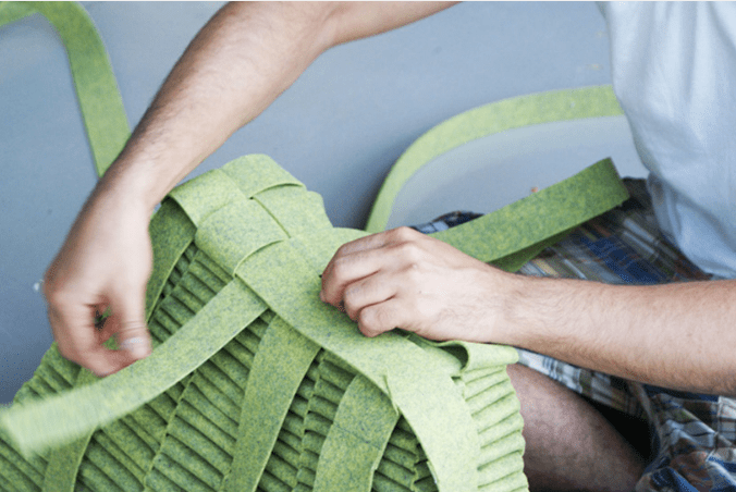 The cushioning is made from a non-peeling, water resistant felt, which is weaved like straws using a repetitive process, similar to that which is often found in nature. This aids in the transformation of the two-dimensional process into a three-dimensional form.