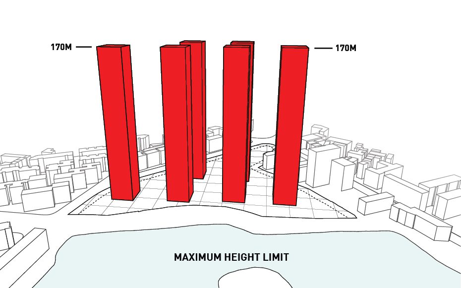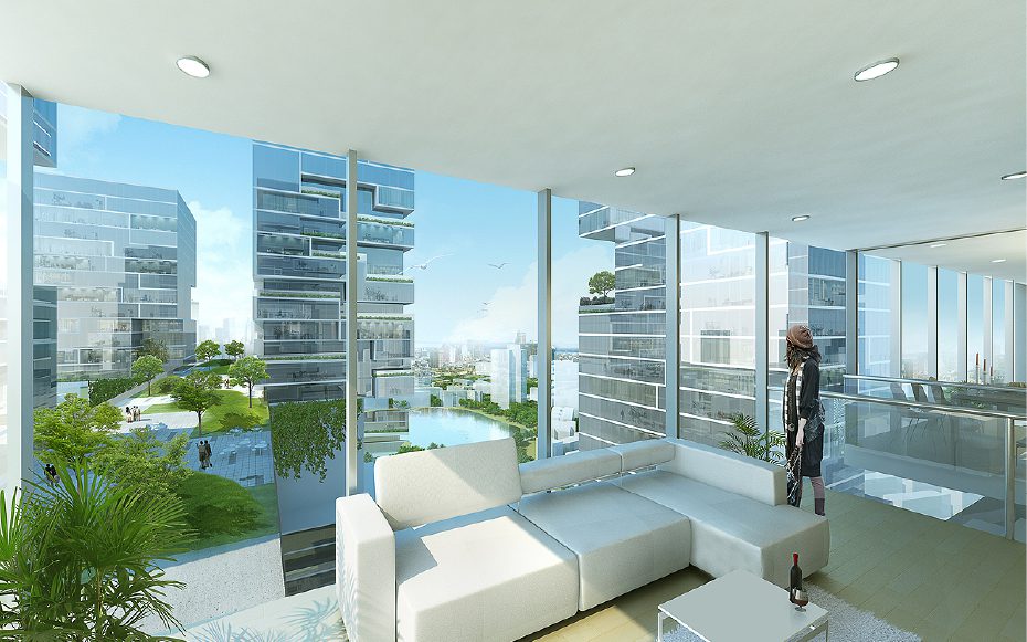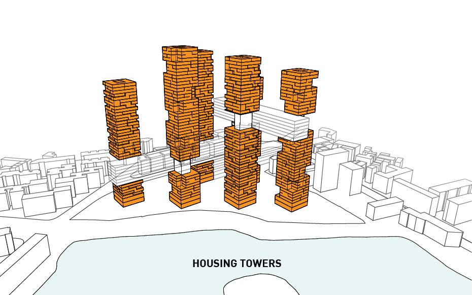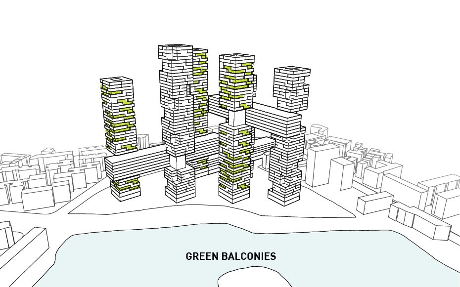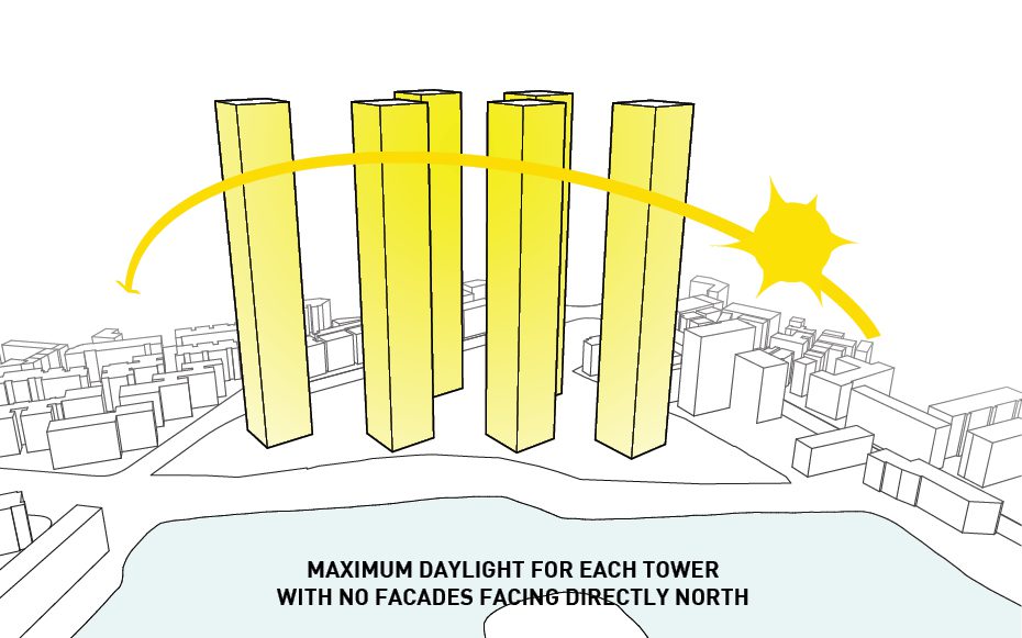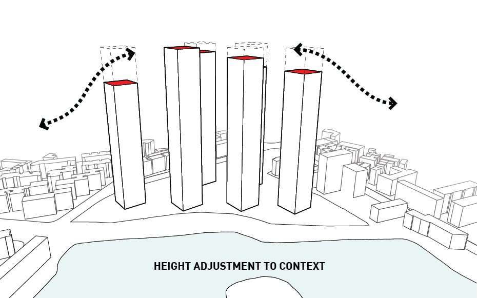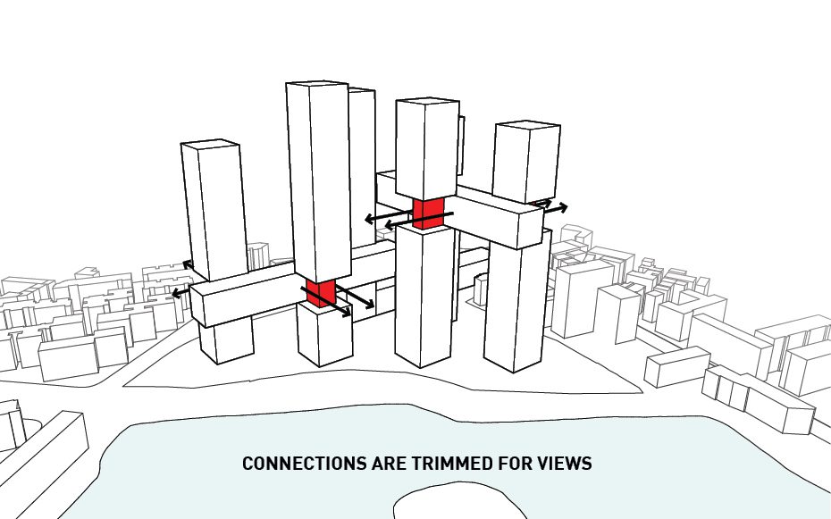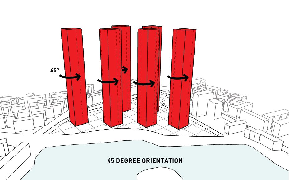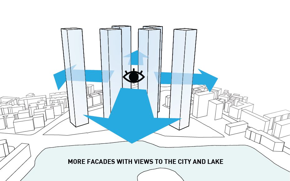 The design was conceived after thorough analysis of the existing site and landscape as well as study of the environmental crisis that is happening in China currently. Wuhan is equidistant from Beijing, Shanghai, and Hong Kong making it a popular destination for locals and tourists alike. As mentioned before, the site for the project is located along one of Wuhan’s many waterfronts making it an ideal spot to insert a statement piece visible from all parts of the city. Six towers are erected along a 25 meter x 25 meter grid and house all the residential programs and each is turned to that the corner is perpendicular to the lakefront maximizing the amount of views offered to each room.