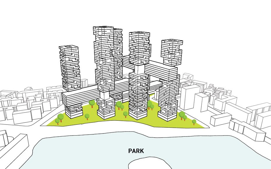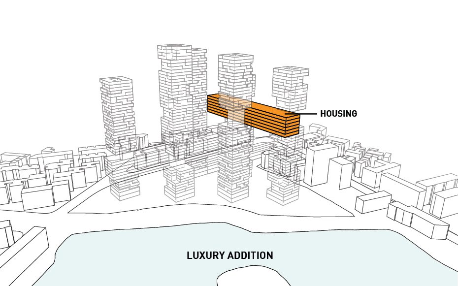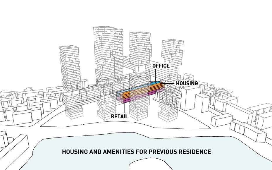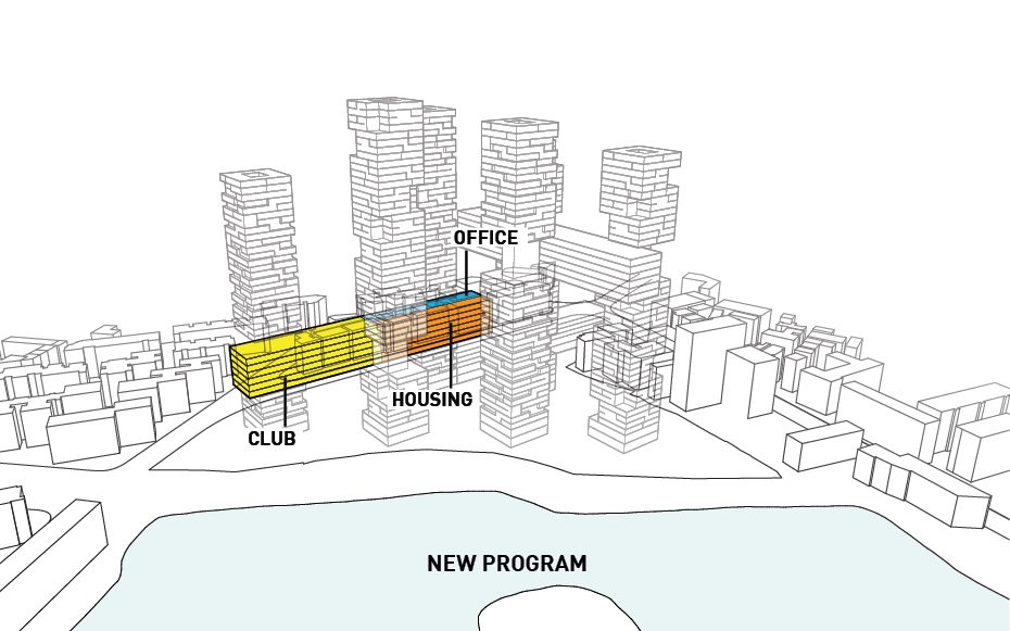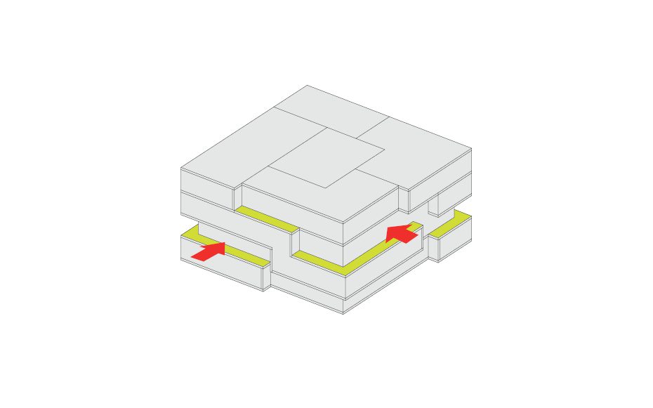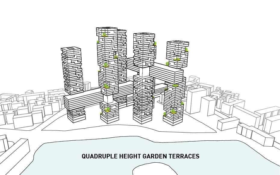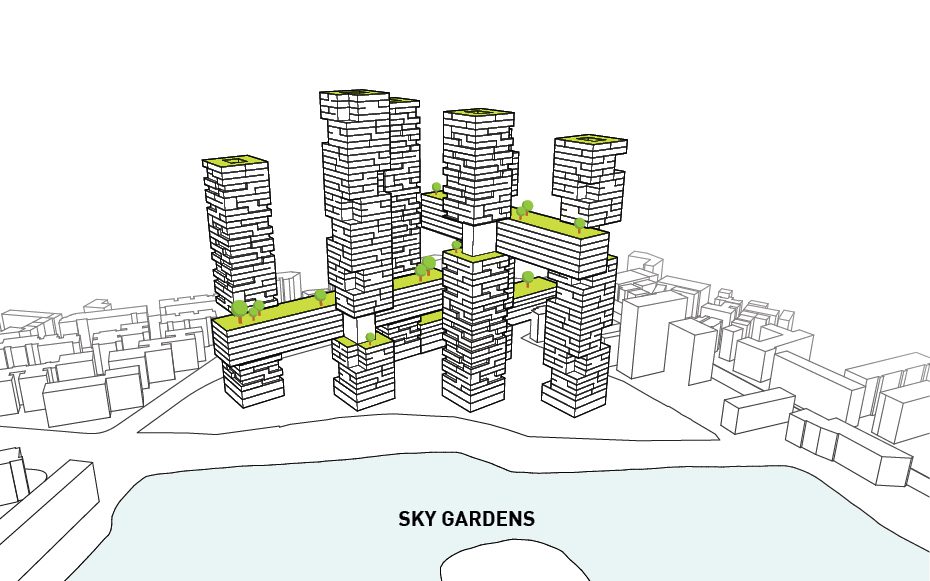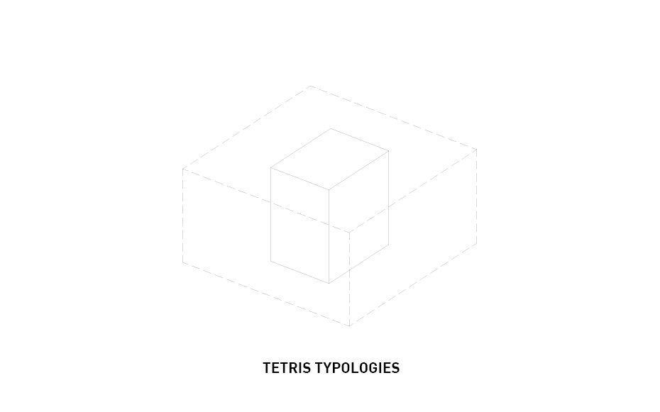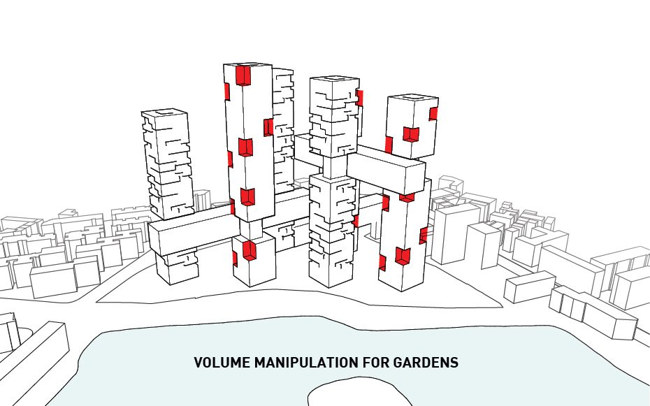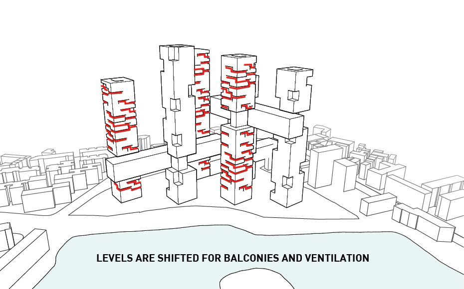 Not only that, but it also cuts out all the facades that face directly North therefore shielding it from the sun’s direct light and reducing energy costs. The horizontal bars connecting each tower house various amenities offered to the residents as well as circulation between each of the towers. Rectangular four-level volumes are cut from the six towers in order to create various outdoor garden terraces available to the users while also addressing the environmental crisis in China. The circulation bars contain office space, retail, a club, and other housing types. Tetris-like typologies are manipulated to create a unique organization of the various styles of apartments. Parking is hidden underground and on ground level is a public park.