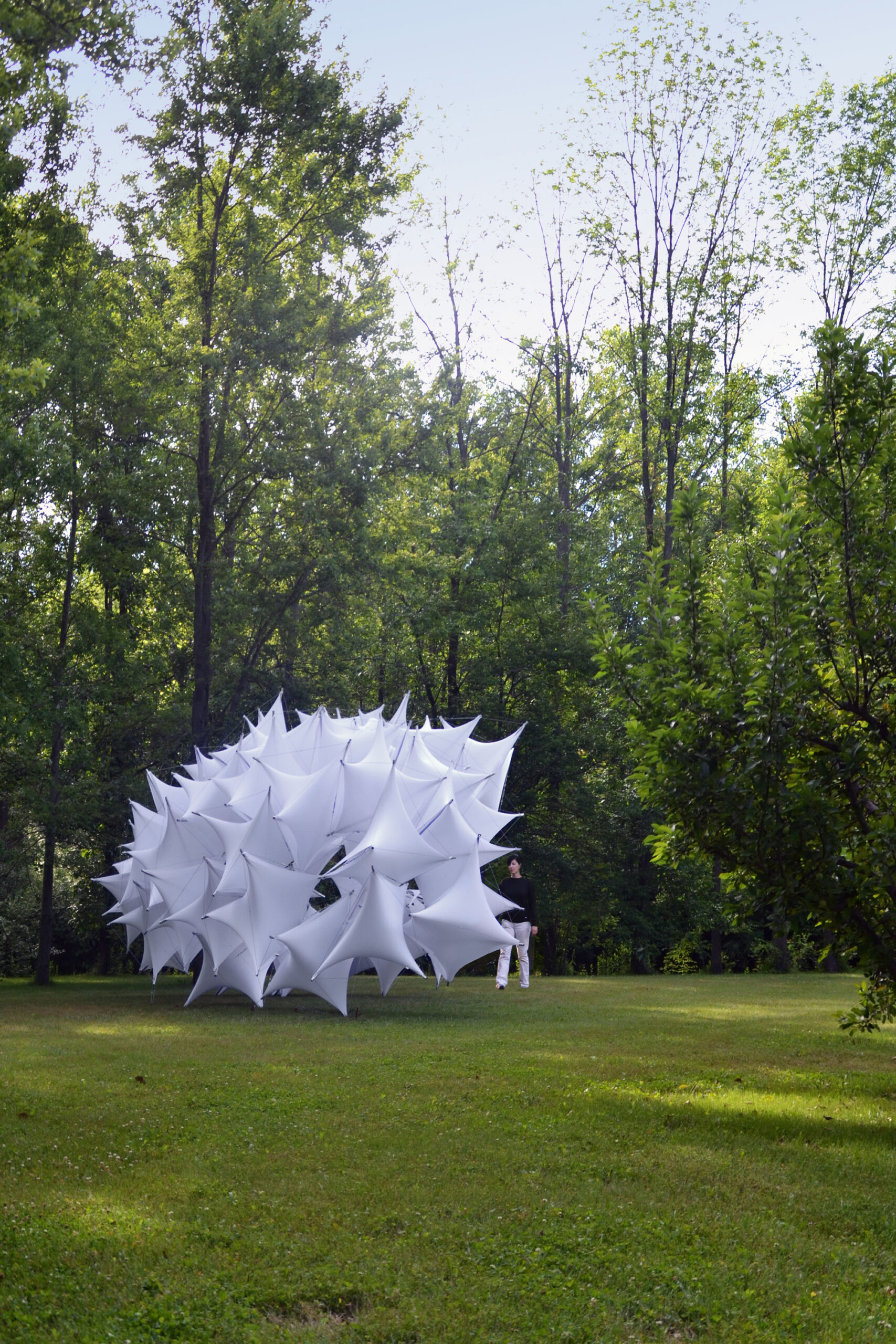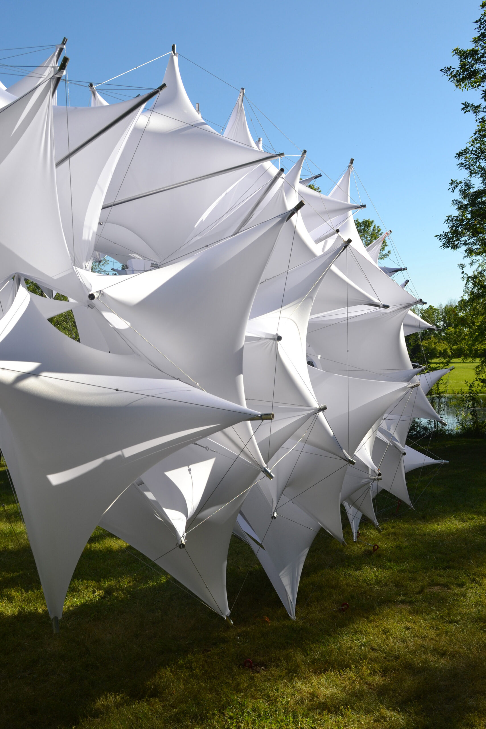 The Underwood Pavilion stands out as a new art destination. With its composition, mobility, and the new essence it brings, the pavilion attracts many of the city’s residents and tourists to new places. With its current location in one of Indiana’s post-industrial landscapes, the pavilion draws people to experience Art Events in an innovative way. The Structure is made of two main components: the lightweight structure and the self-shading envelop. The lightweight structure is composed of multiple variations of a three-strut tensegrity module. The modules vary in their proportions causing them to have different curvatures and rotations. As for the self-shading envelop Elastan, an eco-friendly polymer, was used. The design of the Underwood Pavilion frames nature around it as precious art pieces, while standing out as a beautiful structure within the landscape. Find more details from the architect after the jump.