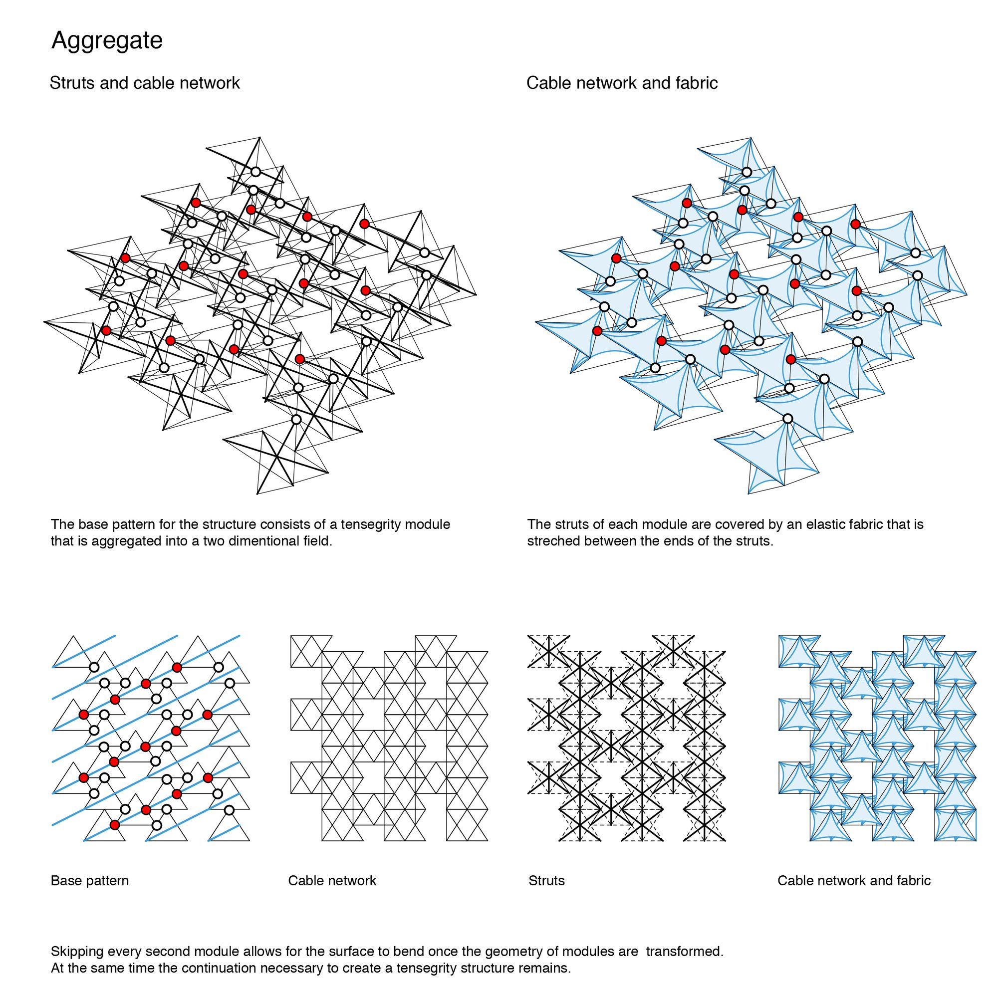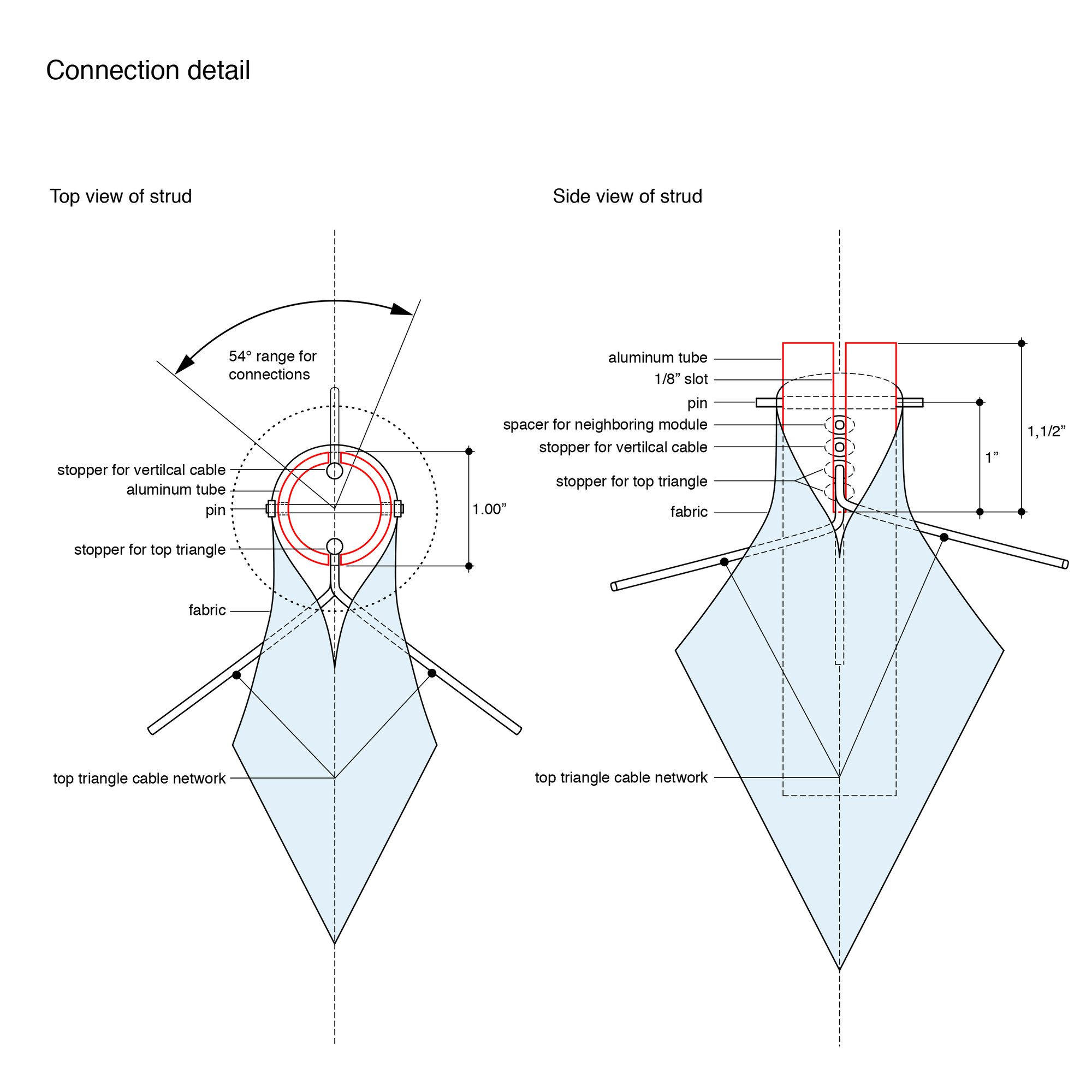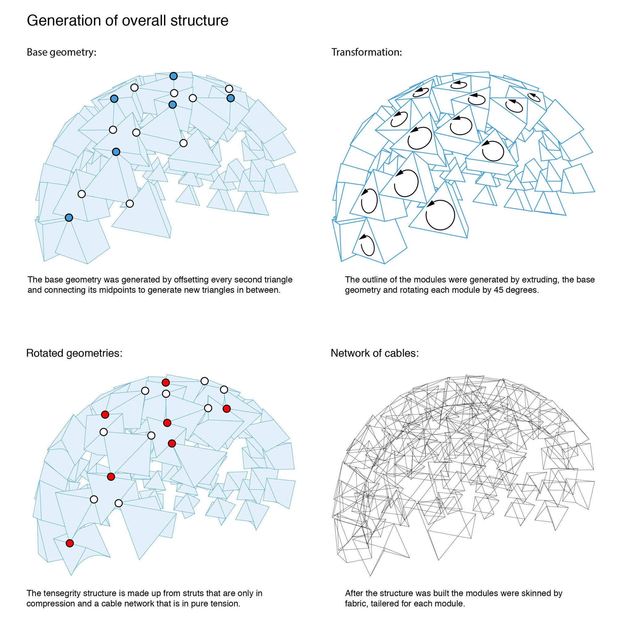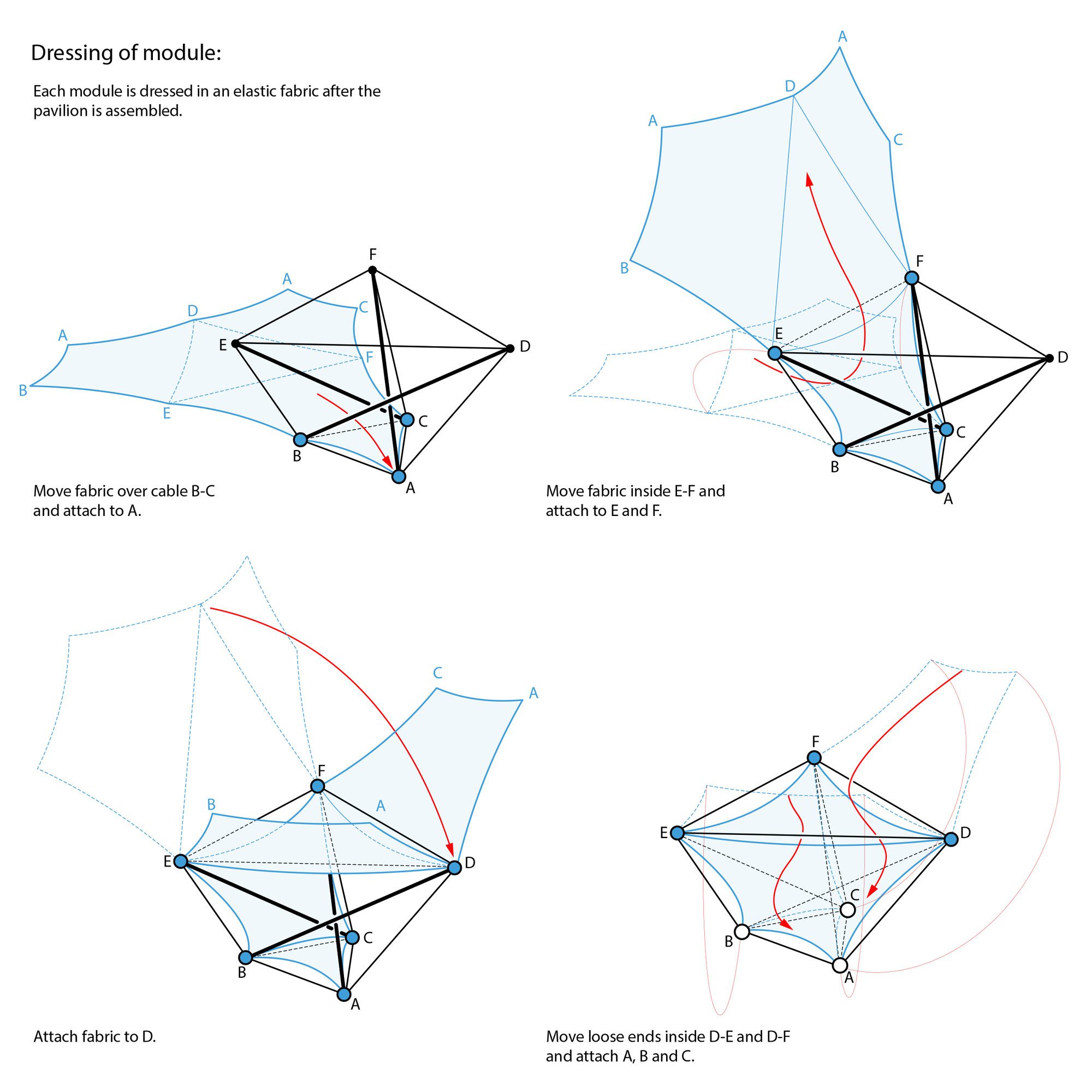 Self-shading envelope: To respond to a specific context the modules were arranged in a tensegrity pattern. Skipping every second module in every second row created smaller and larger openings that were placed to frame the environment. Elastan, an eco-friendly polymer originally used for sportswear was adapted to create the pavilion’s self-shading envelope. Elastan is created from filaments that are more durable than non-synthetic materials such as rubber. It can be produced from 100% renewably sourced raw material such as recycled polyester. Once all modules were connected each module was dressed with an elastic fabric to form a minimal volume that was defined by the location of the struts and the elastic quality of the fabric. Tensegrity structures have large advantages compared to other structural systems. Using predominantly tension members they are lighter and stronger than conventional systems. As temporary lightweight structure the Underwood pavilion additionally takes advantage of the self-erecting behavior of tensegrity systems. Using physics engines as a design tool shows how tensegrity systems can be parameterized to adapt to site and program.