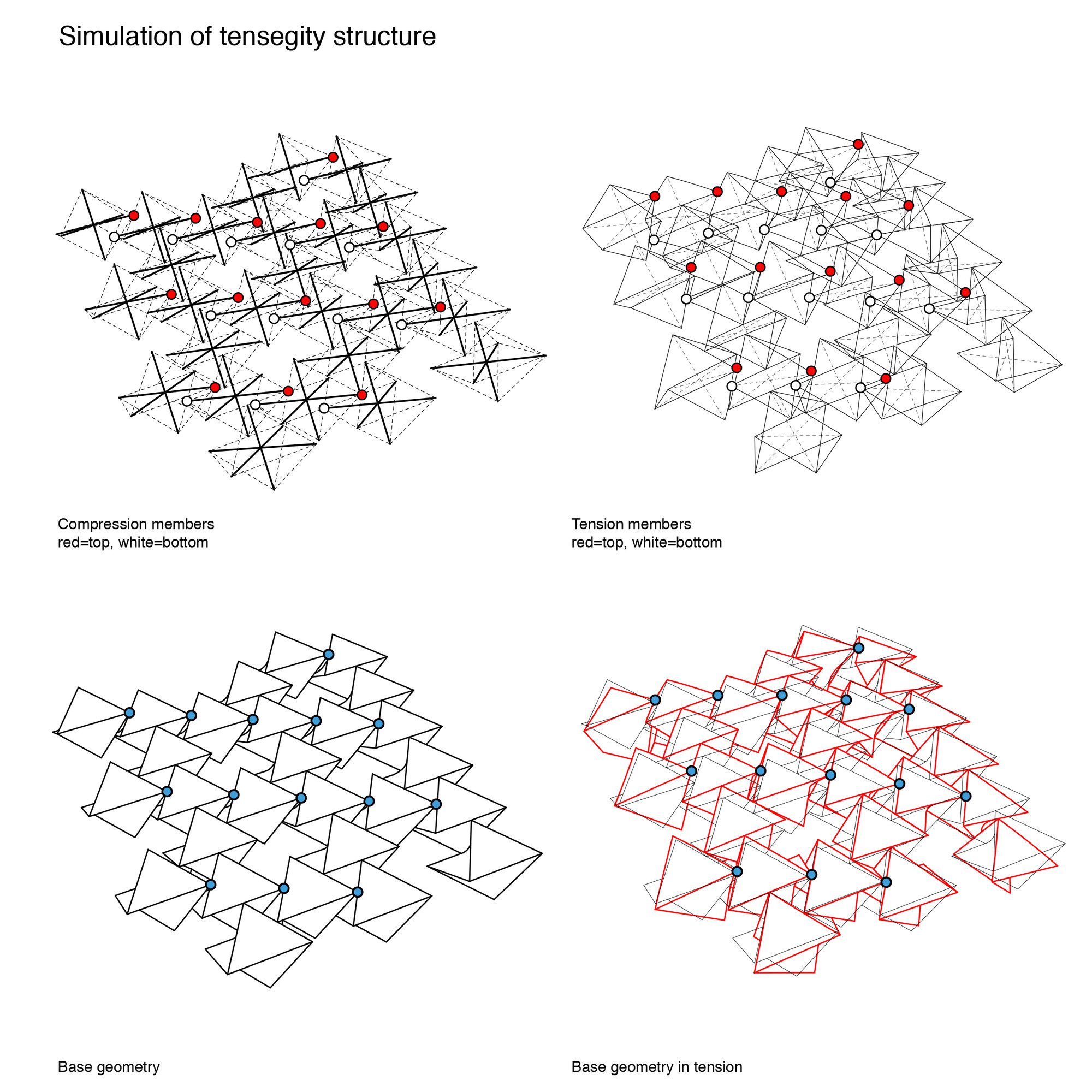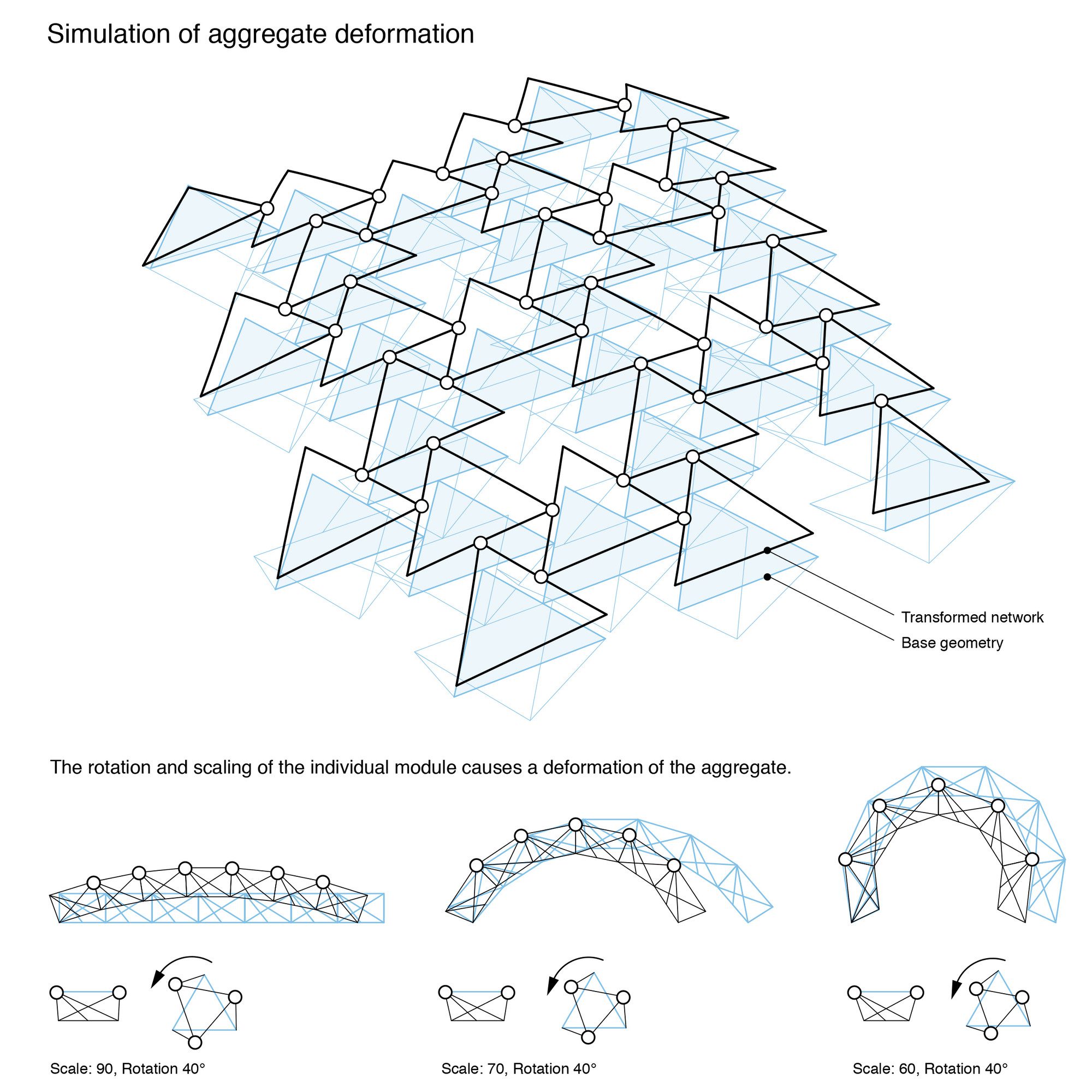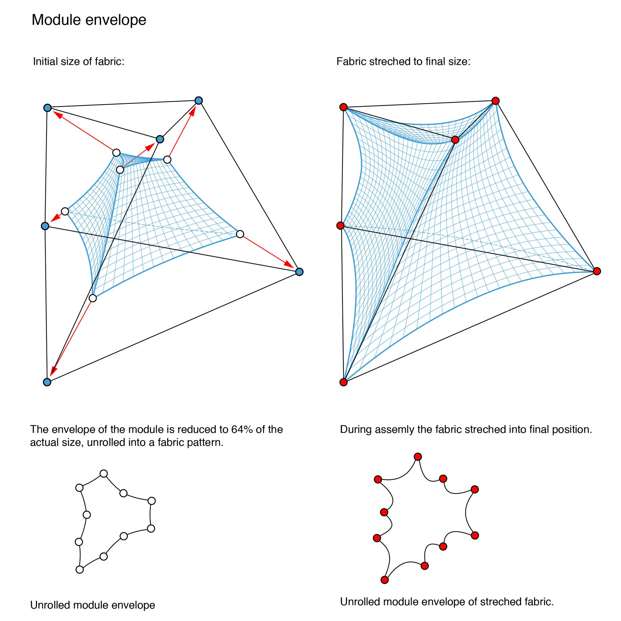Self-shading envelope: To respond to a specific context the modules were arranged in a tensegrity pattern. Skipping every second module in every second row created smaller and larger openings that were placed to frame the environment. Elastan, an eco-friendly polymer originally used for sportswear was adapted to create the pavilion’s self-shading envelope. Elastan is created from filaments that are more durable than non-synthetic materials such as rubber. It can be produced from 100% renewably sourced raw material such as recycled polyester. Once all modules were connected each module was dressed with an elastic fabric to form a minimal volume that was defined by the location of the struts and the elastic quality of the fabric. Tensegrity structures have large advantages compared to other structural systems. Using predominantly tension members they are lighter and stronger than conventional systems. As temporary lightweight structure the Underwood pavilion additionally takes advantage of the self-erecting behavior of tensegrity systems. Using physics engines as a design tool shows how tensegrity systems can be parameterized to adapt to site and program.