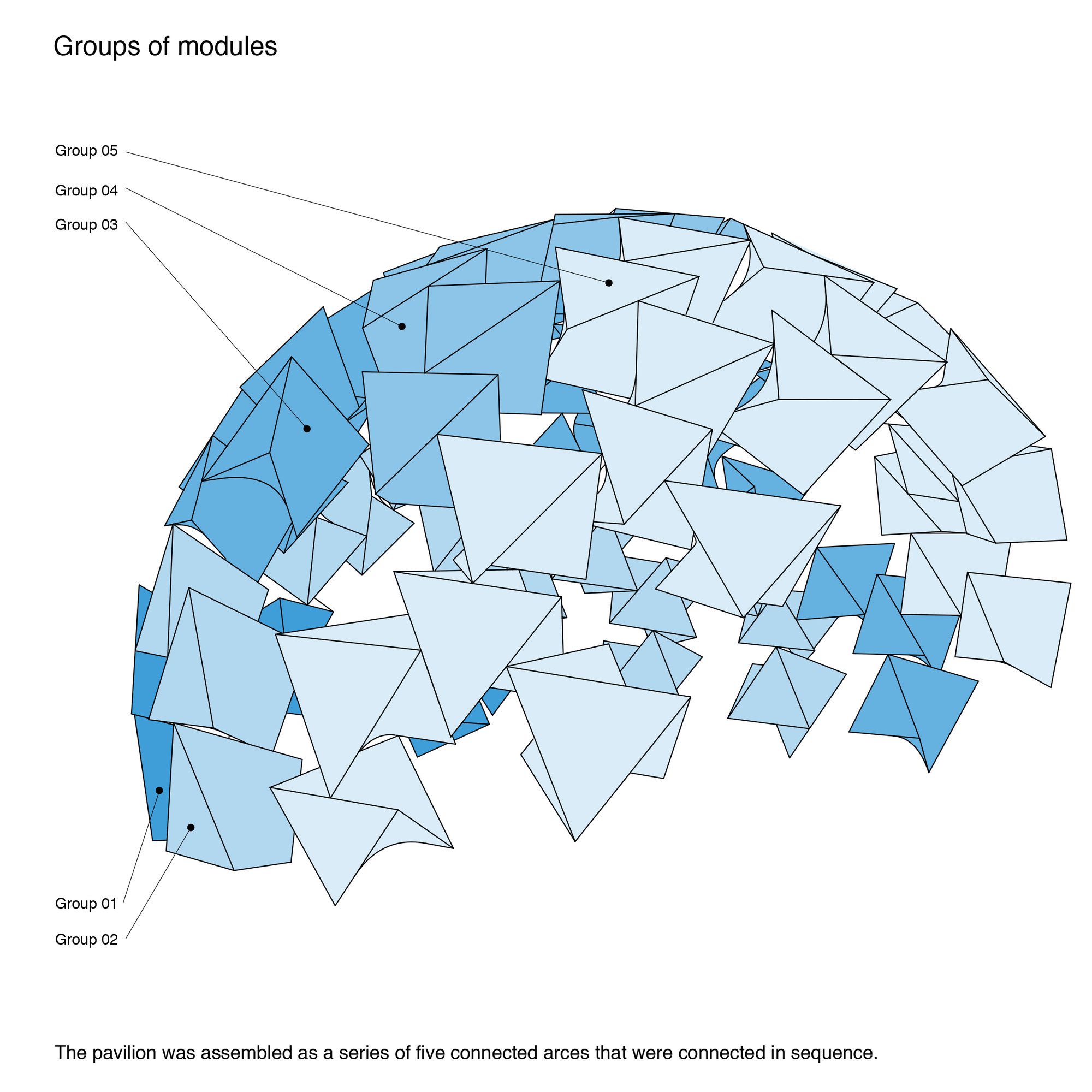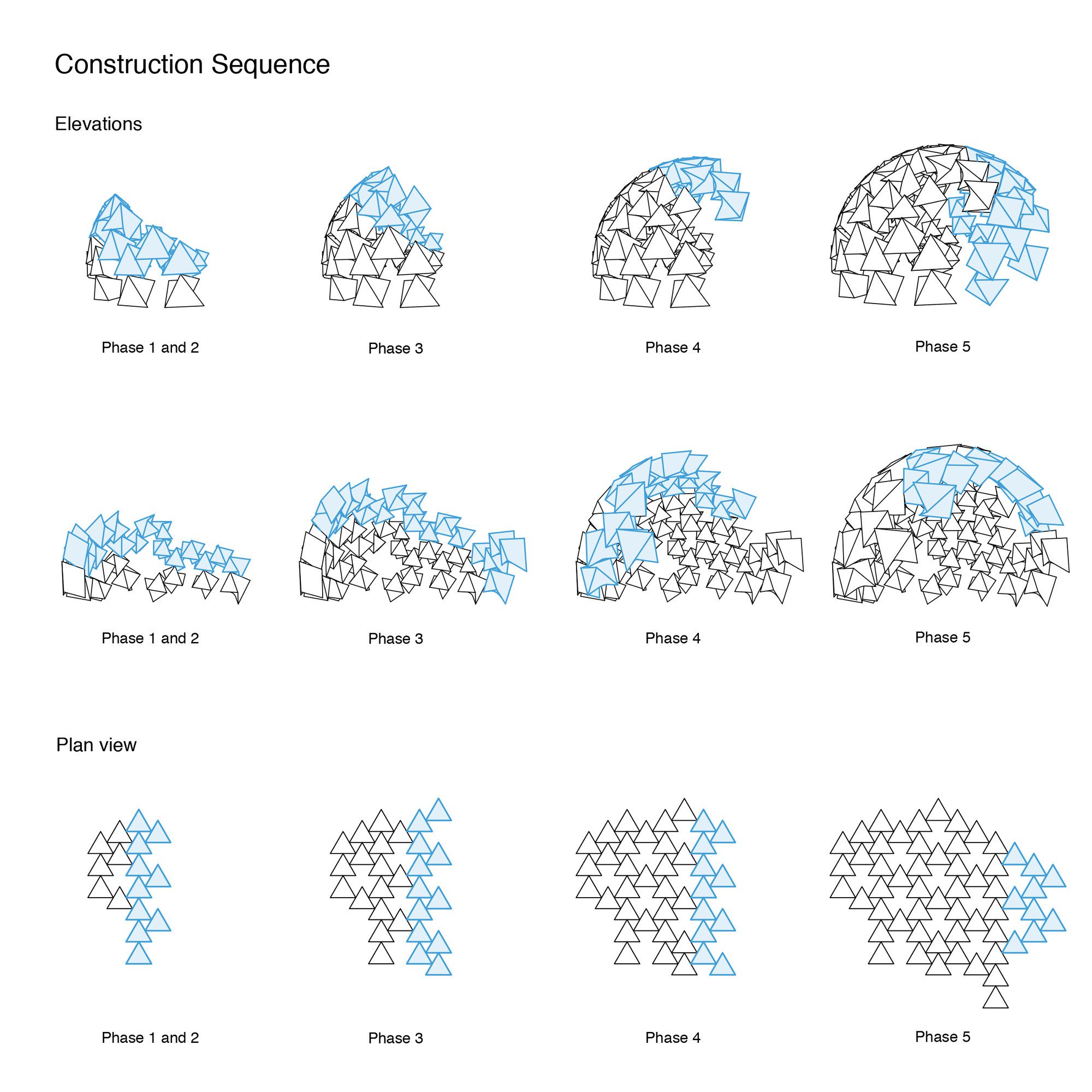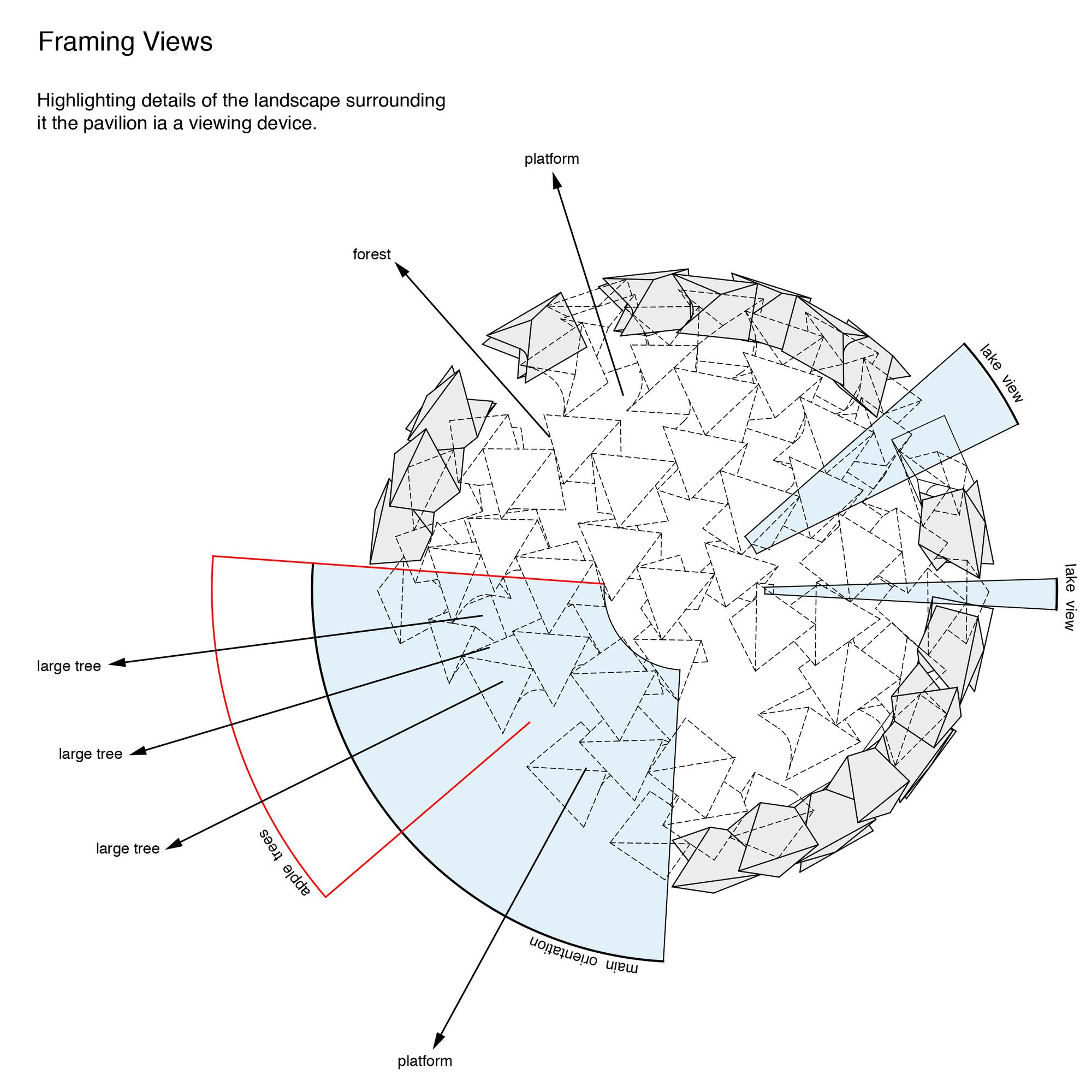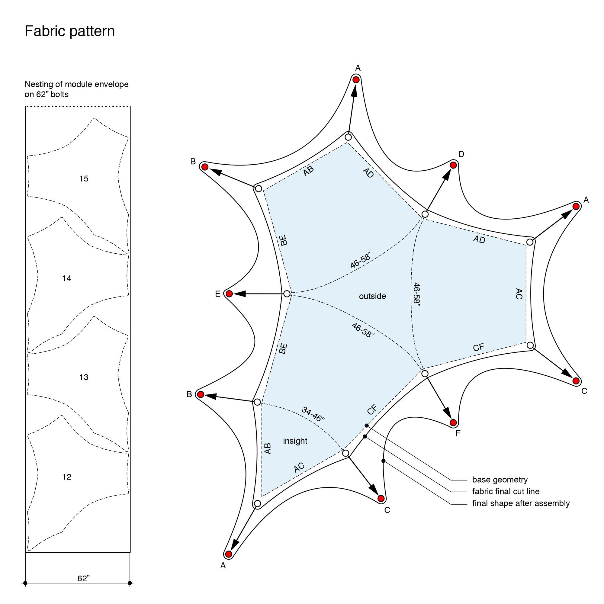 Self-shading envelope: To respond to a specific context the modules were arranged in a tensegrity pattern. Skipping every second module in every second row created smaller and larger openings that were placed to frame the environment. Elastan, an eco-friendly polymer originally used for sportswear was adapted to create the pavilion’s self-shading envelope. Elastan is created from filaments that are more durable than non-synthetic materials such as rubber. It can be produced from 100% renewably sourced raw material such as recycled polyester. Once all modules were connected each module was dressed with an elastic fabric to form a minimal volume that was defined by the location of the struts and the elastic quality of the fabric. Tensegrity structures have large advantages compared to other structural systems. Using predominantly tension members they are lighter and stronger than conventional systems. As temporary lightweight structure the Underwood pavilion additionally takes advantage of the self-erecting behavior of tensegrity systems. Using physics engines as a design tool shows how tensegrity systems can be parameterized to adapt to site and program.