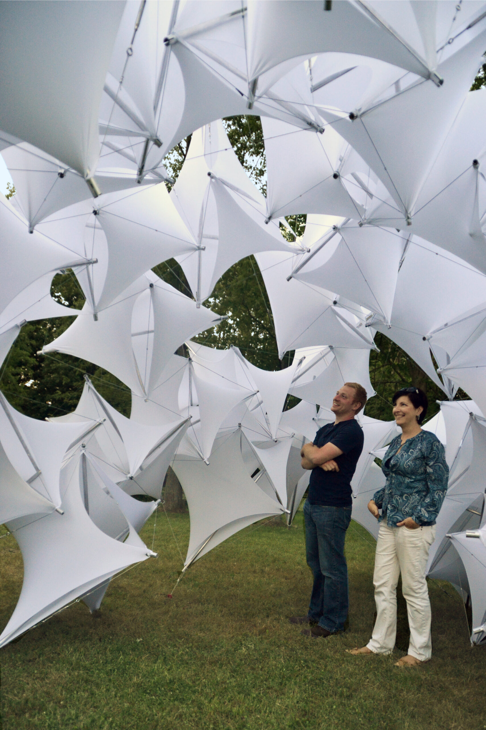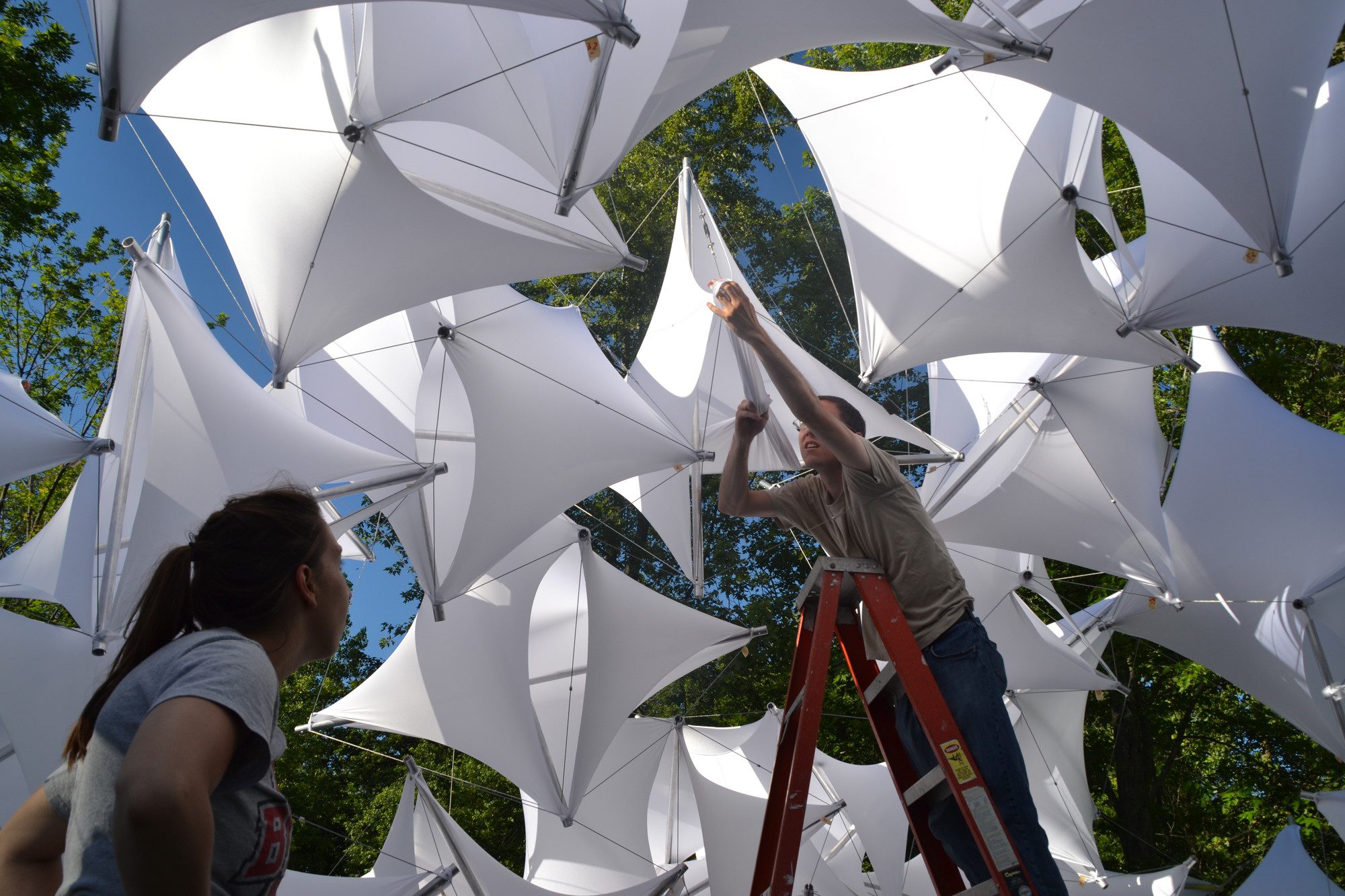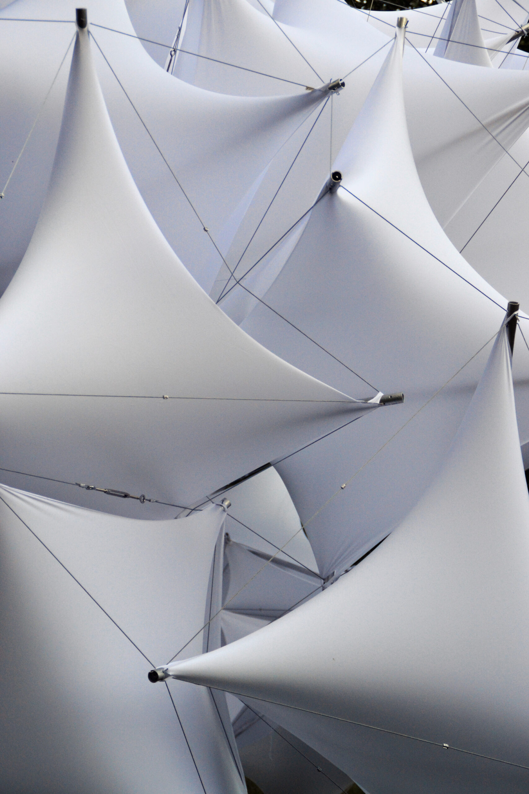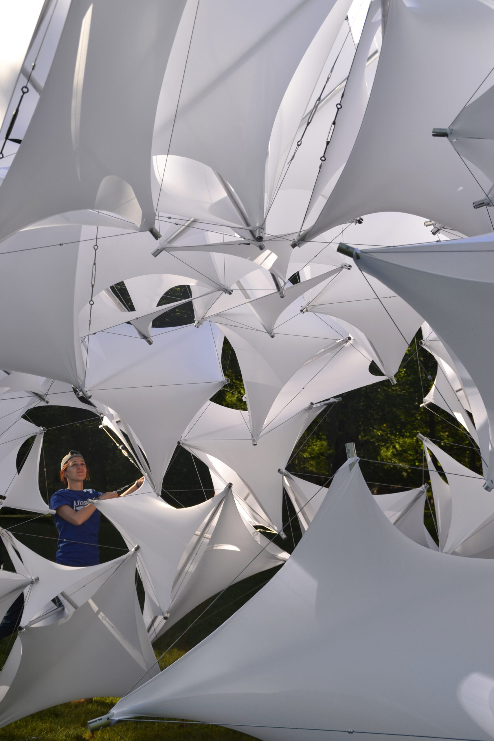 Architecture students of Ball State University, along with their professors Gernot Riether and Andrew Wit, have created an eye-catching parametric tensegrity structure: the Underwood Pavilion. In definition, tensegrity structures are ‘lightweight structures composed of cables in tension and struts in compression.’ The Pavilion, which is located in Muncie, Indiana at the moment, is created from 56 lightweight structures of Elastan fabric. The composition creates a dynamic shaded space for visitors to enjoy while viewing the surrounding landscape through frames created within the structure itself.