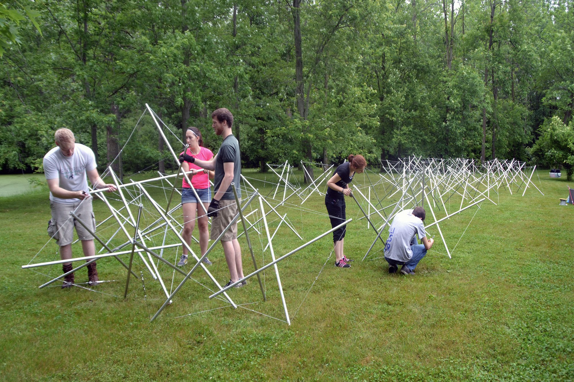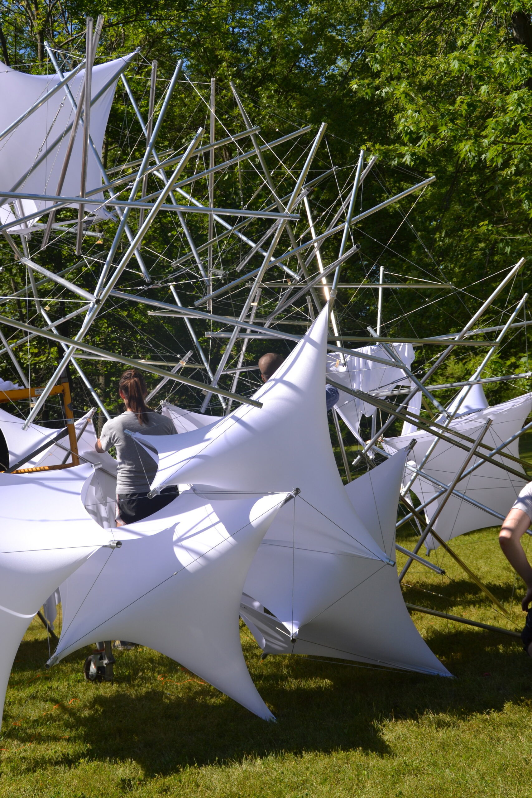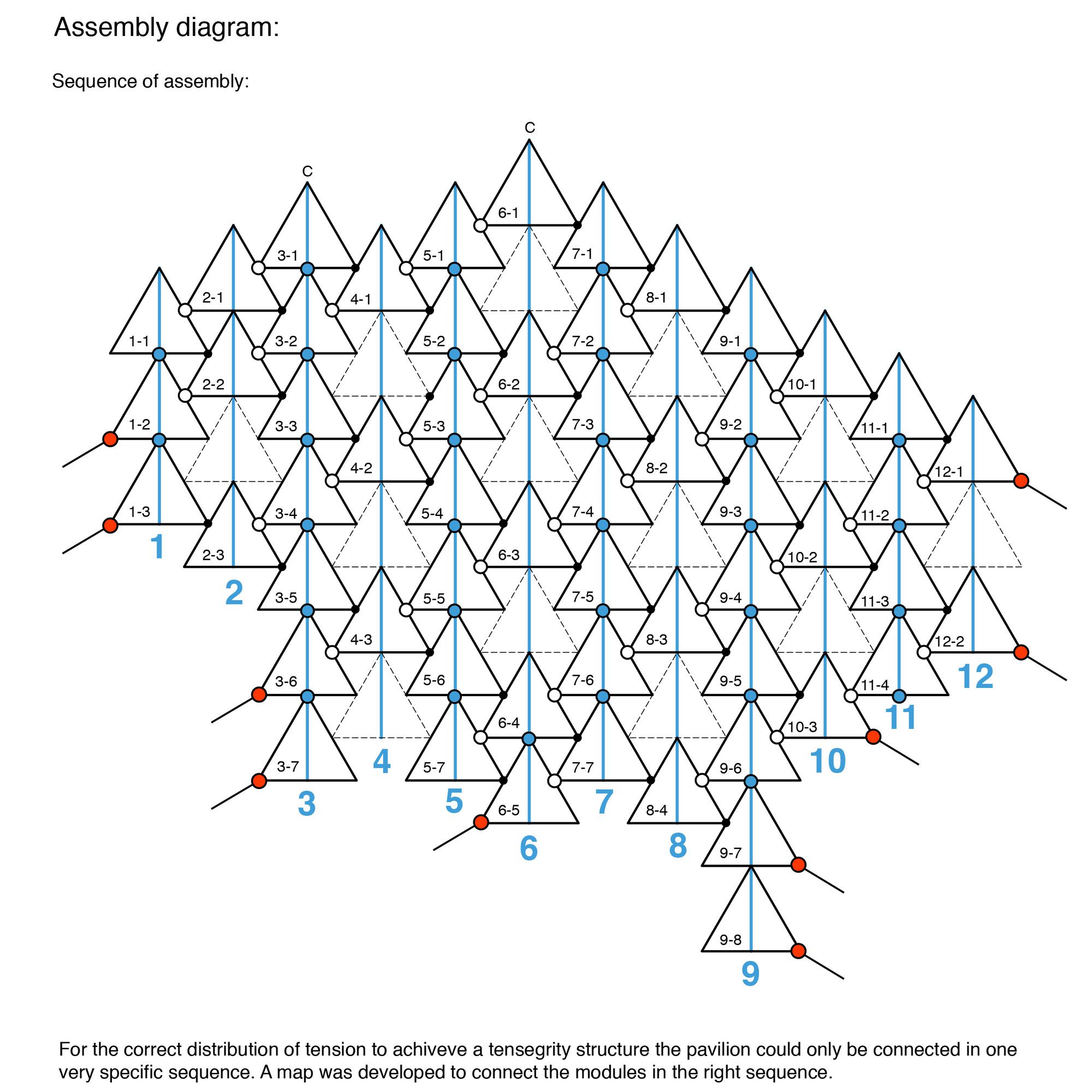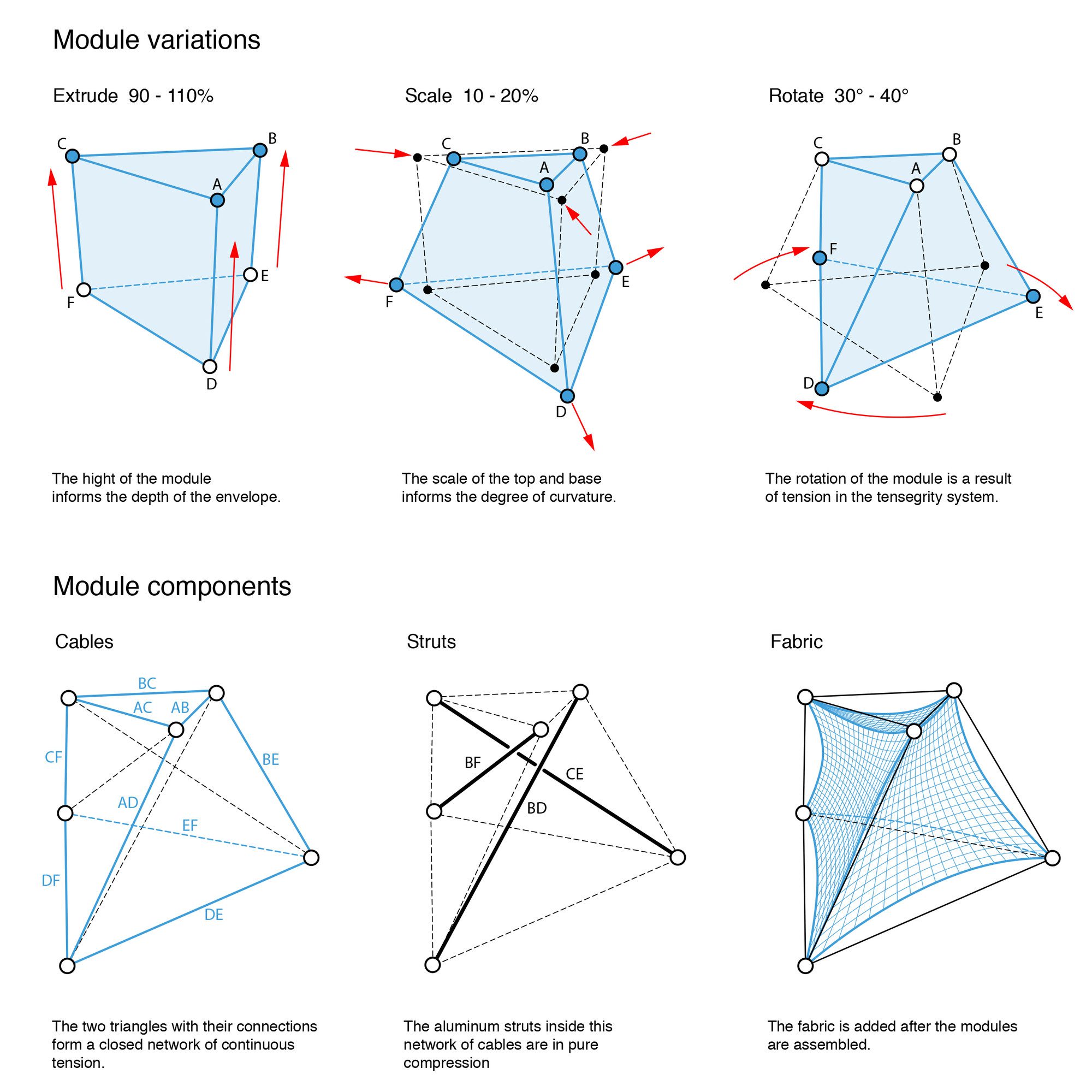 Lightweight structure: The Underwood pavilion’s modules were developed from different variations of a 3strut tensegrity module. Varying the distance between the upper face and the lower face and varying the scale between the upper face and the lower face of the module informed the curvature of the envelope. These variations also generated a different rotation within each module causing the envelope to twist in different directions. The structural simulation engines Rhino Membrane and Kangaroo were essential tools in the form finding process of the pavilion’s structure. The final tensegrity state of a module could only be reached with all cables in tension and all bars in compression. The entire system remained loose with all members being connected except one. This allowed for the modules to be stacked and transported efficiently as a loose low–volume bundle of bars and cables (3” x 3” x 6’). At the site of construction only one cable per module had to be joined. Using a turnbuckle to connect the final node allowed regulating the stress in the module until it snapped into the predicted tensegrity geometry. Each of the 56 modules describes a volume of 3’ x 3’ x 3’ to 4’ x 4’ x 4’.