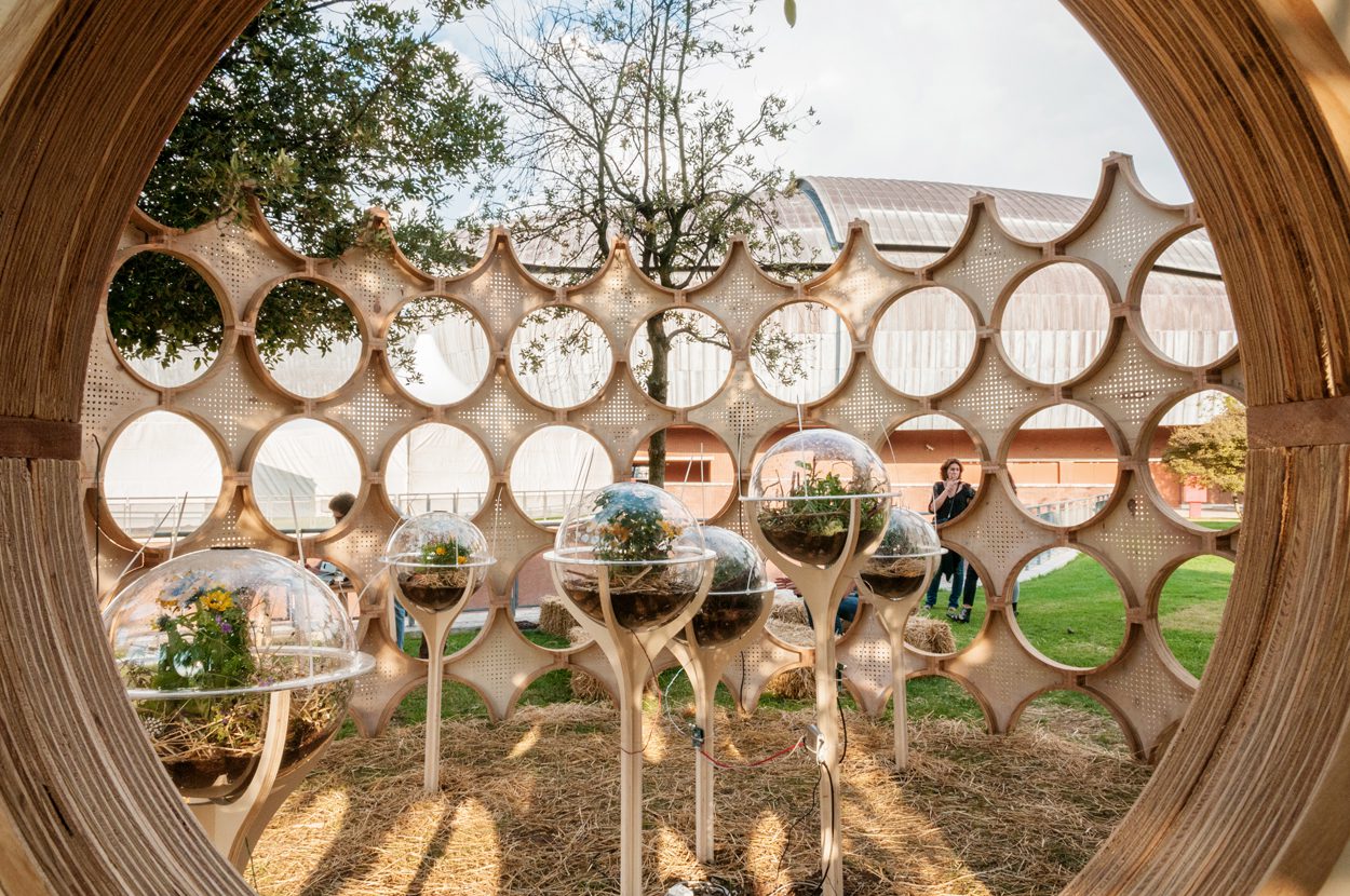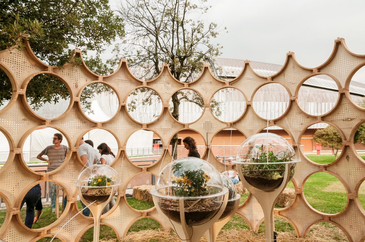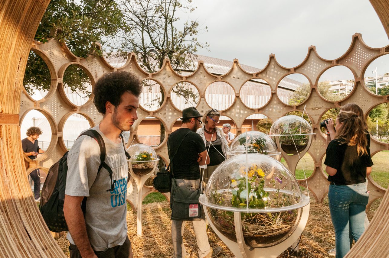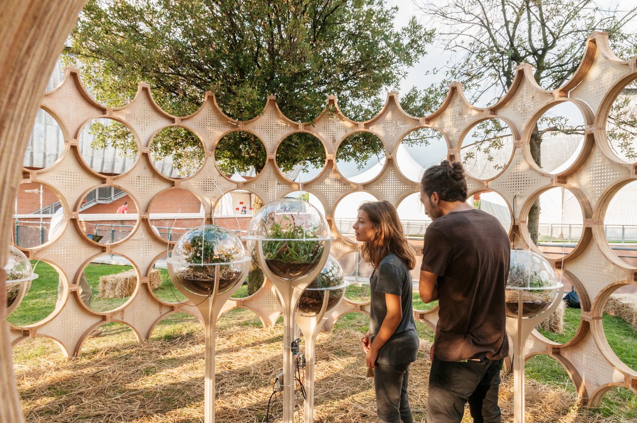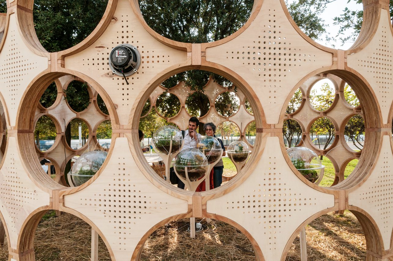 Wunderbugs by OFL Architecture, designed and created at the second annual Maker Faire Europe in Rome, is a combining of humans as audiences to “six spherical ecosystems” where insects move about their businesses. The space contains sensors to collect and broadcast the combined naturalistic experience. OFL Architecture: Inspired to connect people and nature, the project was made by a team, composed of “a biologist, a sound engineer, a composer, and an architect.”