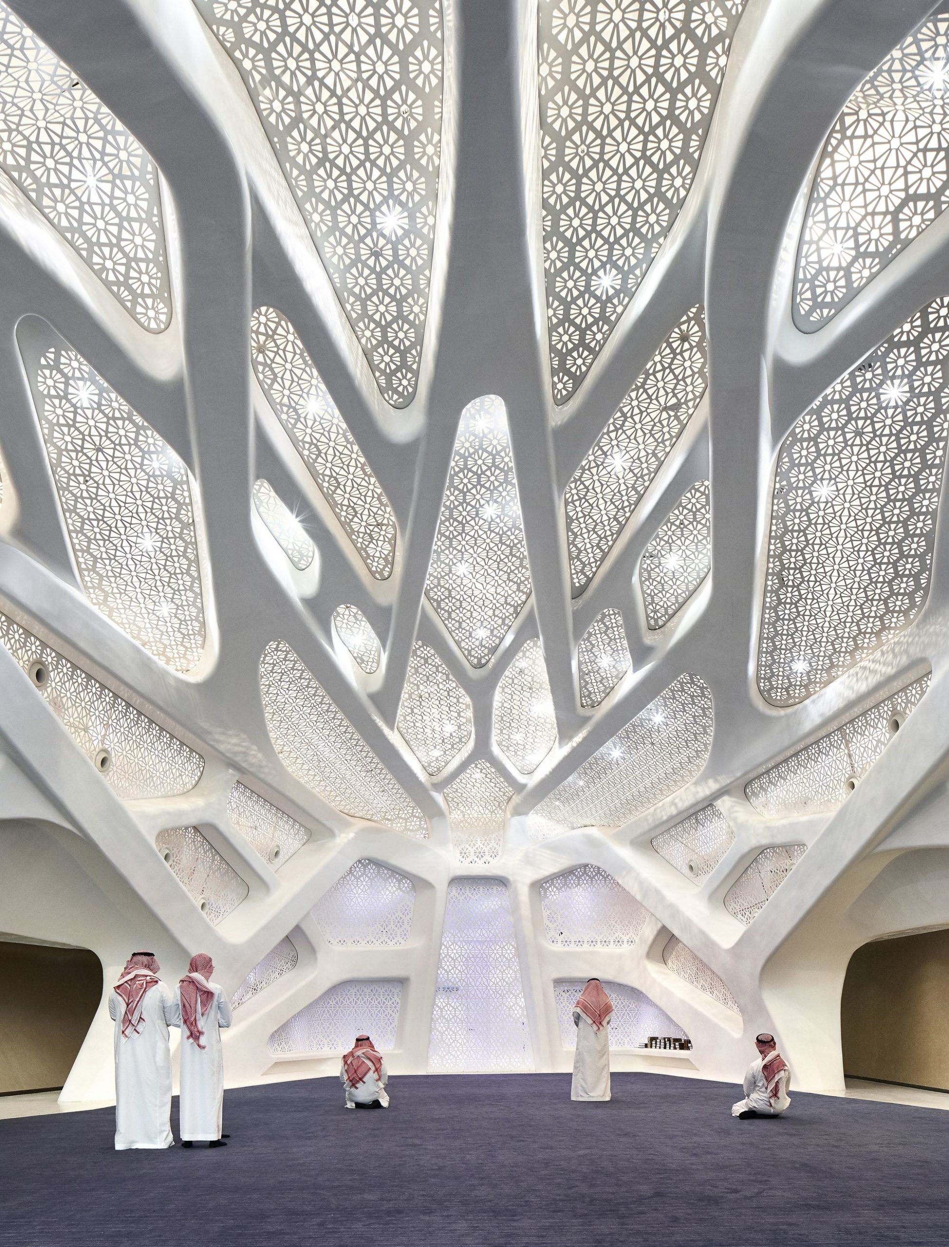 Viewed through the lens of a traditional mashrabiya wall, internal volumes feature interplay of light and shade. Wrapping all four walls as well as the ceiling, the screen glows with the natural light from the punched windows and skylights.