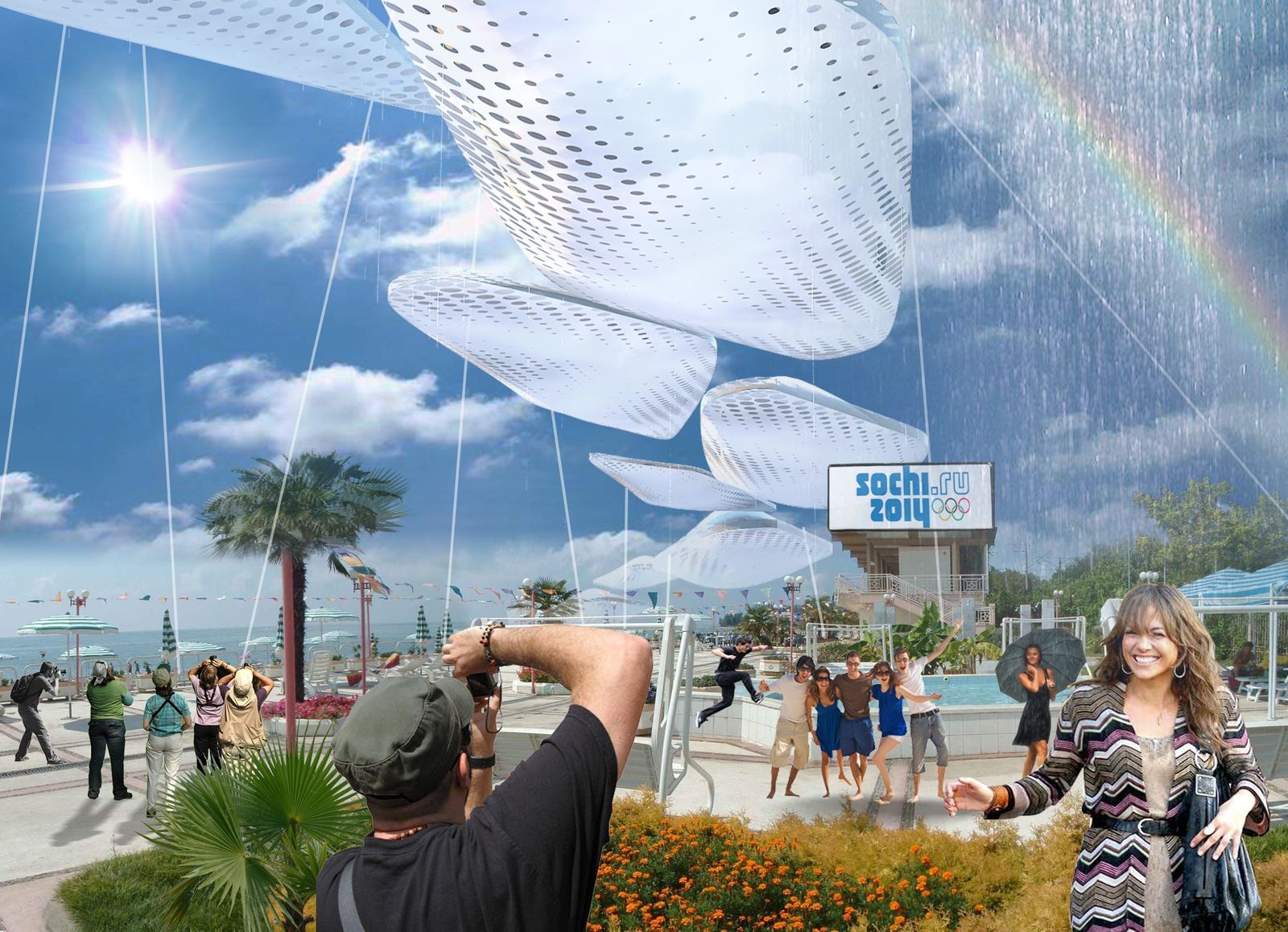 The structures will be linked by way of rigid connections, which will stabilize not only individual ‘clouds’ but the network as a whole. The structures provide cooling and shade for those on the ground, and exceptional vantage points of the Games for those VIPs dwelling within and will be accessible by way of what the architects call ‘platform-boats’, linked with each module form.
