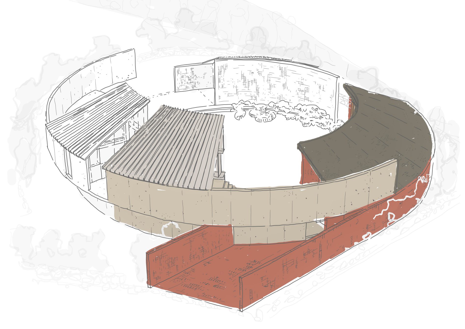 When we first visited, the site felt like an open, exposed clearing, making privacy one of the main design challenges. To address this, we proposed overlapping the architectural mass with the site boundaries, allowing the fence and exterior walls to connect organically. This strategy created spatial density, and despite the limited footprint, vertical gestures and the extension of the outer shell enhanced the sense of scale and visual openness.