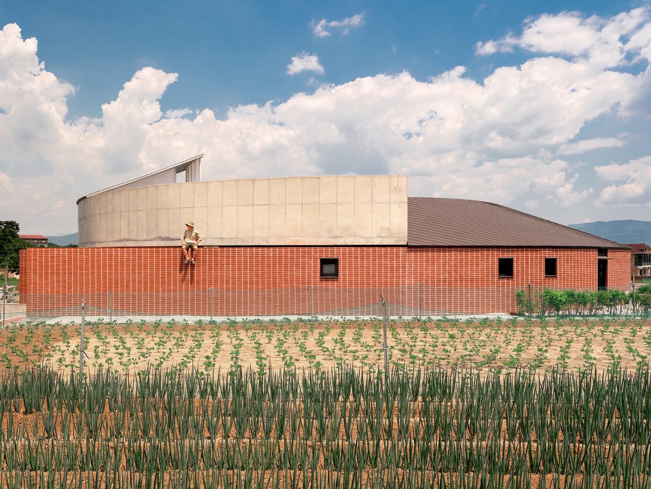 With its embracing gesture, the building presents a solid, fortress-like exterior, while framing views of the forested hillside like a concrete picture frame on the inside. Through a program that intertwines farming with daily life, residents can live in close connection with nature.