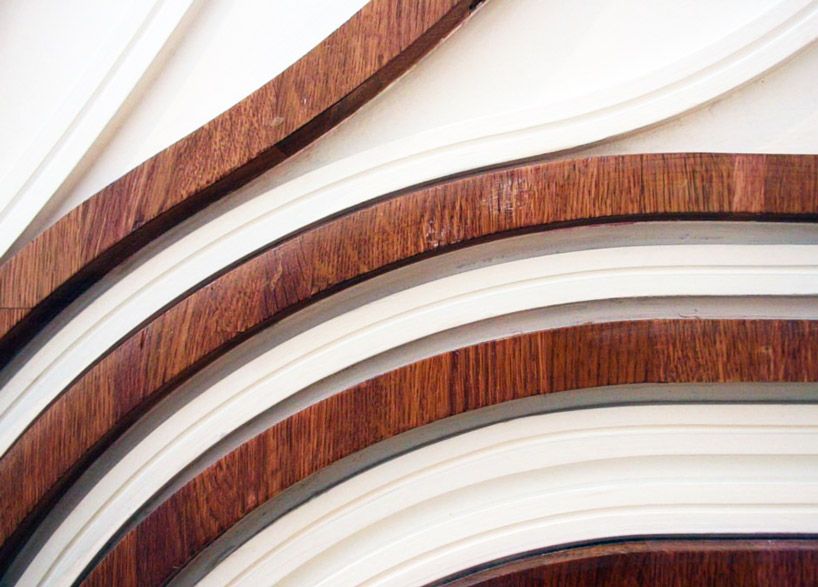 The unusual white and wood stair. This stair is like a creature trying to spread its limbs all over the space. It continues on the wall and to the ceiling framing the door, creating a sculpture forming the handrail and painting wood lines in the wall.
