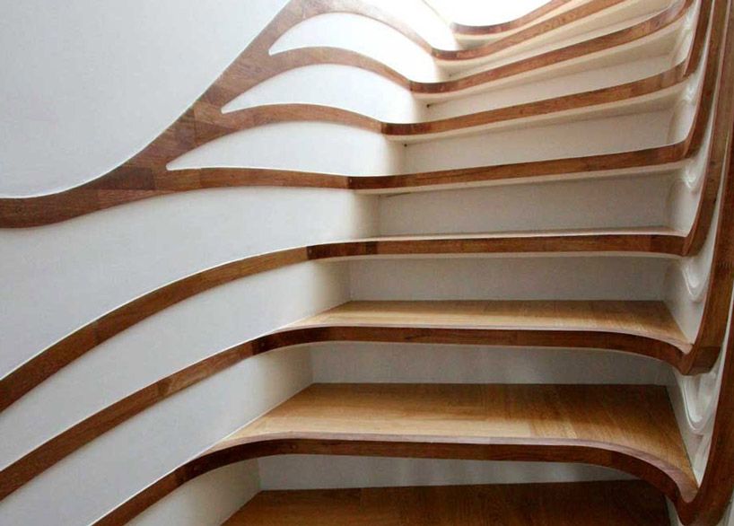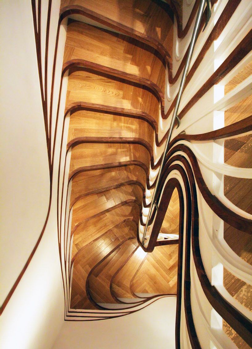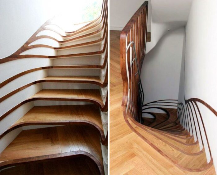 The white color used too serves the design of the stair as it comes in contrast to the timber color of the treads leaving an impact on the space giving it a sense of wideness. Enjoy the sensual – spatial experience of climbing the sculpture.