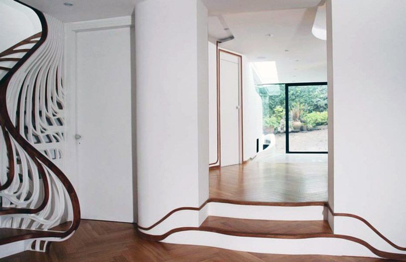 The same language of the curved lines everywhere gives a sense of fluidity. The rise-less steps leave the treads acting as suspended mini slabs attached to the wall.
