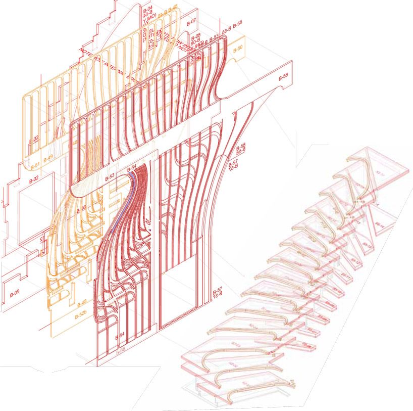 The stair is not defined as a mass attached to the wall but more of an open space taking you from a level to another. No defined space, no borders, just the curved lines.
