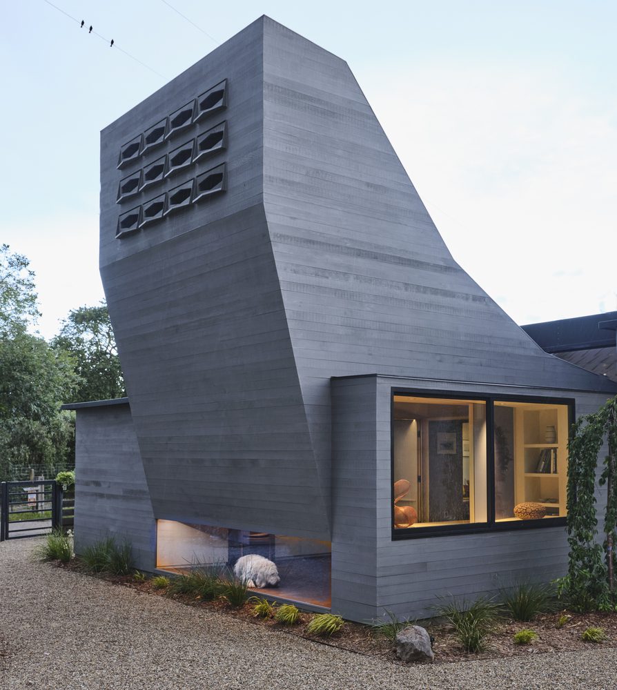 Although hidden from the interior, twelve nesting boxes built into the angled exterior façade encourage the bird’s co-habitation of the space as in traditional dovecote structures. A lower bird-watching window focuses on the doves as they ground-feed and serves as a convenient viewing spot for the owner’s two Spinone Italiani bird-dogs.
