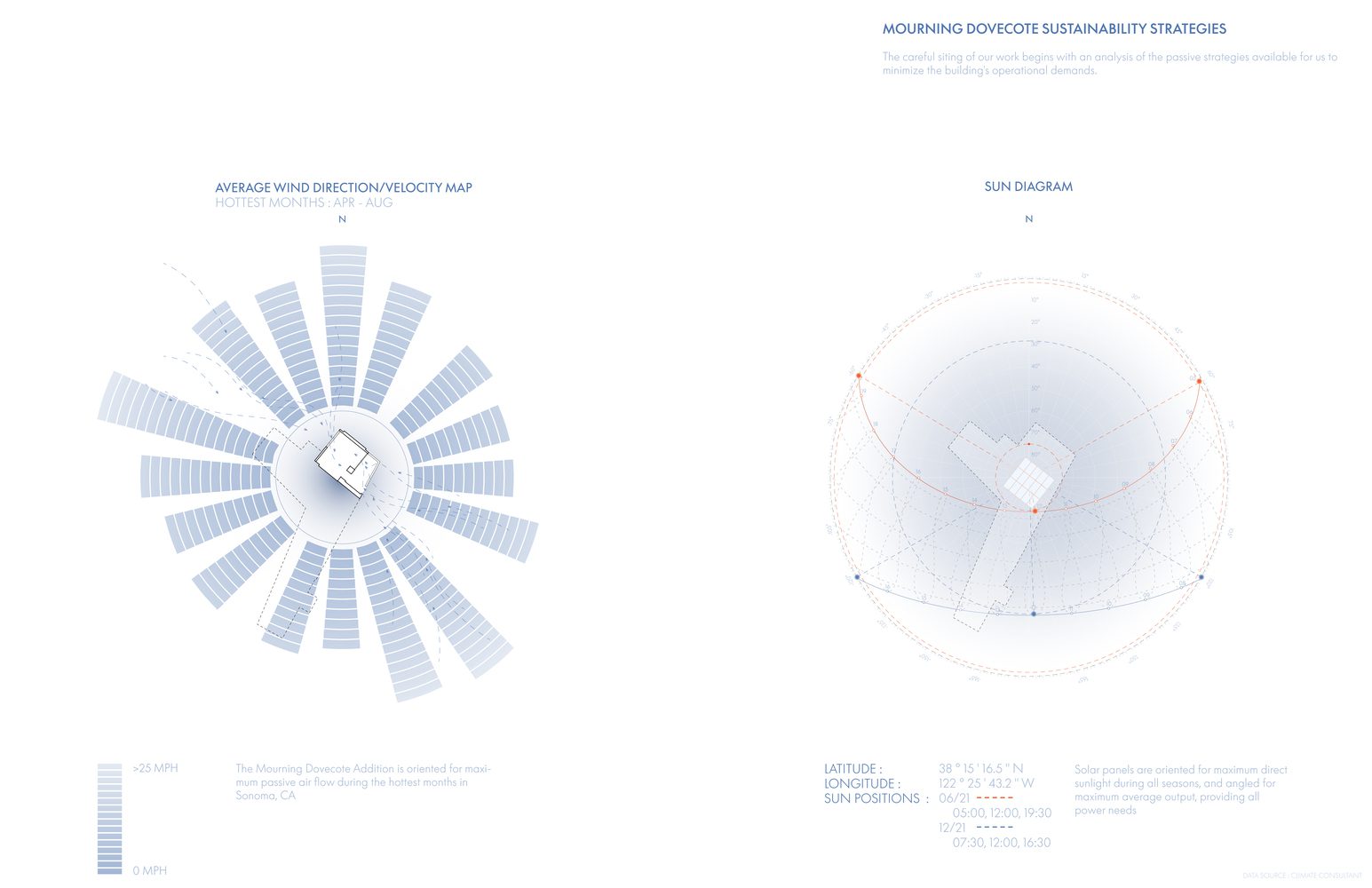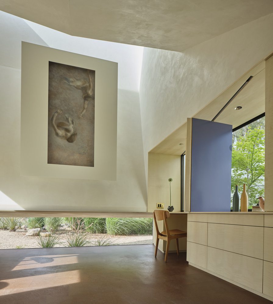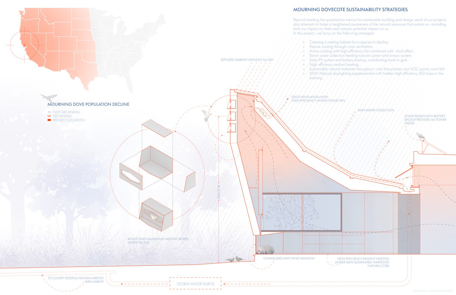 This 390 sq ft studio addition onto the owner/architect’s existing home in Sonoma, California, takes inspiration from the site’s abundant pairs of Mourning Dovecote. The Mourning Dove, one of the most widespread of all North American birds suffering the impact of habitat loss, is typically monogamous yet is a prolific breeder, raising up to six broods a year. Both sexes take turns incubating –the male from morning to afternoon and the female the rest of the day and night. Appreciation of these qualities and the dove’s historical associations with peace and calm made the idea of cohabitation with them a critical leitmotif –one made even more potent in a global pandemic.