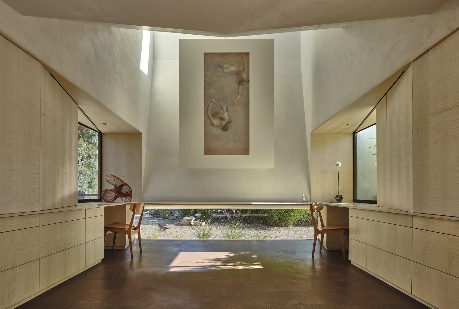 A traditional country ‘dovecote’ houses pigeons or doves, sometimes freestanding but often built into the ends of houses or barns. The architect researched the most advantageous height, orientation, proportion, and ventilation to encourage nesting doves –a process that informed both the shape of the exterior and interior space. The work also serves as a response to the proliferation of the ‘modern farmhouse’ style for new wine country homes –structures with the veneer of traditional farm buildings yet often out of scale with their surroundings, ill-sited, and ill-considered.