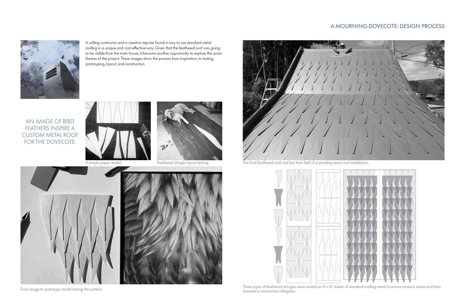 The roof ‘feathers’ are laser cut from sheet metal, carefully nested to ensure minimal waste in fabrication. Similarly, the offcuts from the cedar siding are used to create the laminated entry bridge to the dovecote studio space. The project can operate entirely off-grid with on-site renewable energy generation. As such, it can become an area of refuge in times of increasing environmental instability, such as wildfires and floodings. The solar array installed as part of this project scope produces enough energy to offset 100% of the annual fossil fuel use for the entire property.