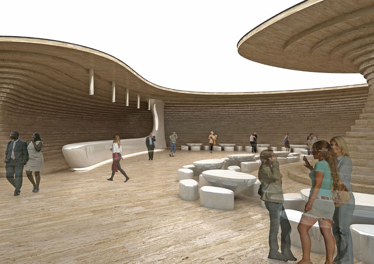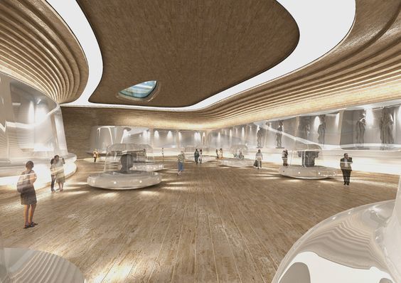 The shape of the building refers to one of the stones thrown from Vesuvius, which landed on the lot and has cooled rapidly, suffered the effect of magma blistering (the formation of cavities on the inside). From these subtractions is added the desire to make the whole project feasible (step), a reminder of the the cavea of the amphitheater, adjacent to it. The building looks like a monolith on four levels (one underground and three surface) of functional spaces (deposits, auditorium audio / video, bookshop, temporary exhibition areas, permanent exhibition areas, roof terrace, toilets, reception, relaxation areas) .