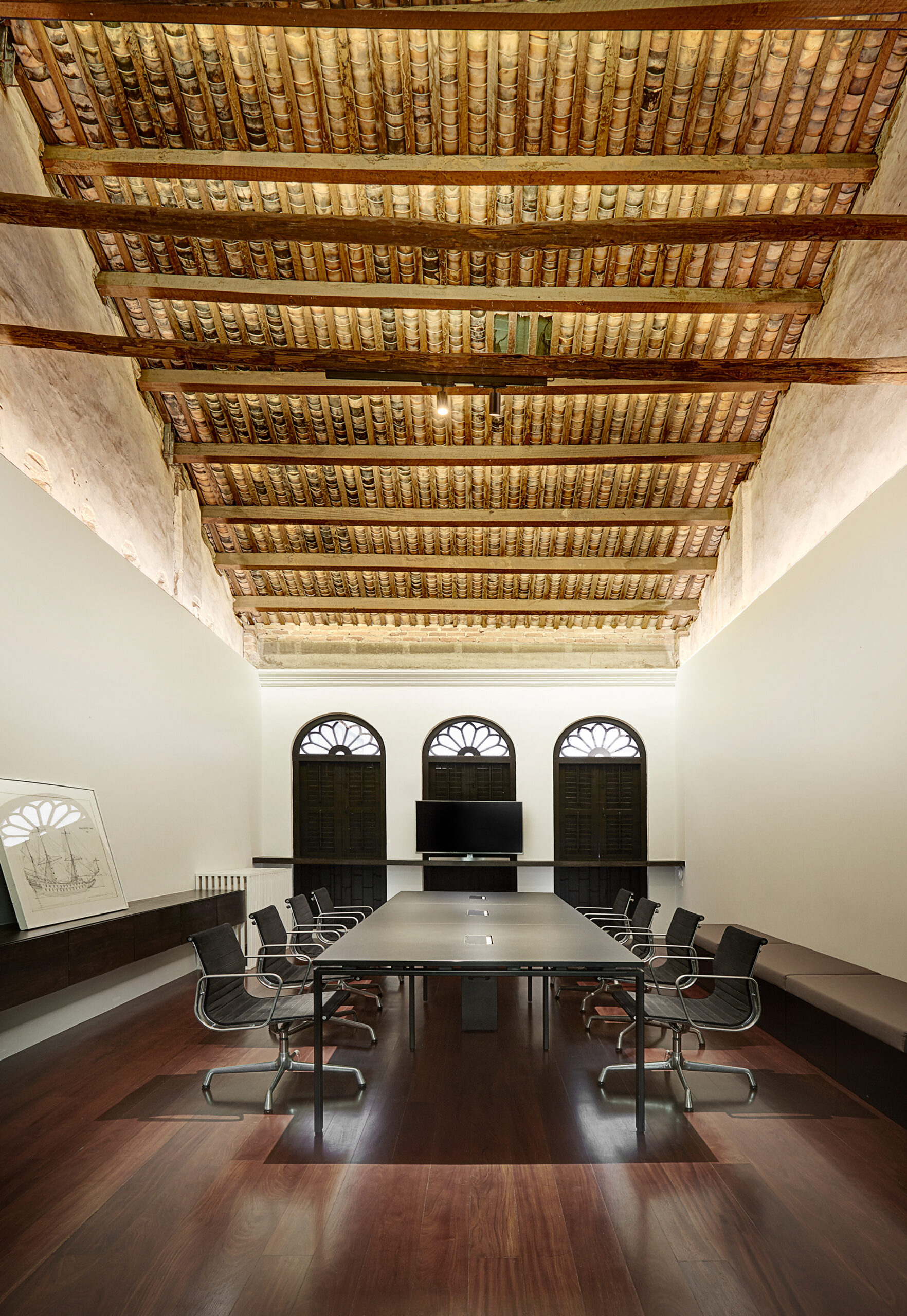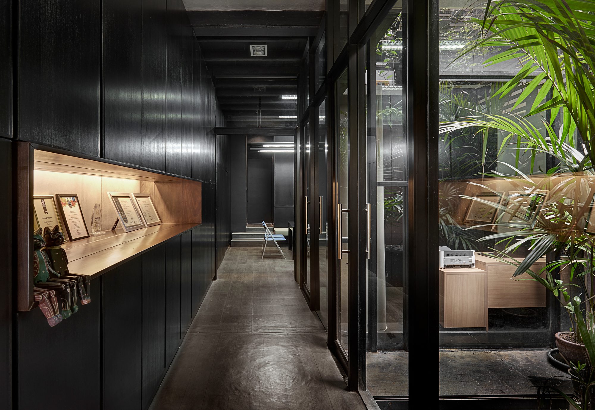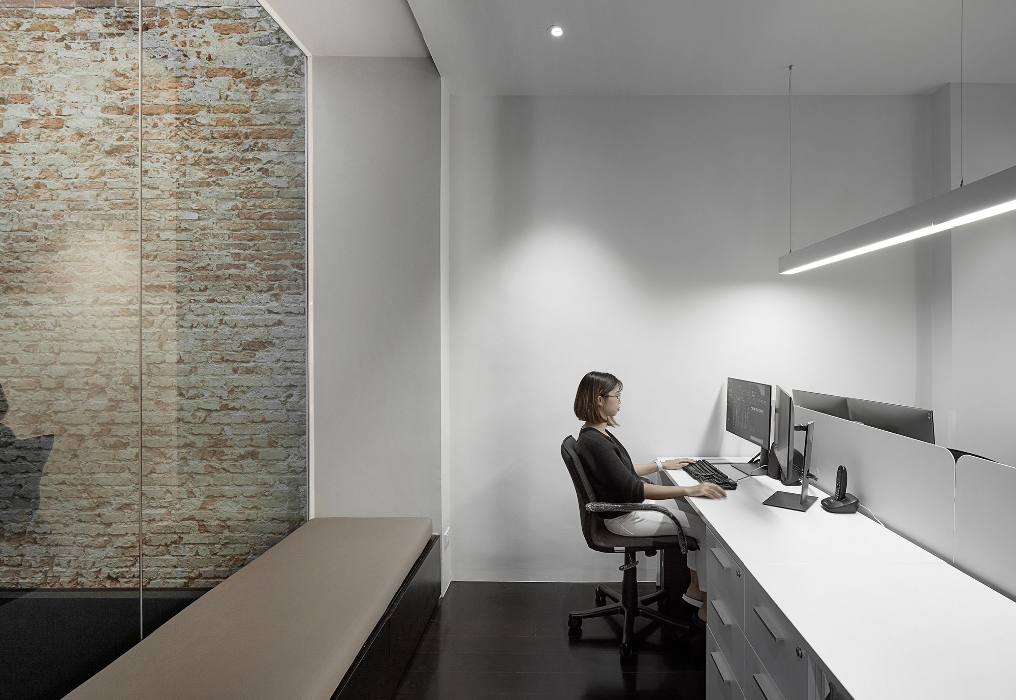 Old barrel terracotta tile barrel ceiling is another element that makes a simple meeting room more special. The architect decided to remove all the false ceiling and add linear in-direct lighting on both sides of the gypsum wall to emphasize these pieces of baked clay. The office upstairs is divided into two zones, connected by an illusive mirroring hall way. A series of rectangular rings of light and three sides mirror, creating an endless reflection through out this enclosed corridor, attracting every visitor to come visit and get their-self an Instagram shot. Other than those spaces mentioned above, the whole working area is simply treated in a minimalistic manner, using a black cabinet and white painted wall to serve a concentrated working atmosphere.