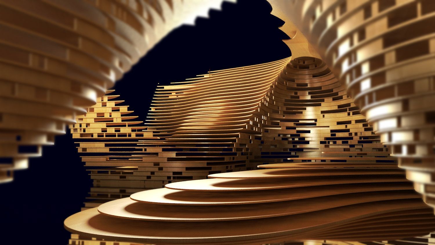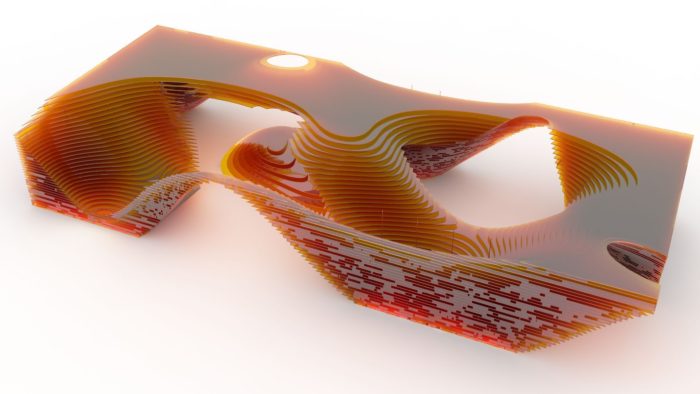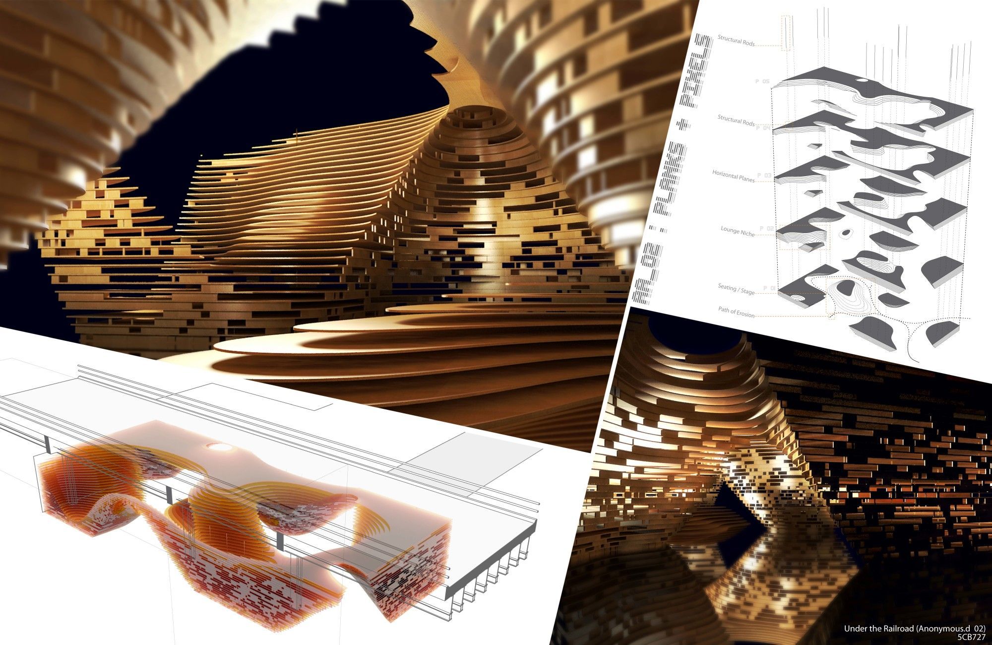 Comprised of horizontal serial sections of wood, the AA_02 : Planks + Pixels installation transforms a once socially-deprived voluminous-void into a socially activated replacement. Vacant space becomes digitally congealed, eroded and guided over time by a stream of digitally-derived excited energy particulates eroding to expose a striated mass enveloping areas for intimate social interaction to occur. The structure hosts an integrated shelving system where grooves hold the displays of past competition entrants and winners–once vacant space becomes enriched through the cultural narrative of the Anonymous. Cave-like niches within the structure are carved-away to reveal areas for a more informal social interaction whilst allowing for visual connectivity to the main circulatory path below. Central to the affect and effect of the design is the dispersion of light as it filters through a stochastic pattern of pixelated surfaces into the habitable spaces within.