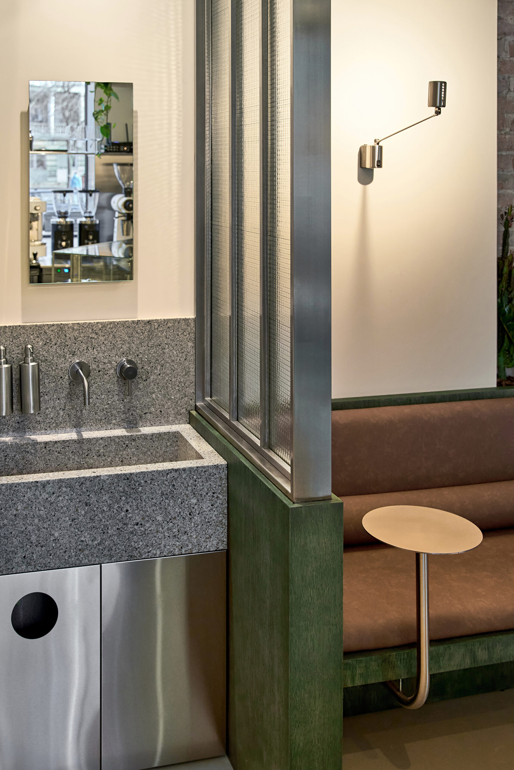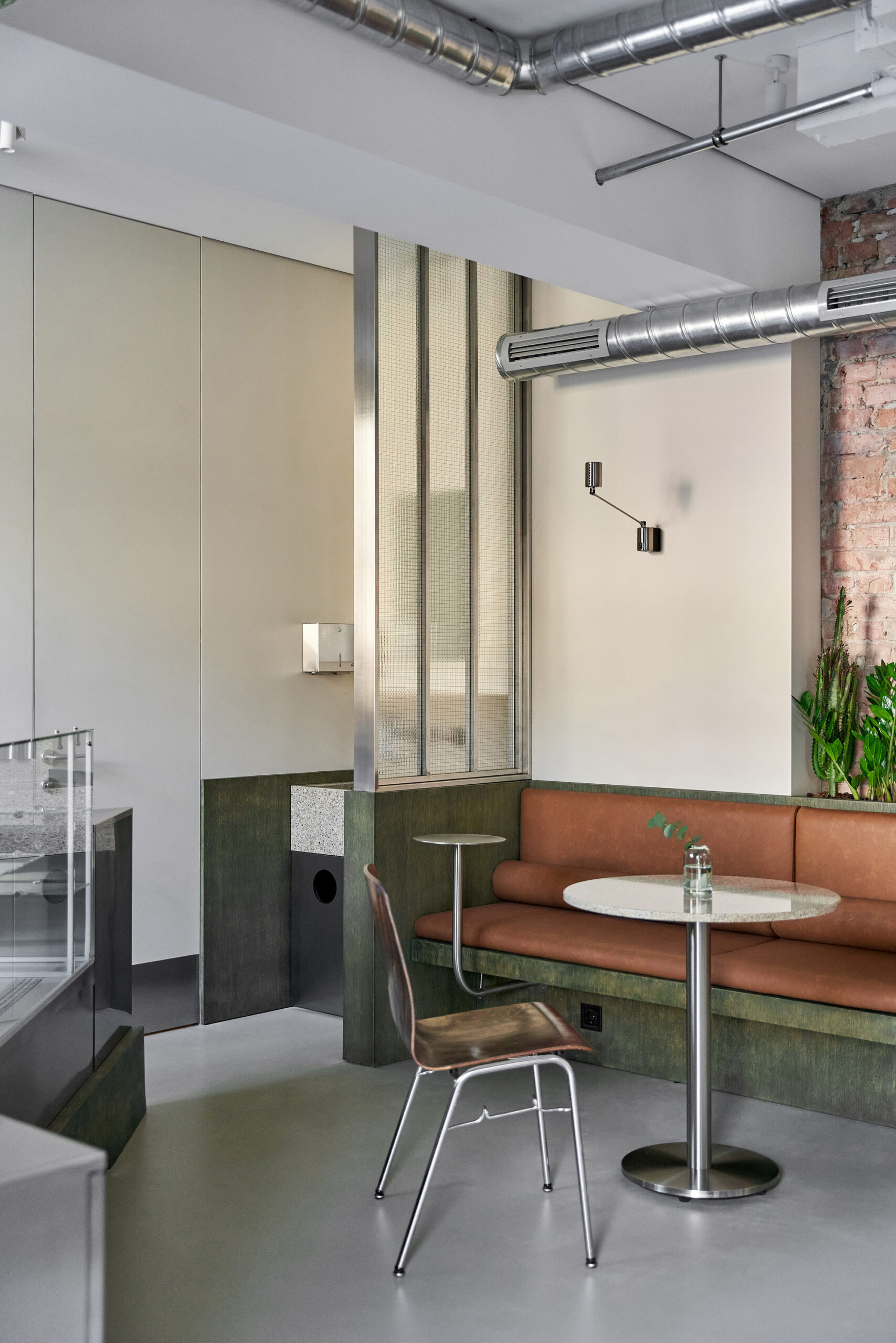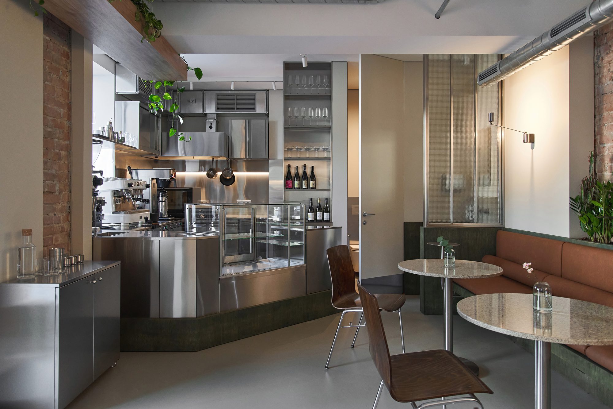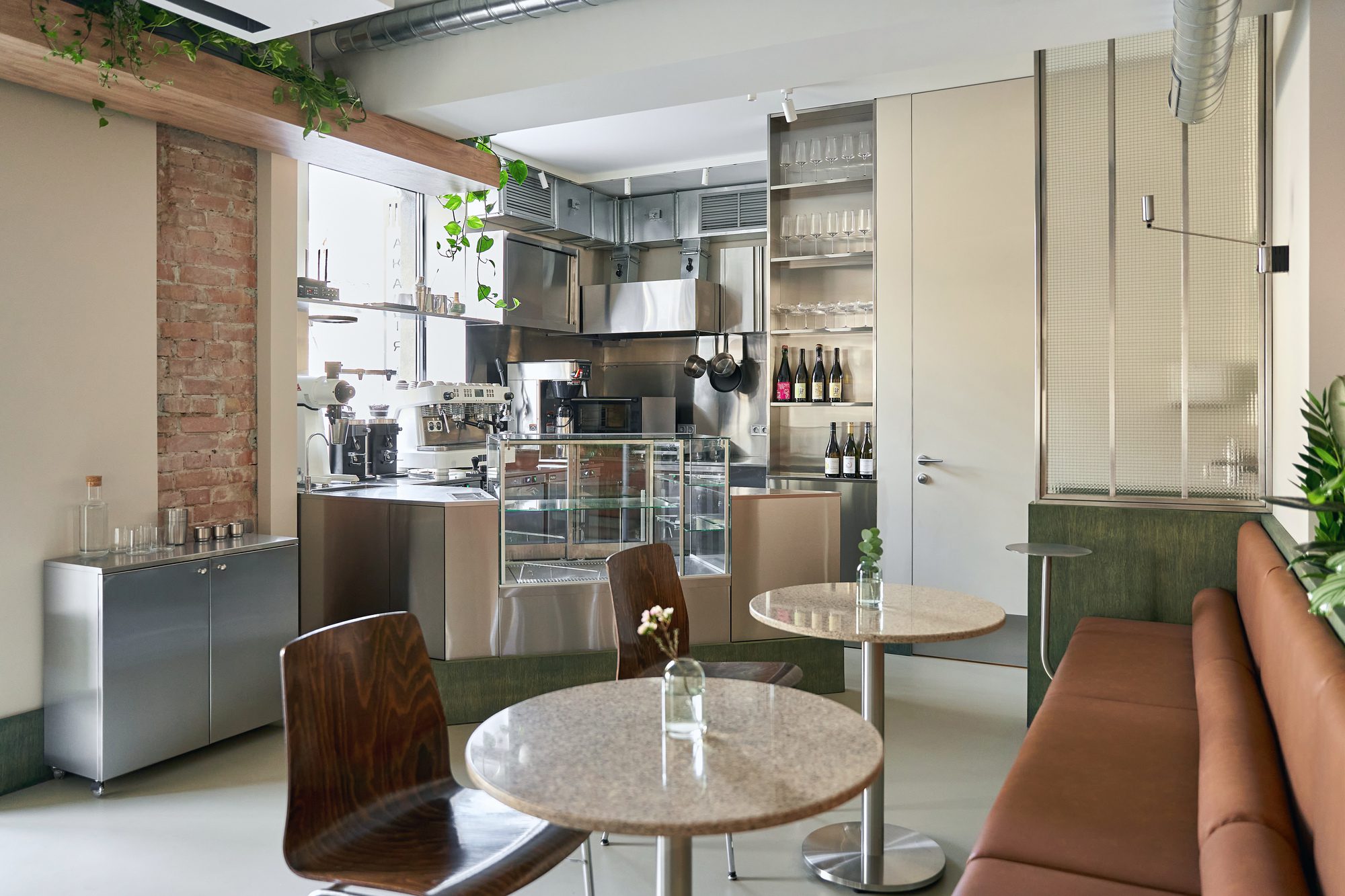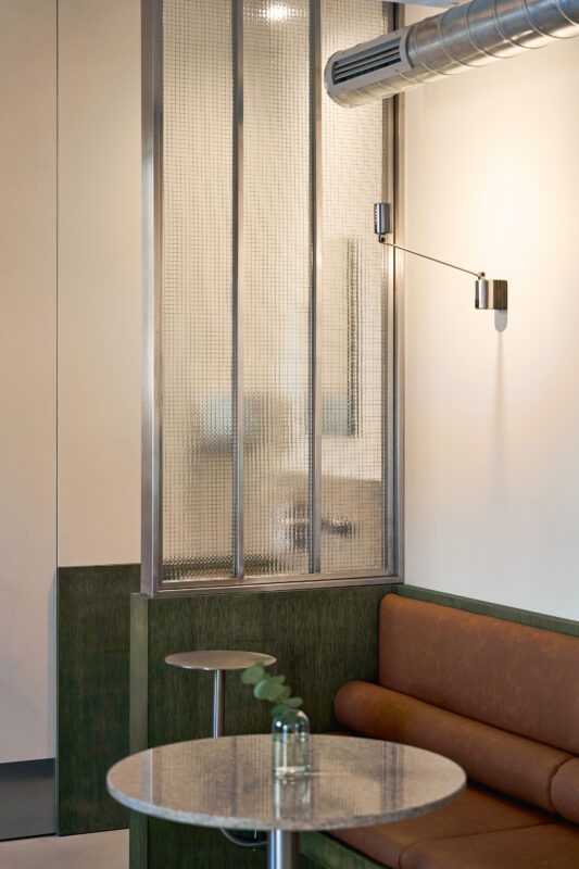 The design merges raw materials and delicate detailing: exposed old brick, brushed stainless steel, green-tinted oak veneer, and soft leather come together in a careful balance of industrial sharpness and tactile comfort. A light microcement floor, paired with beige-painted walls, reflects natural light and contributes to the overall softness and calmness of the space.