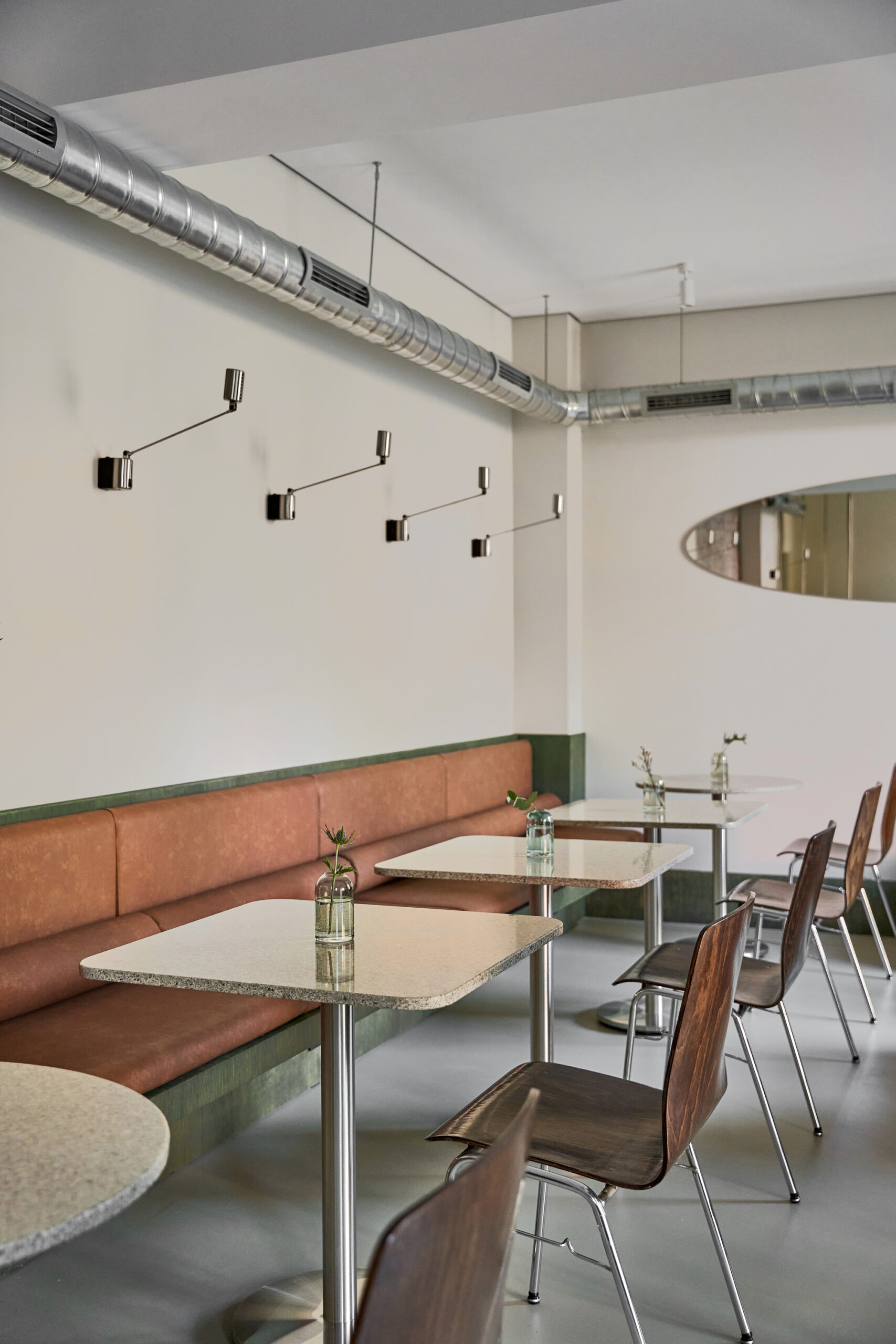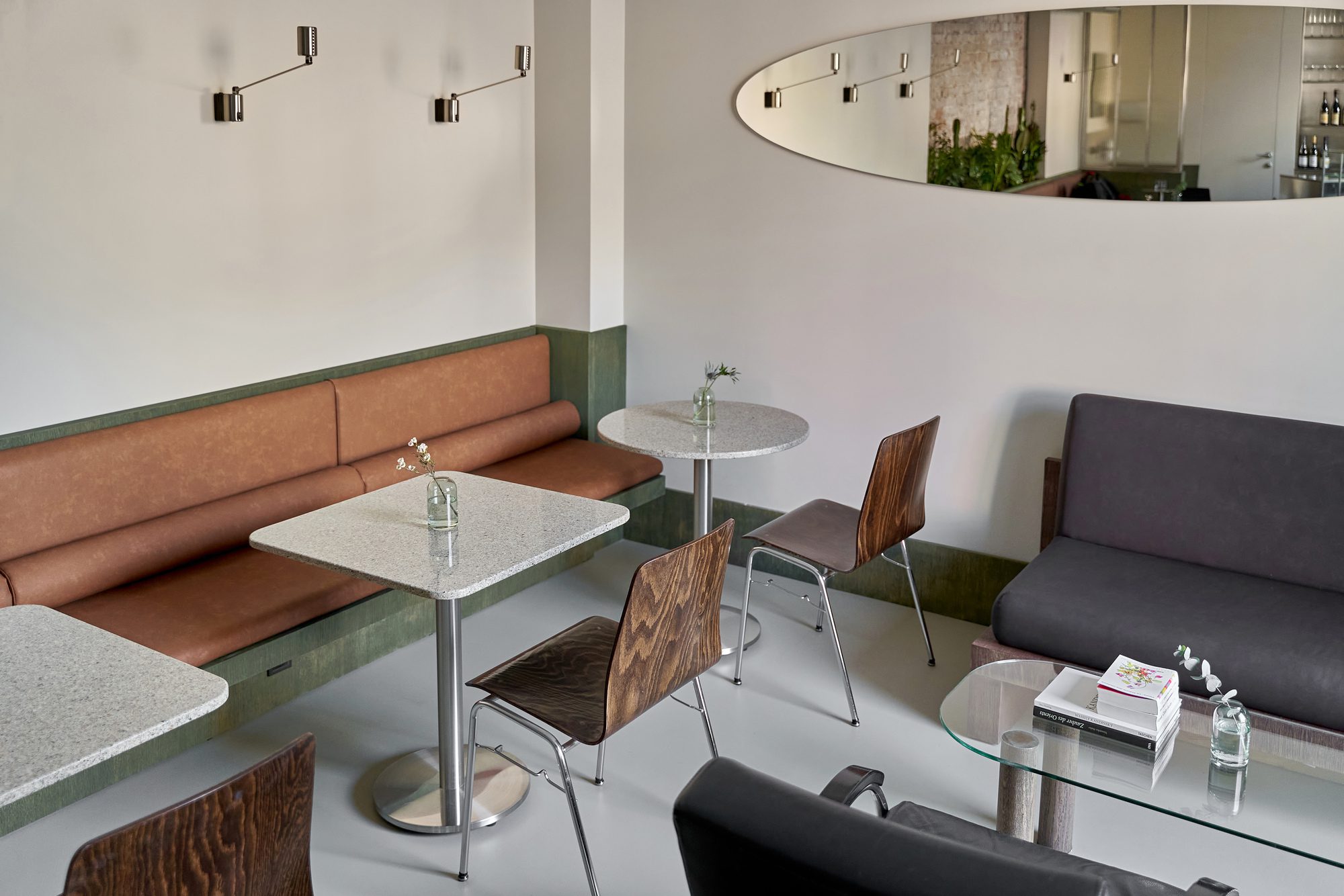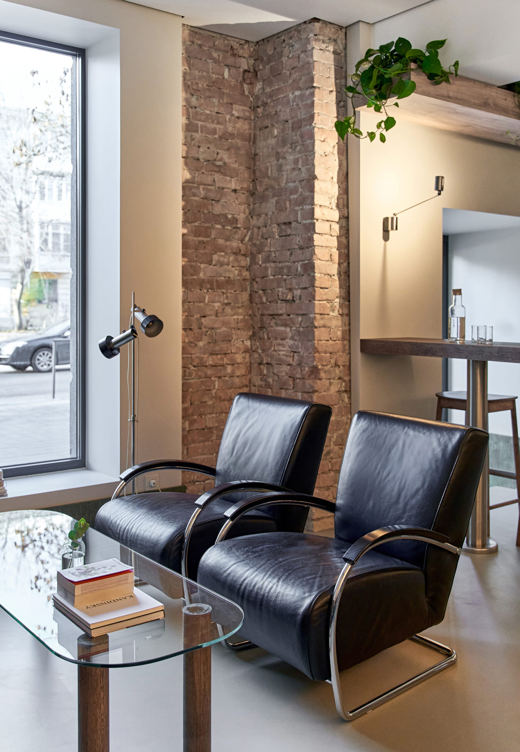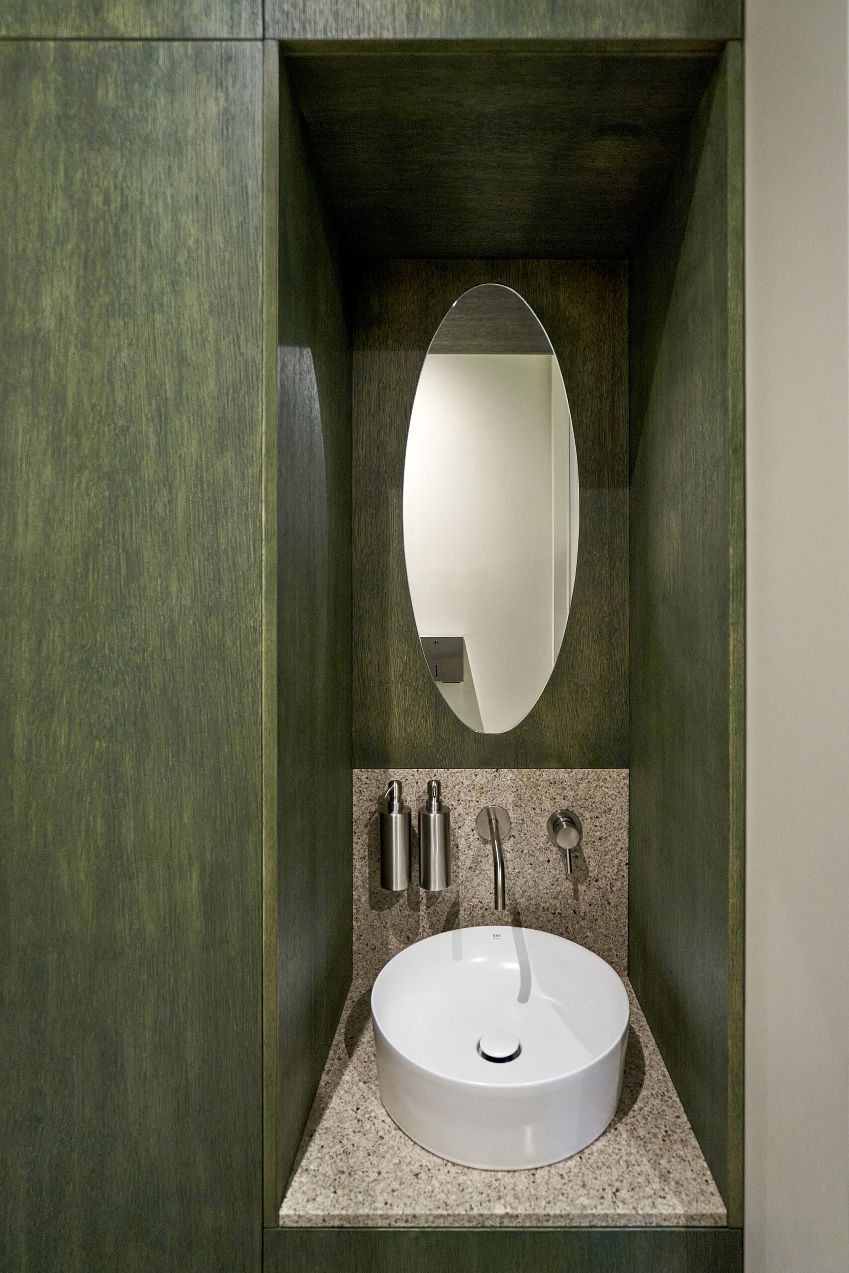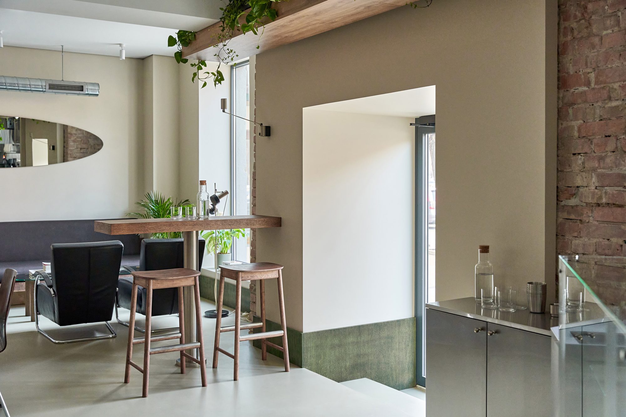 The design merges raw materials and delicate detailing: exposed old brick, brushed stainless steel, green-tinted oak veneer, and soft leather come together in a careful balance of industrial sharpness and tactile comfort. A light microcement floor, paired with beige-painted walls, reflects natural light and contributes to the overall softness and calmness of the space.