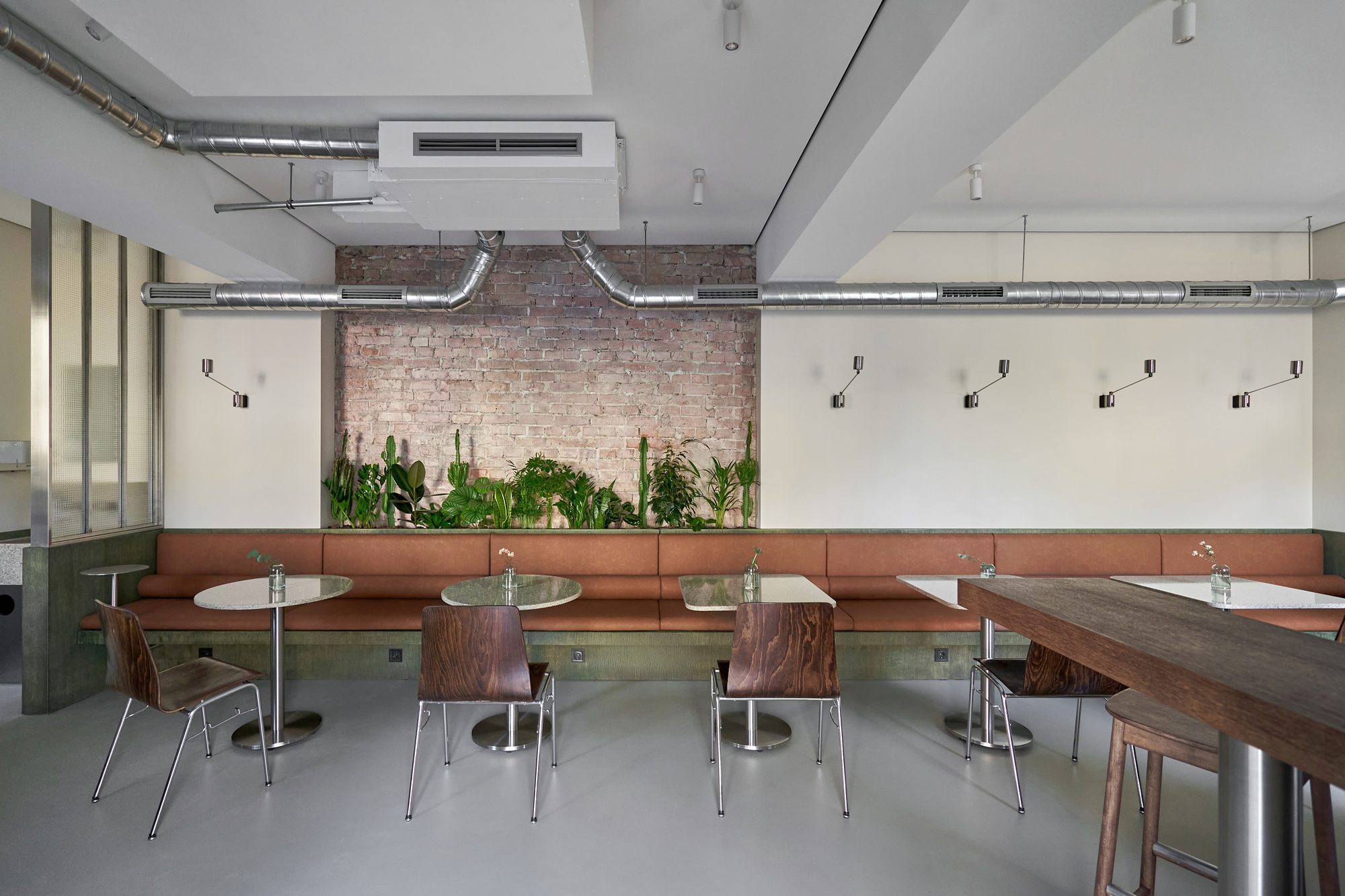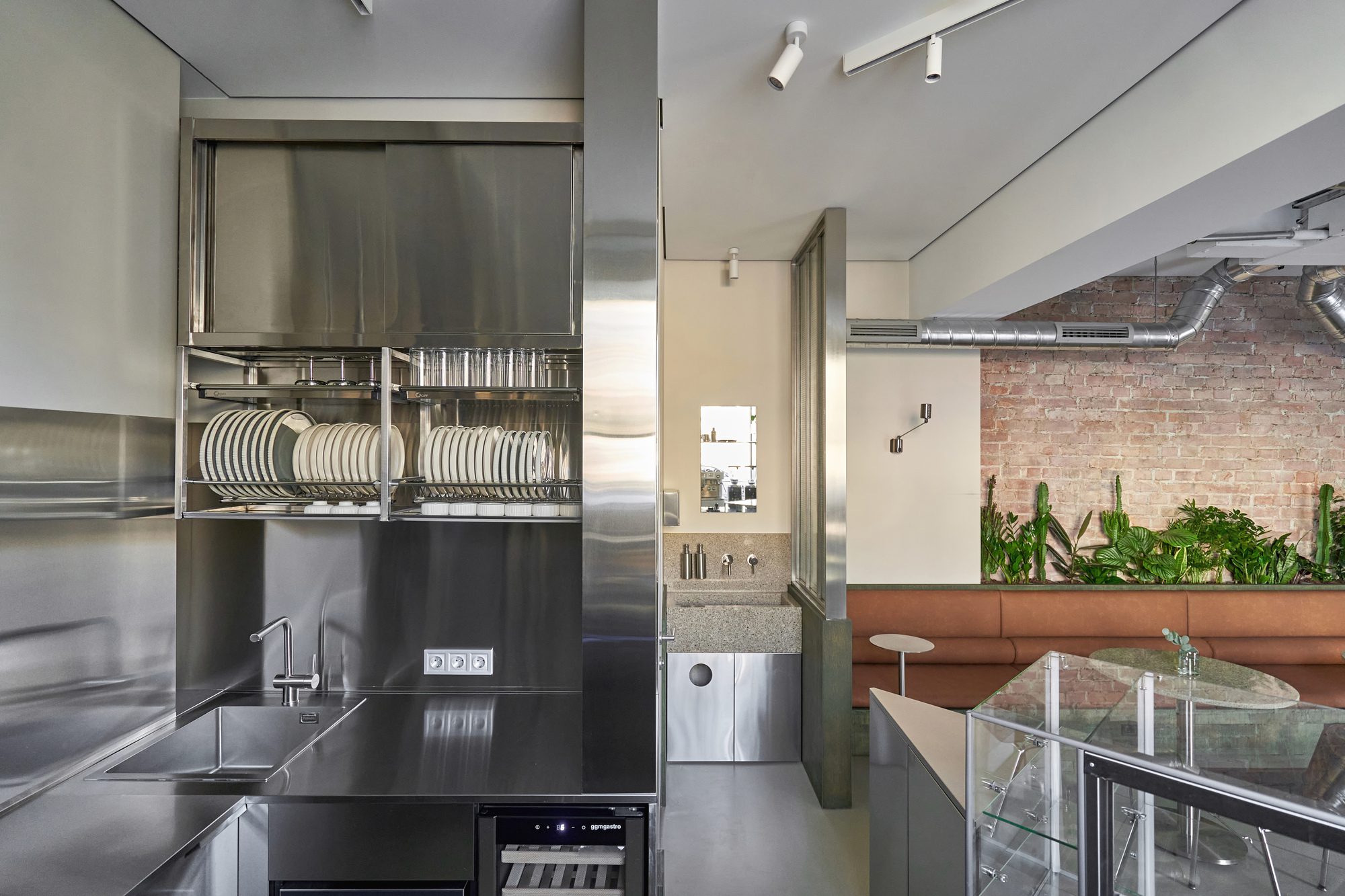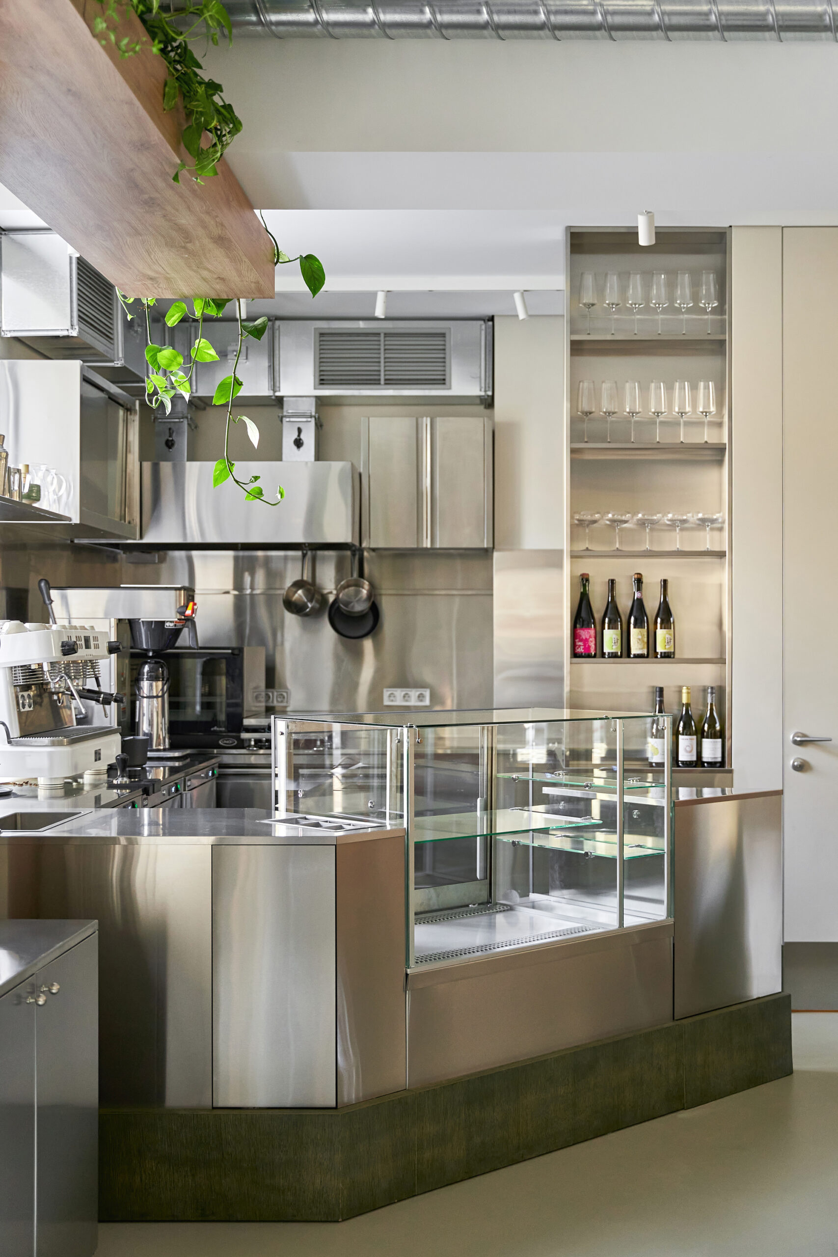 At the heart of the café is an open kitchen and bar made entirely of stainless steel, merging functionality with visual clarity. This single sculptural element anchors the space and invites visitors to witness the preparation process without intrusion.
