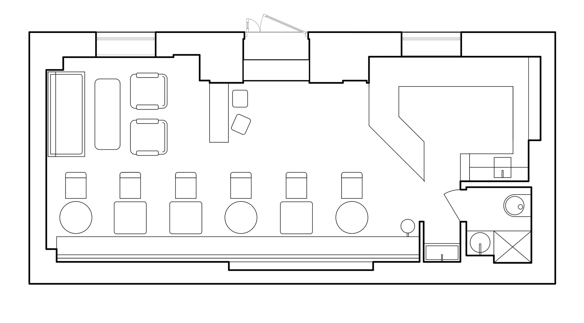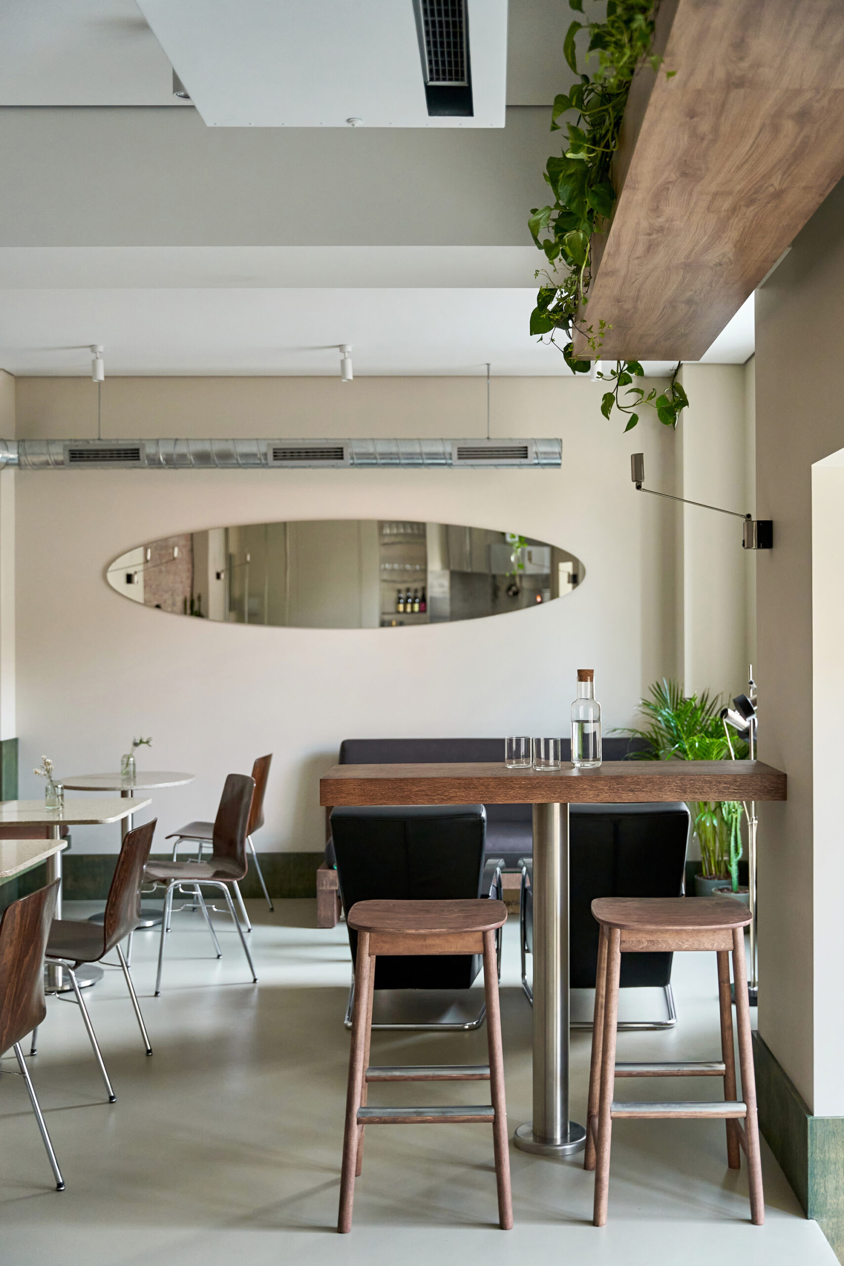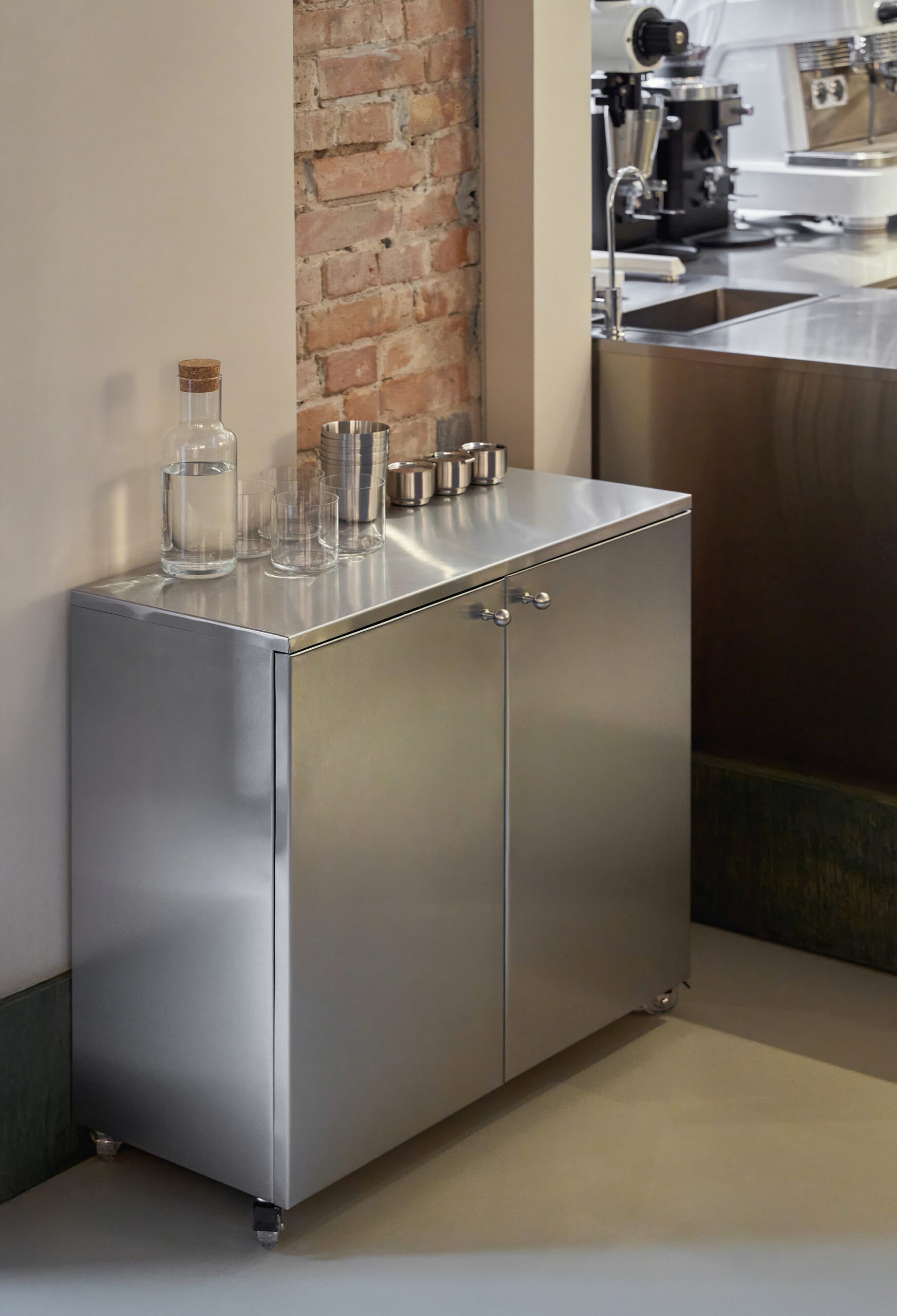 At the heart of the café is an open kitchen and bar made entirely of stainless steel, merging functionality with visual clarity. This single sculptural element anchors the space and invites visitors to witness the preparation process without intrusion.