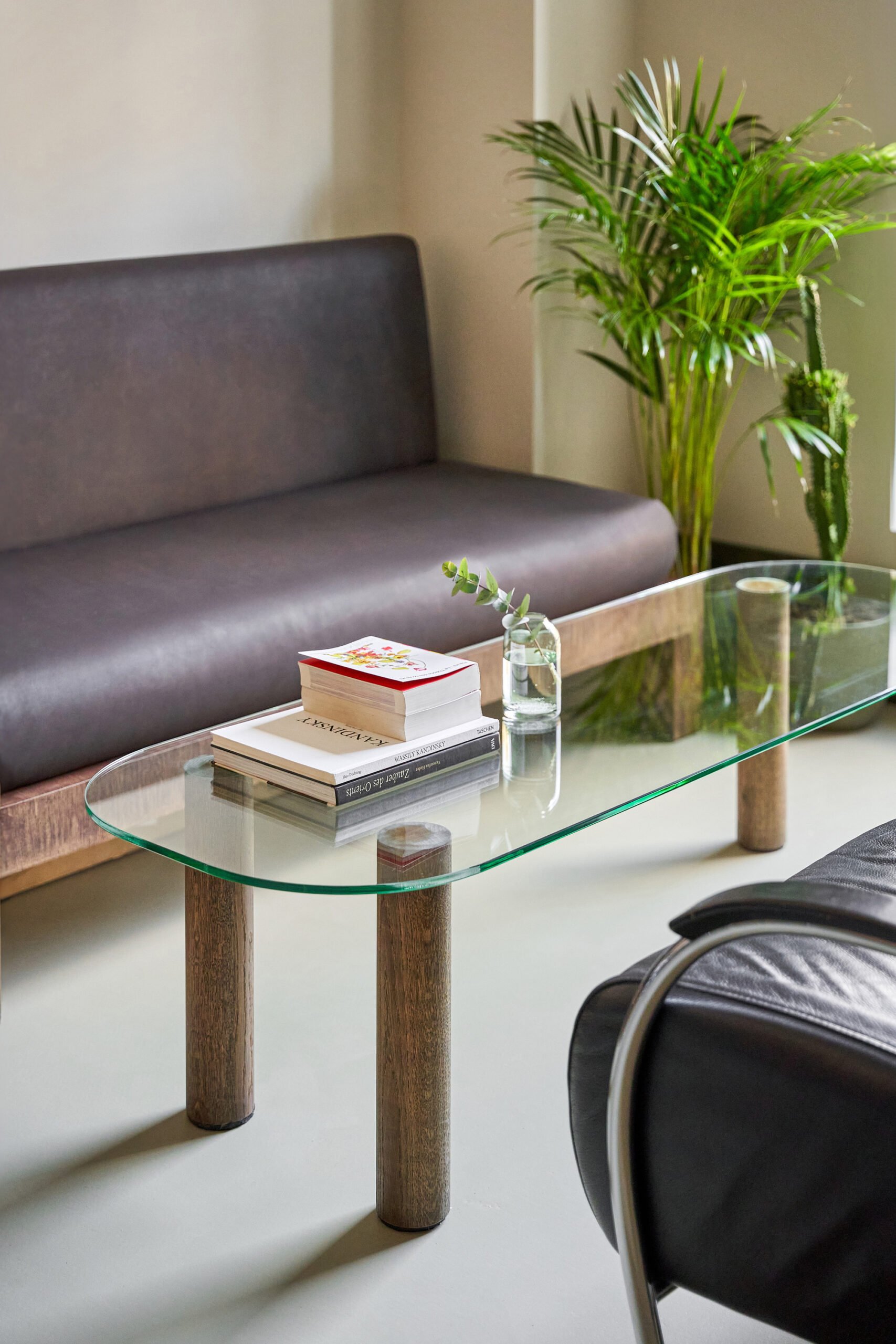 The furniture selection is deliberate and story-driven. Vintage leather armchairs, found in the Netherlands, and 1970s chairs from Germany bring patina and texture to the minimal setting. A bold oval mirror, custom metal shelves, and simple geometric forms add a sense of rhythm and structure. Lighting by Lumina highlights the spatial transitions and materials without overwhelming the composition.