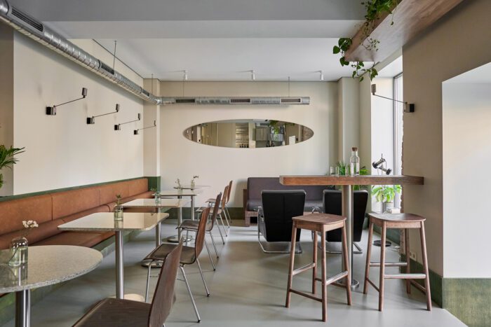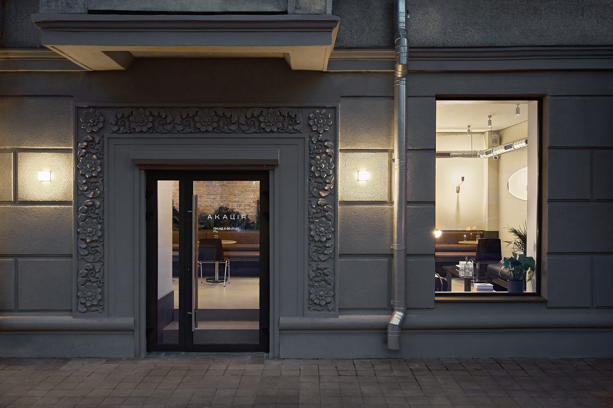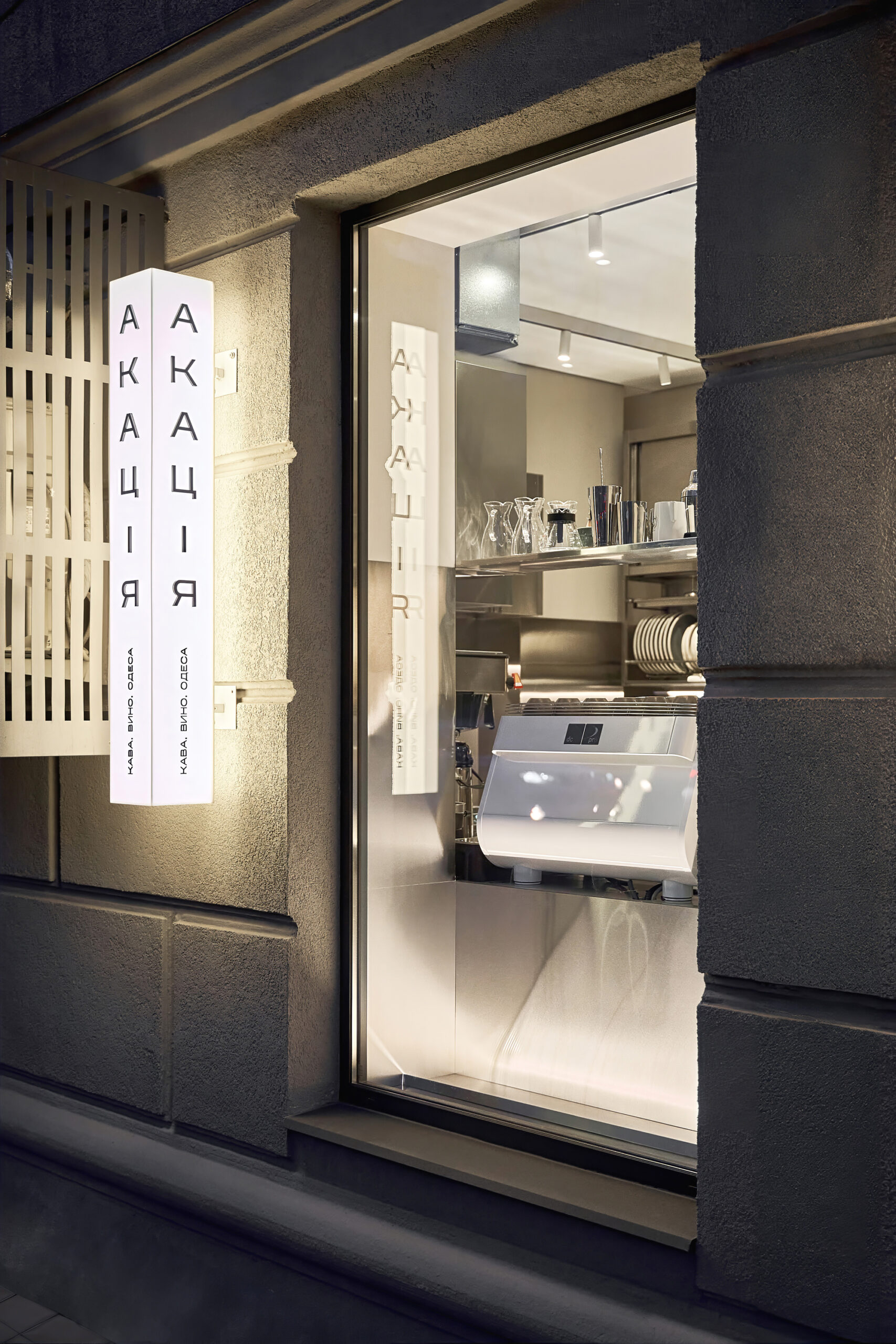 The name Acacia is a poetic reference to the acacia trees that line many streets in Odessa, a nod to the city’s southern identity and nostalgic charm. This atmosphere of quiet familiarity is echoed in the space’s visual language.