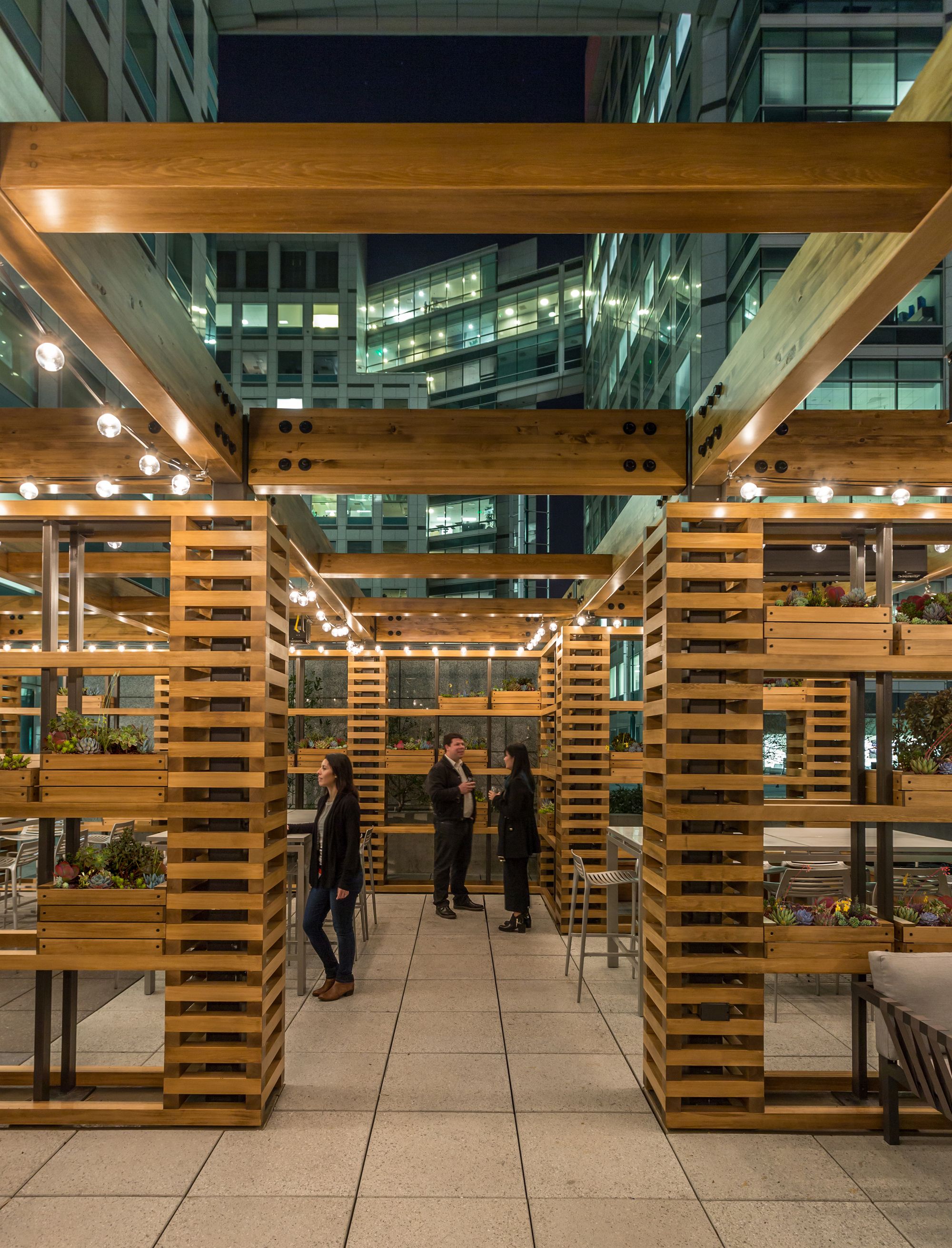 As downtown San Jose’s largest tech firm, the headquarters was designed to pay homage to both the city’s past and present. The city’s agricultural past is celebrated with an art installation that creates Adobe’s iconic “A” from locally sourced orchard crates. A custom-designed rooftop trellis creates an outside space that draws employees outside for ad hoc meetings or cocktails with the city’s skyline as the backdrop. Locally made rugs, furniture, and decorative pieces showcase the community’s artists and makers.