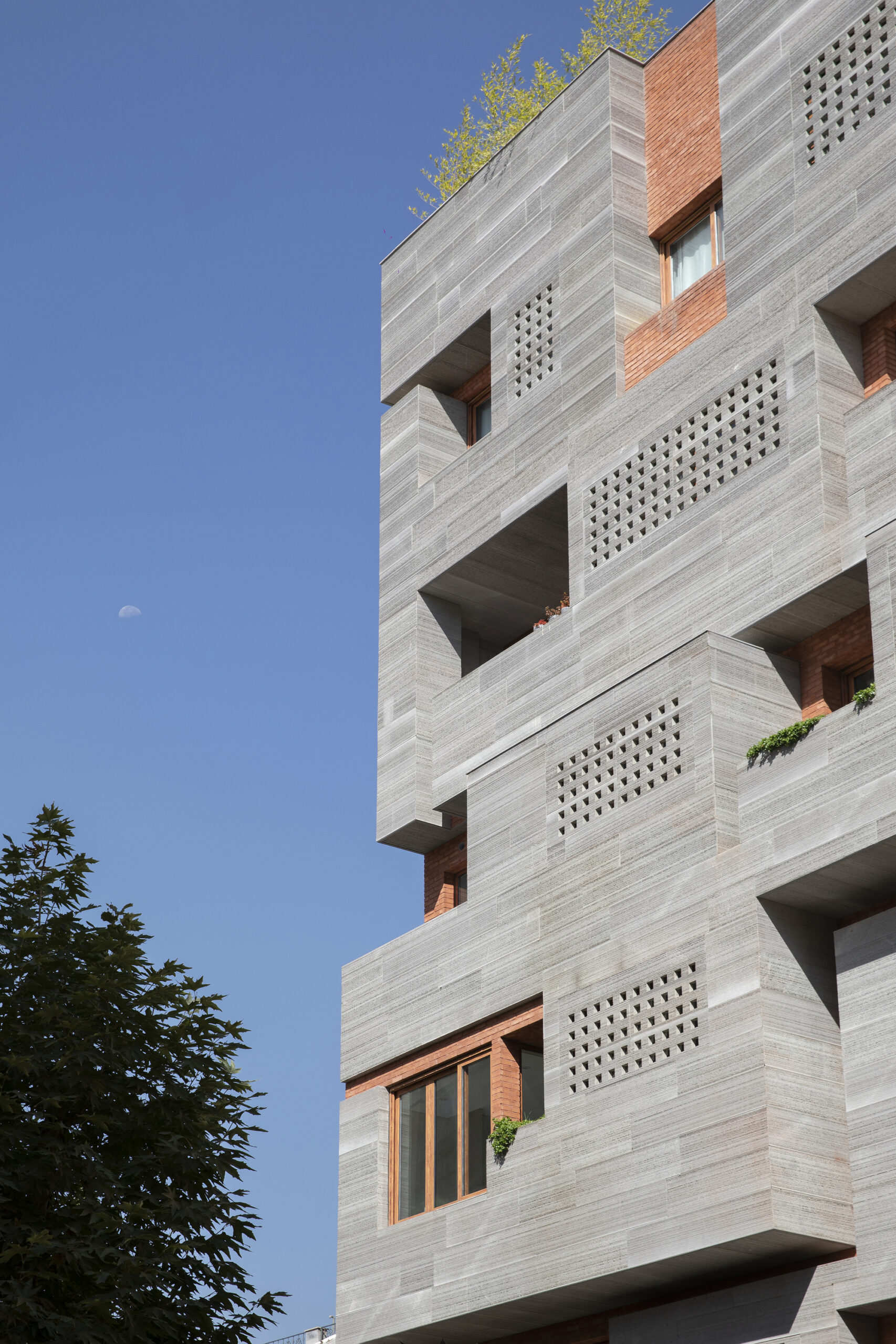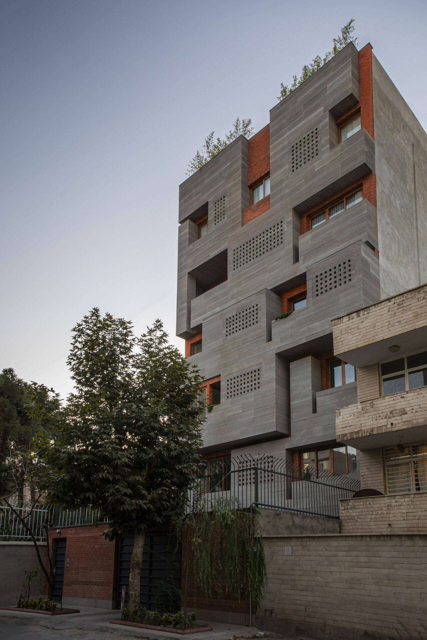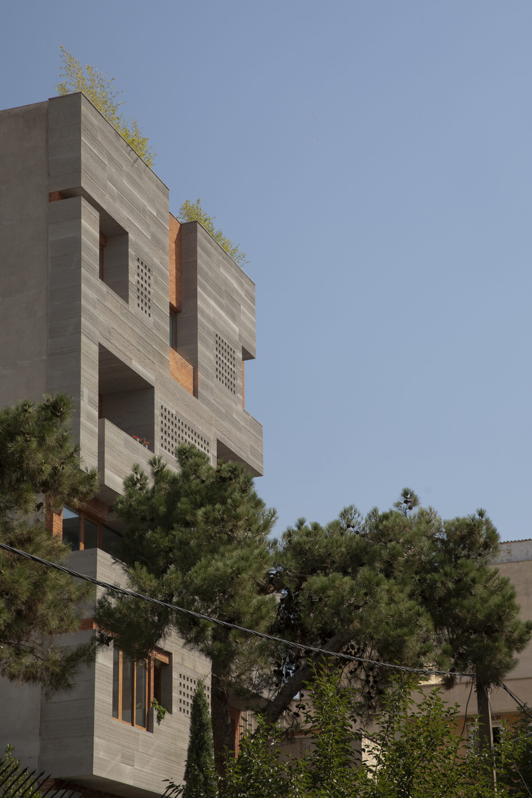 Afshar Residential Building, The Afshar family residential complex is located in the dense urban context of Tehran. Before the client offered us the project, the structure was ordered and almost ready to be fixed. We made some voids and revised the project in terms of the patio’s meaning. As parents, the clients wanted the complex to include three houses, One larger house for themselves and two houses for their children. On the first three floors, two duplex units are designed, and the two last levels are allocated to the parents, so a common neighborhood space was essential; meanwhile, the southern alley was not wide and unable to offer a spectacular view, which led to the formation of the most important architectural decision of the project: creating introverted houses neighboring each other with a strong connection with the northern yard.