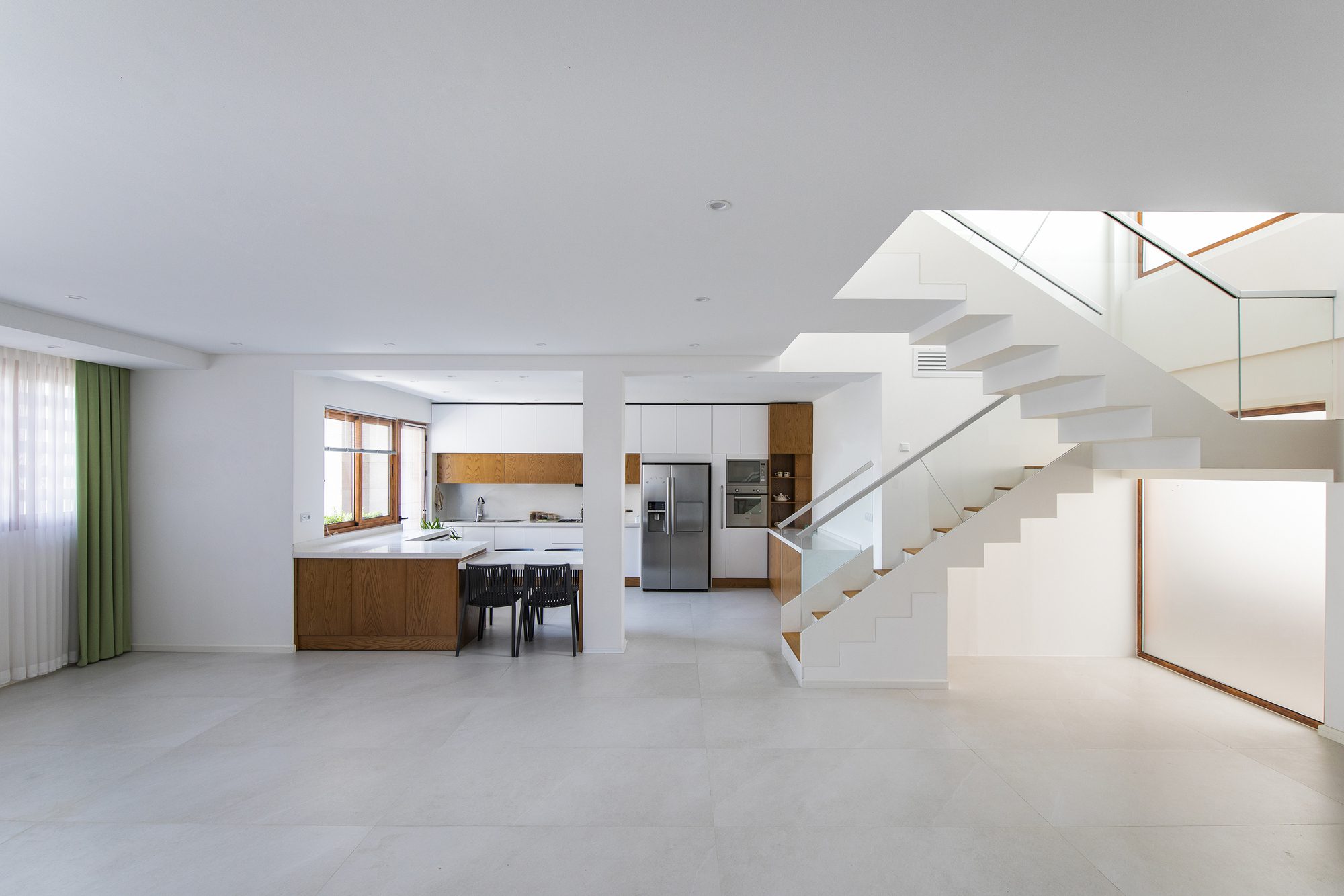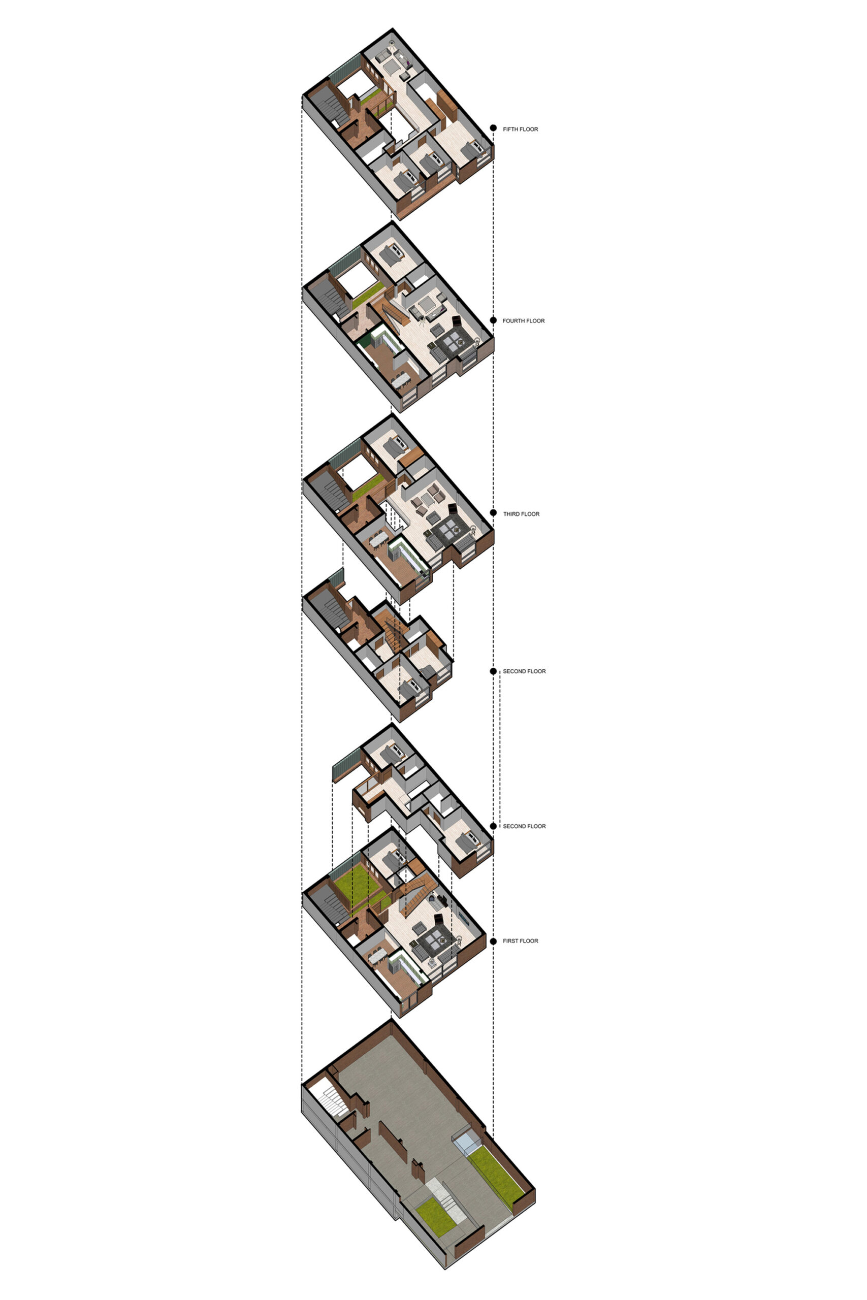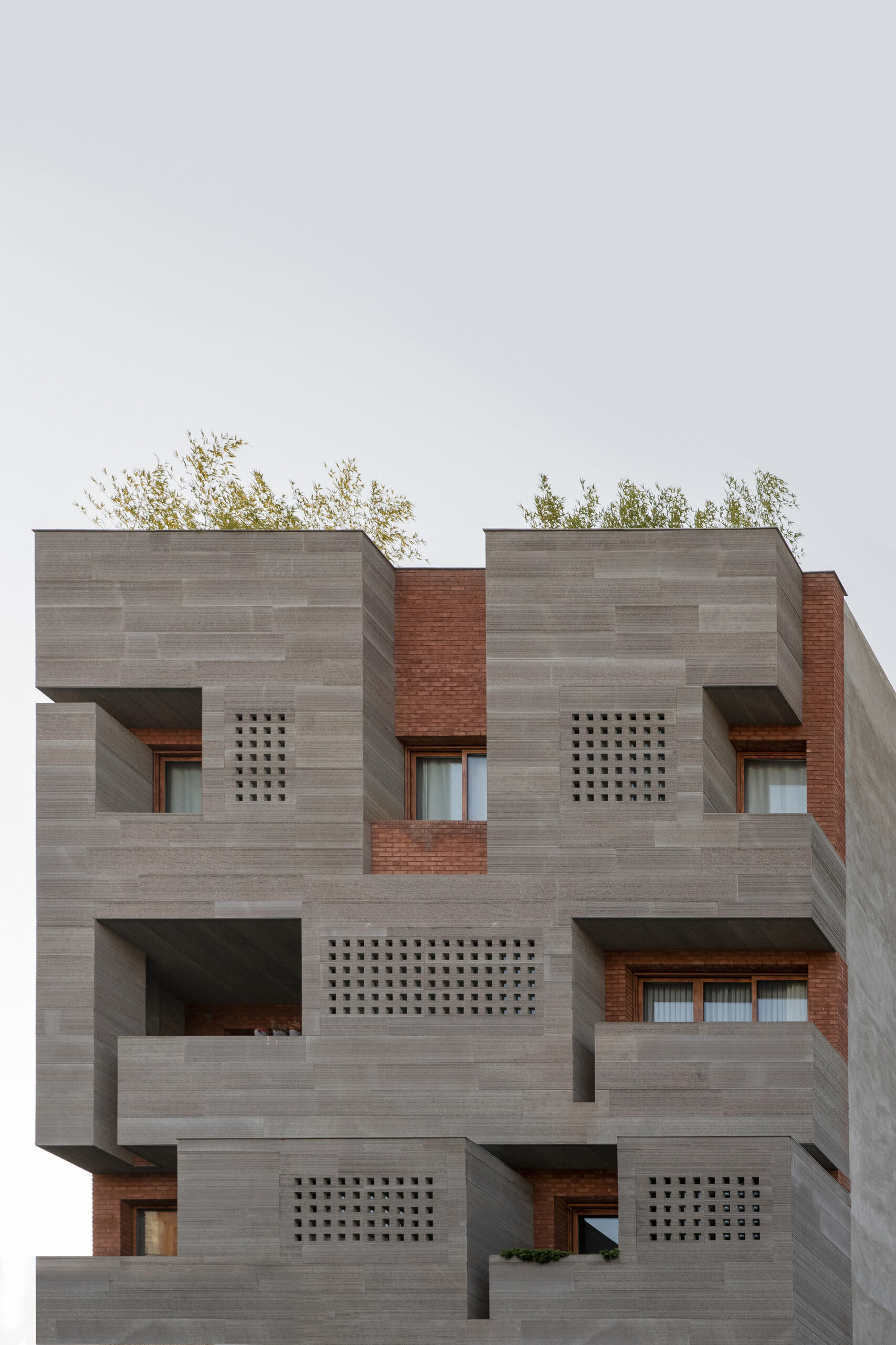 Afshar Residential Building, The Afshar family residential complex is located in the dense urban context of Tehran. Before the client offered us the project, the structure was ordered and almost ready to be fixed. We made some voids and revised the project in terms of the patio’s meaning. As parents, the clients wanted the complex to include three houses, One larger house for themselves and two houses for their children. On the first three floors, two duplex units are designed, and the two last levels are allocated to the parents, so a common neighborhood space was essential; meanwhile, the southern alley was not wide and unable to offer a spectacular view, which led to the formation of the most important architectural decision of the project: creating introverted houses neighboring each other with a strong connection with the northern yard.