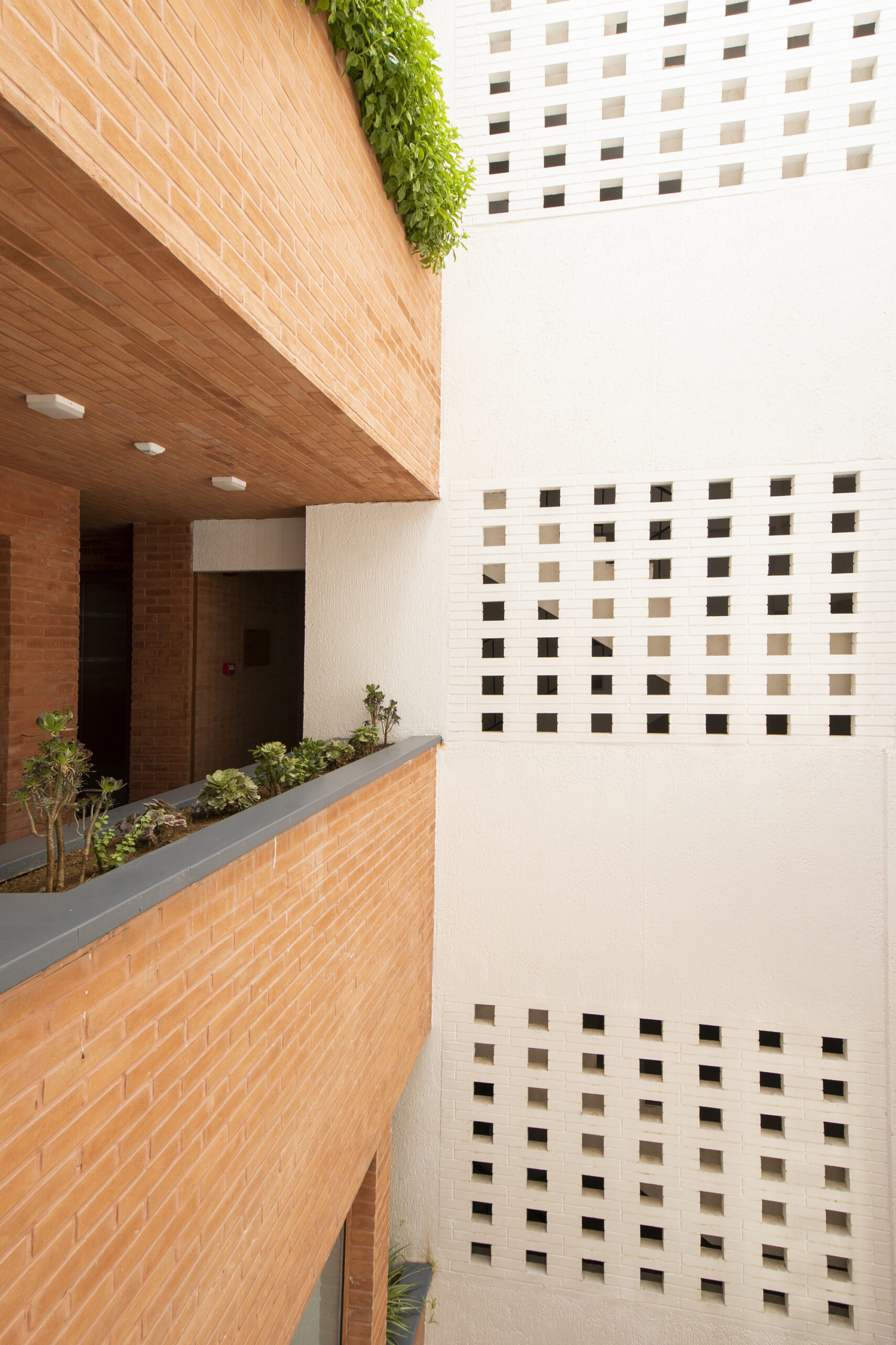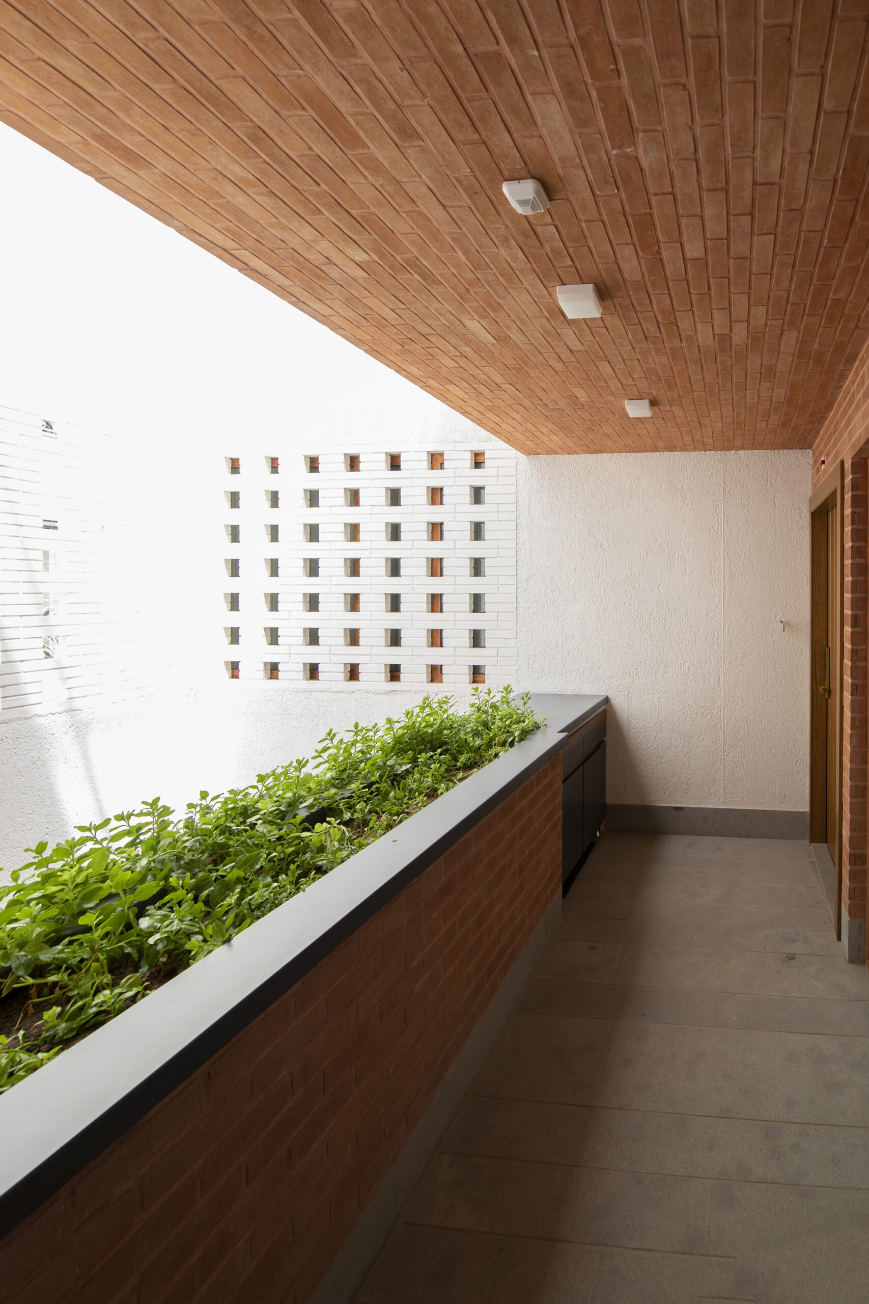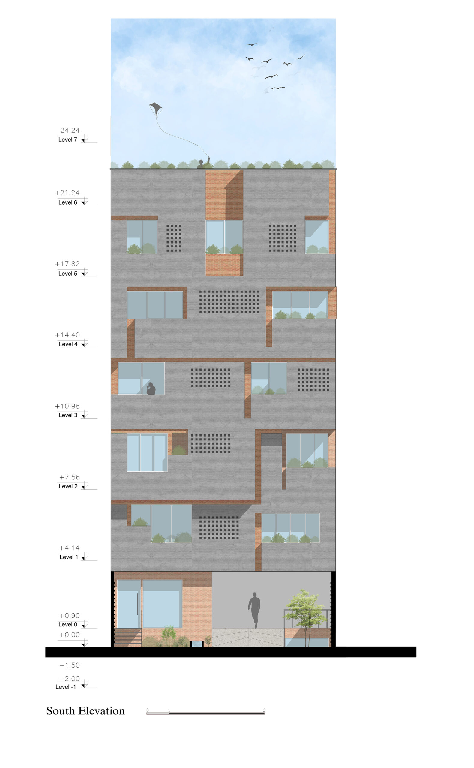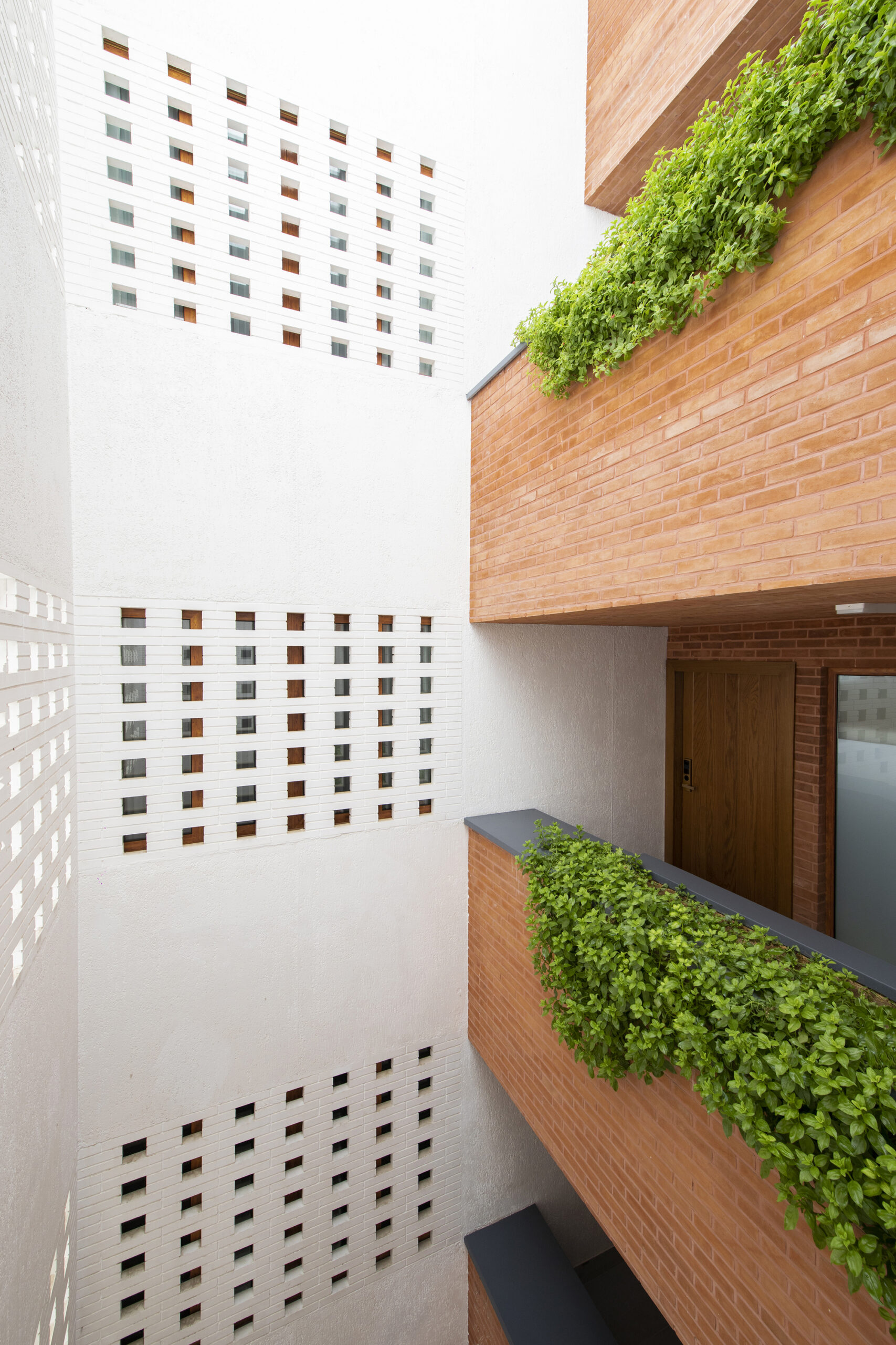 The project faces a common neighborhood space that is hidden from the view of the southern alley, which means the units use the south side only to benefit from the south light but in terms of quality, they have turned towards an inner yard that offers most of the interior spaces a view. A brick-mesh wall is between the yard and the staircase, and each floor’s semi-open entrance makes this inner yard easily accessible for all levels.