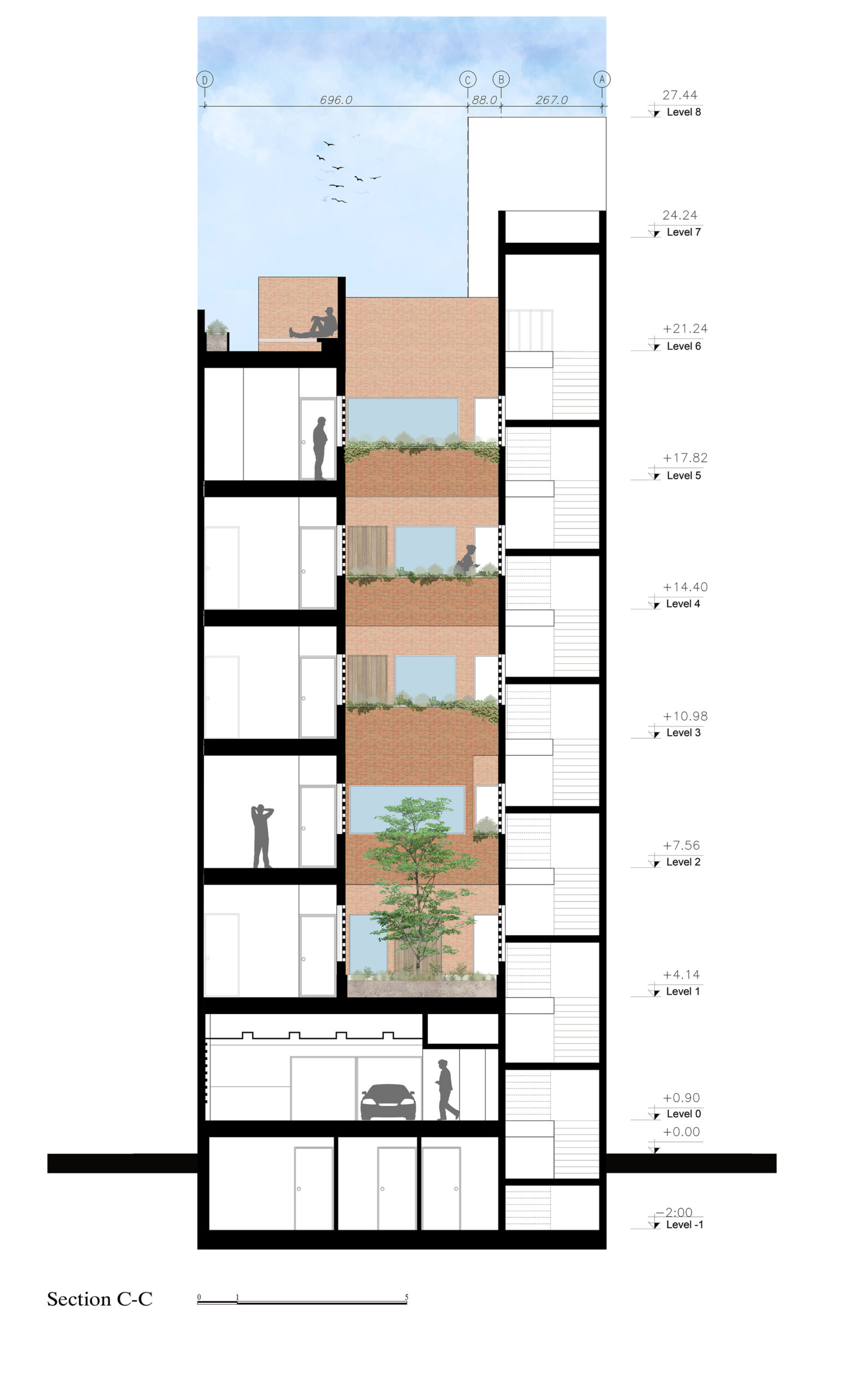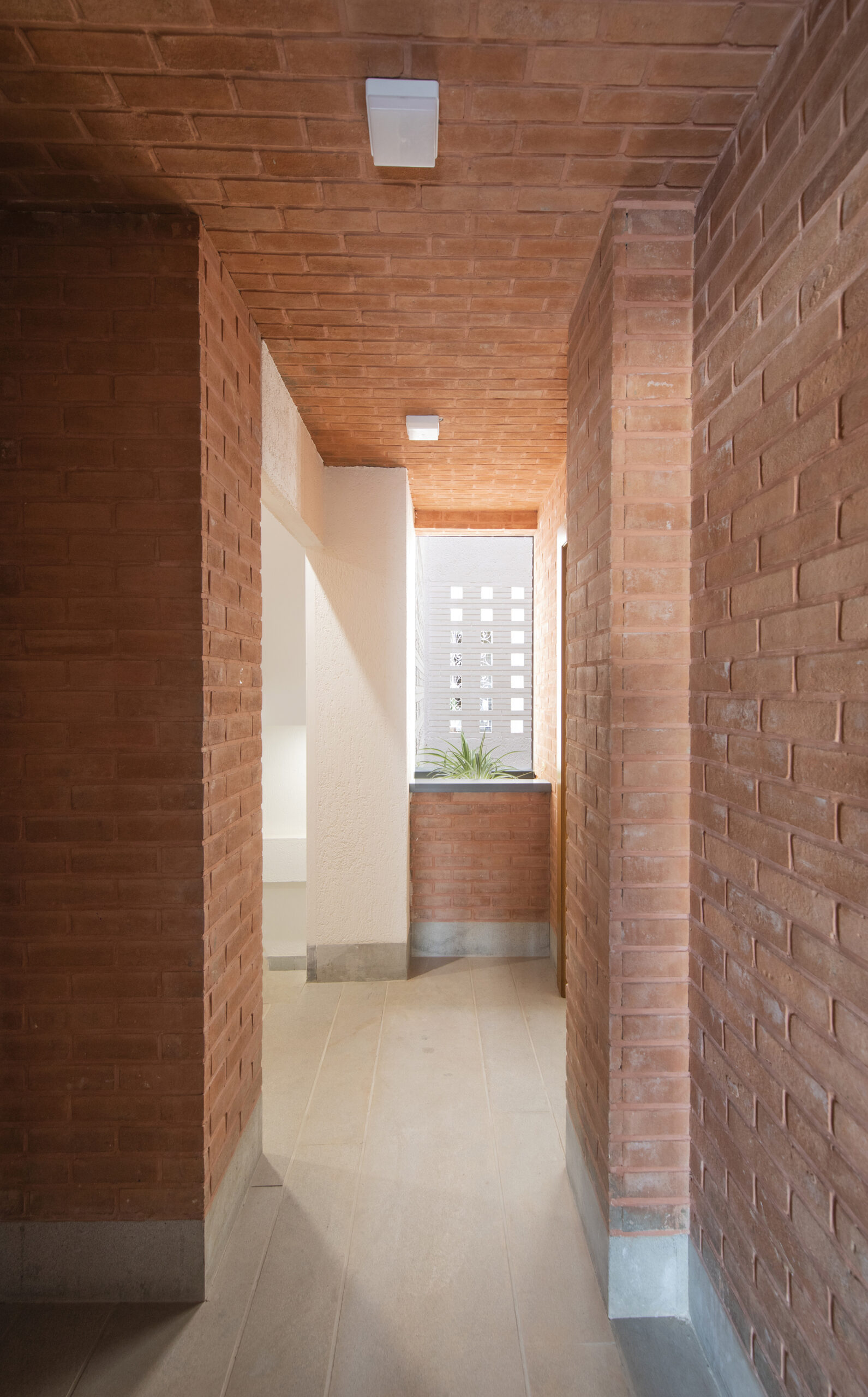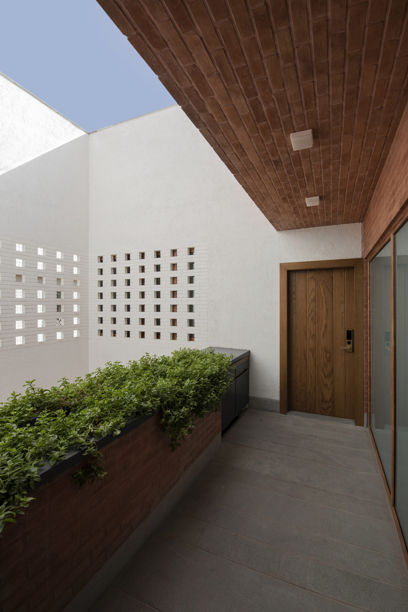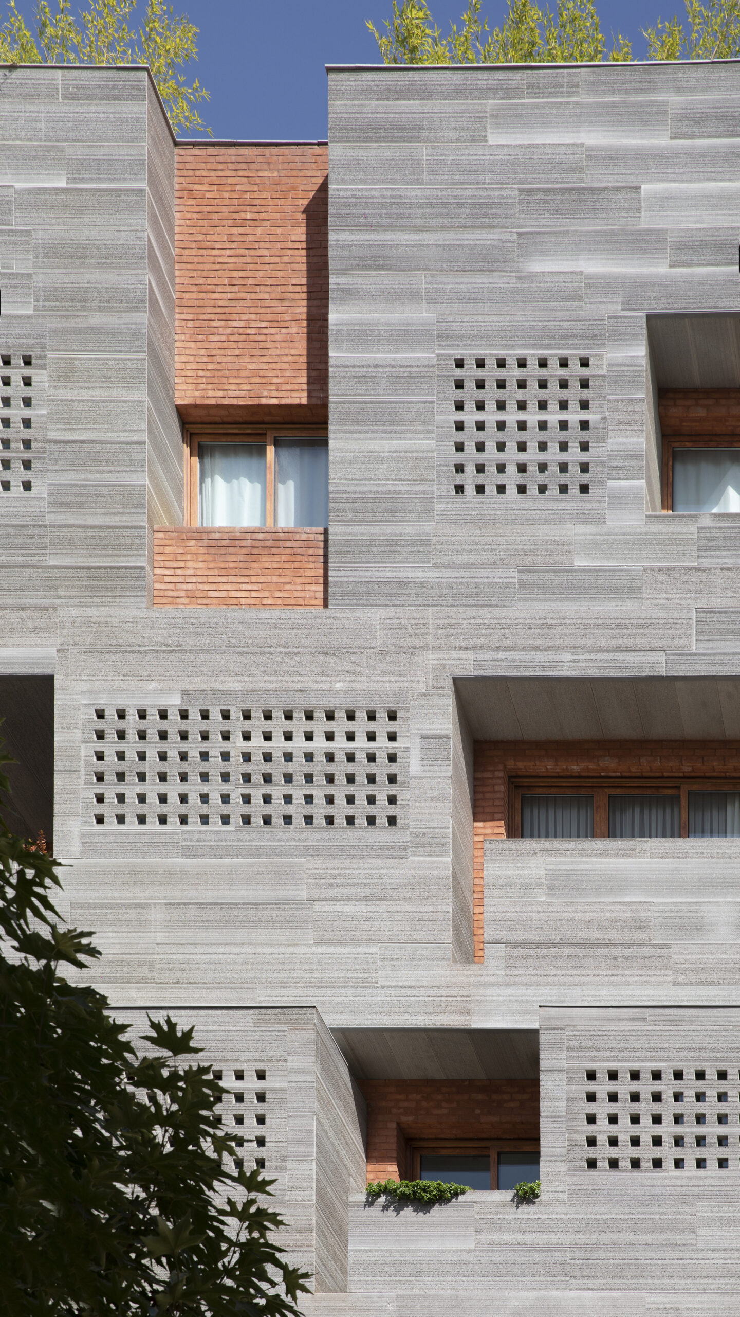 The project faces a common neighborhood space that is hidden from the view of the southern alley, which means the units use the south side only to benefit from the south light but in terms of quality, they have turned towards an inner yard that offers most of the interior spaces a view. A brick-mesh wall is between the yard and the staircase, and each floor’s semi-open entrance makes this inner yard easily accessible for all levels.